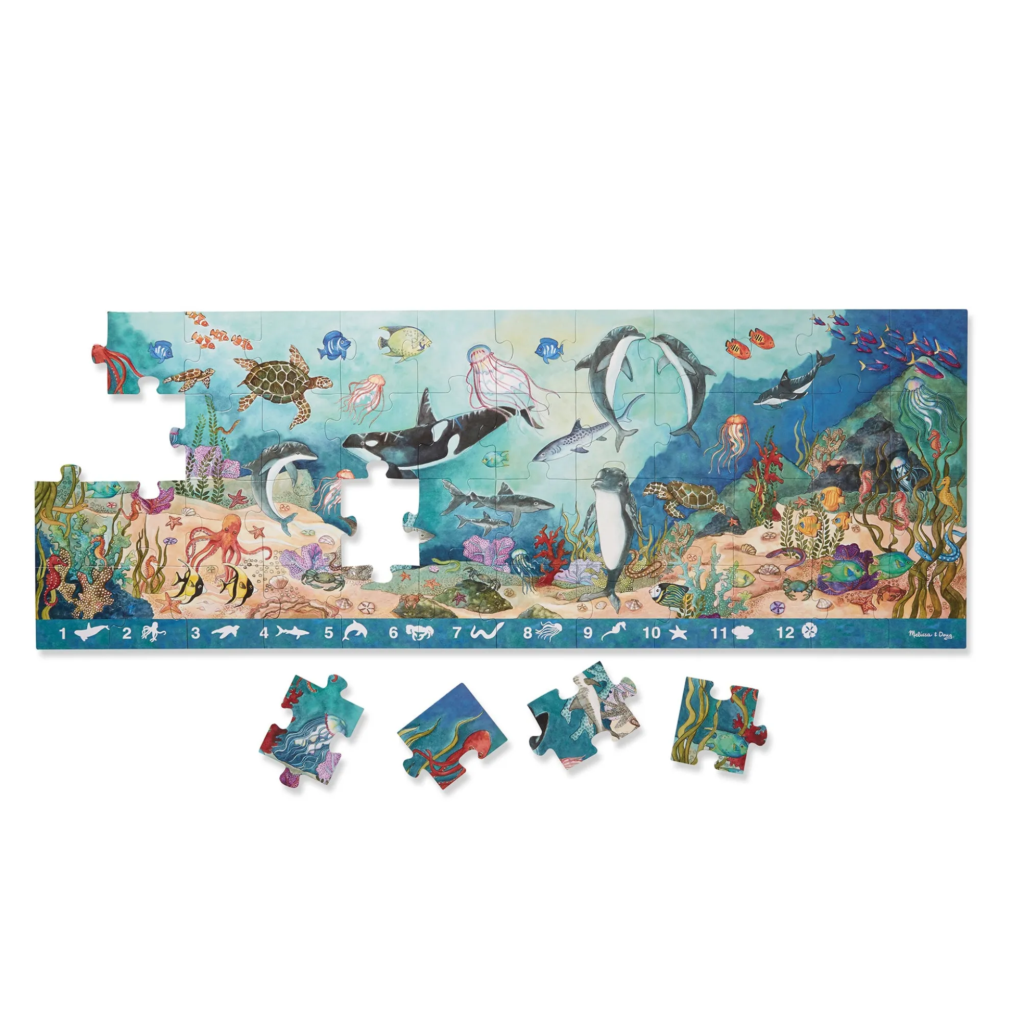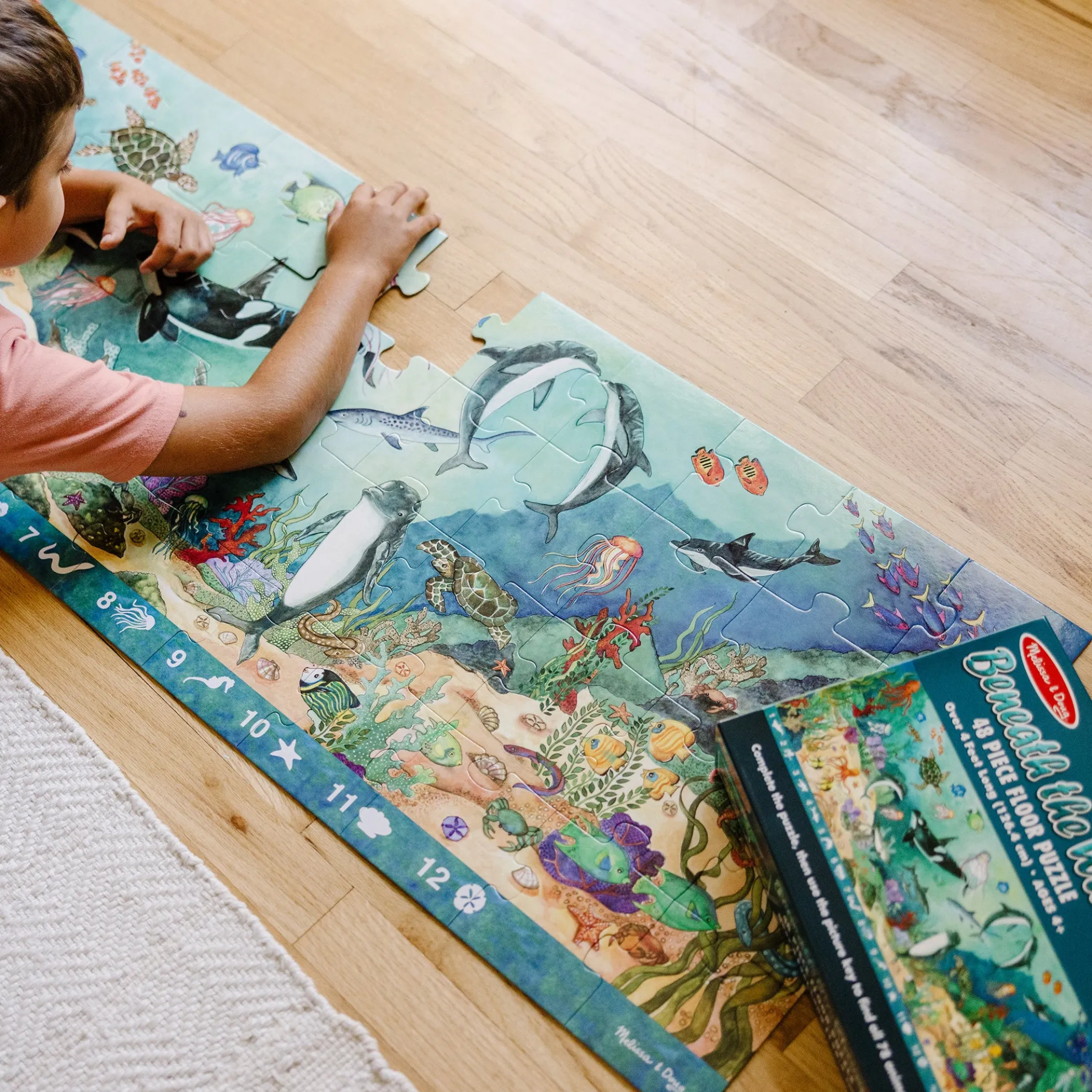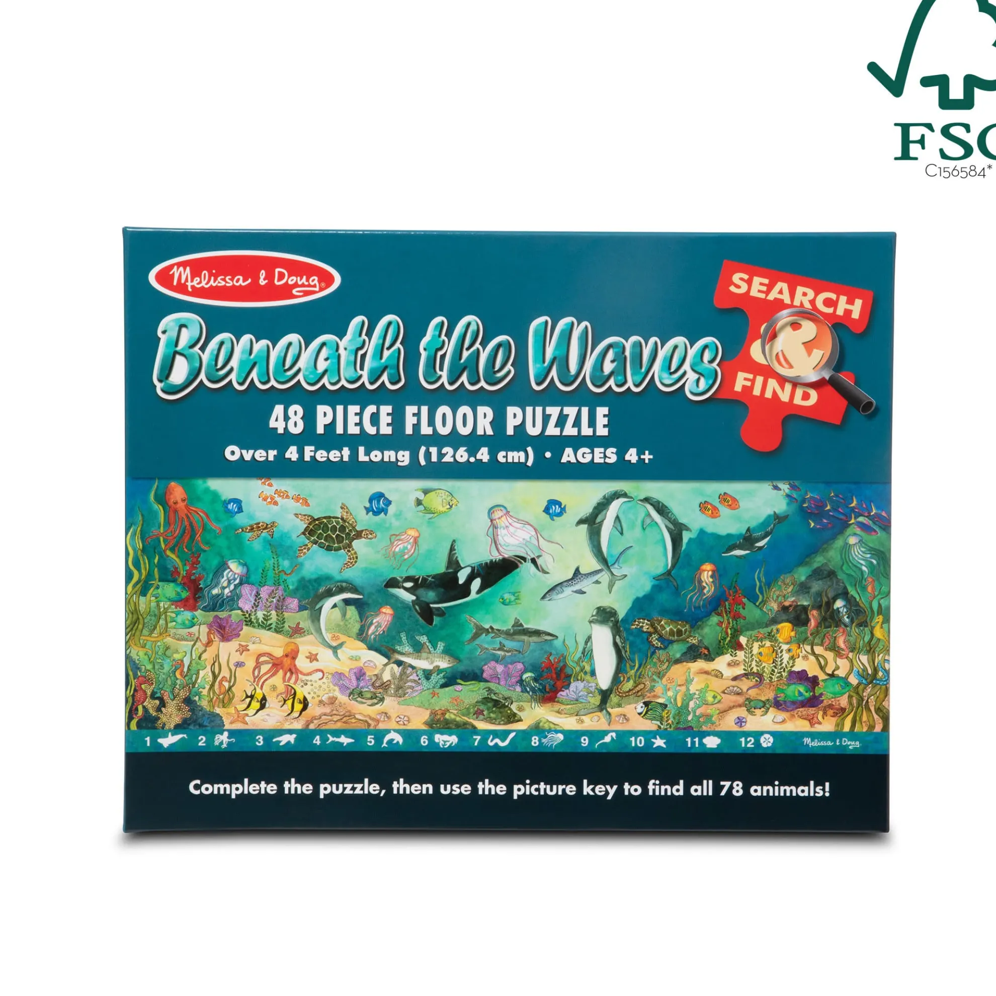 This jumbo search-and-find puzzle offers an extra activity when completed! The Beneath the Waves floor puzzle features 48 pieces that assemble to reveal a stunning underwater scene filled with animals to spot and count. The puzzle measures over four feet long when it’s assembled, and the 48 extra-thick cardboard pieces feature an easy-to-clean surface to keep it looking like new. A visual picture list is printed right on the puzzle, encouraging kids to do counting games and picture-search activities with no reading required. Playing with this puzzle is a great way for kids to explore the hidden world under the ocean while developing their cognitive, physical, and emotional skills. When children work on puzzles, they are fine-tuning their gross motor skills, improving their hand-eye coordination, strengthening their problem-solving skills, and beginning to develop logic and critical thinking processes. This Melissa & Doug puzzle makes an exceptional gift for preschoolers and kids ages four and older for hands-on, screen-free play. This product is certified by the Forest Stewardship Council. FSC certification ensures that products come from responsibly managed forests that provide environmental, social, and economic benefits, and that forests are protected for future generations. Please note that FSC certification applies to new inventory only (FSC C156584).