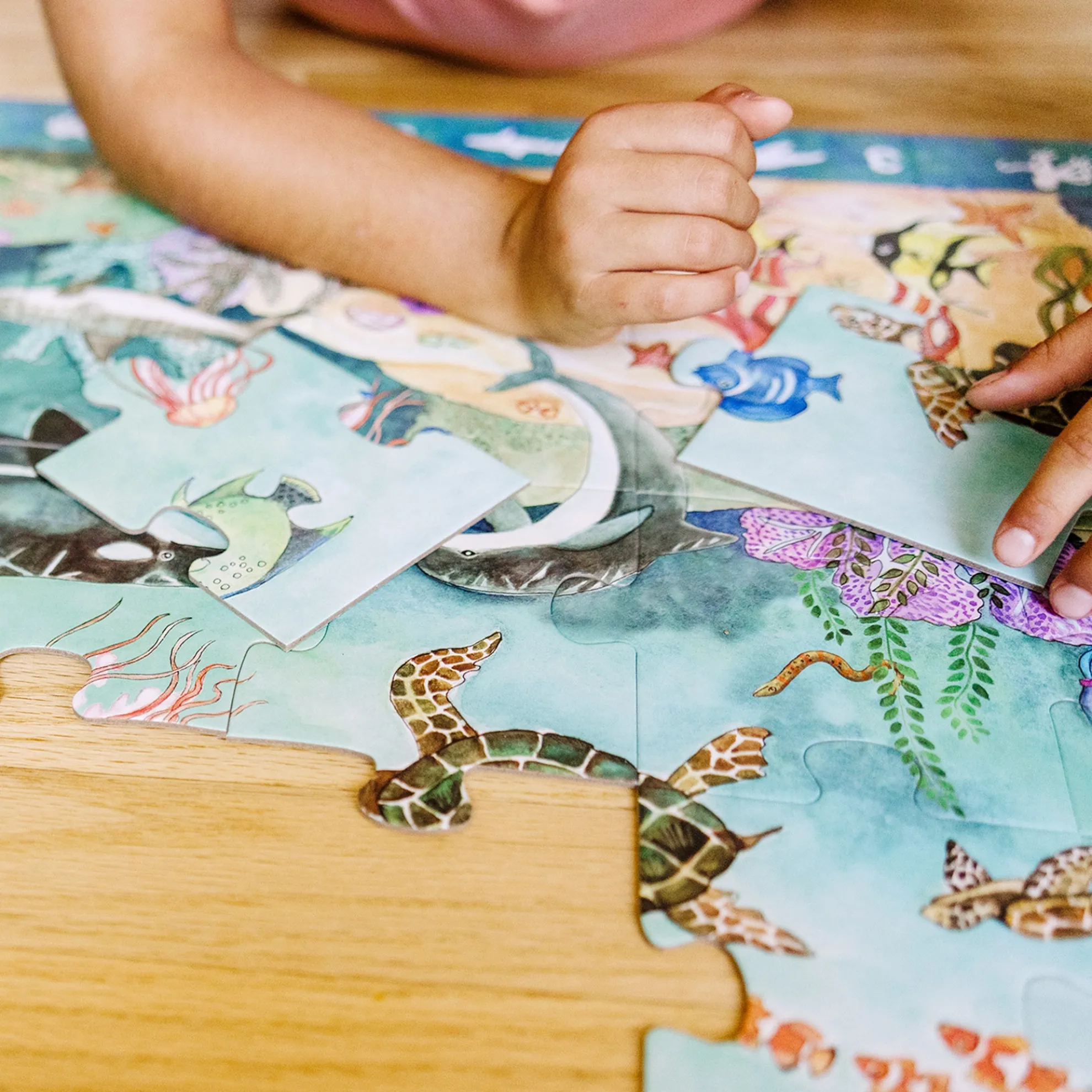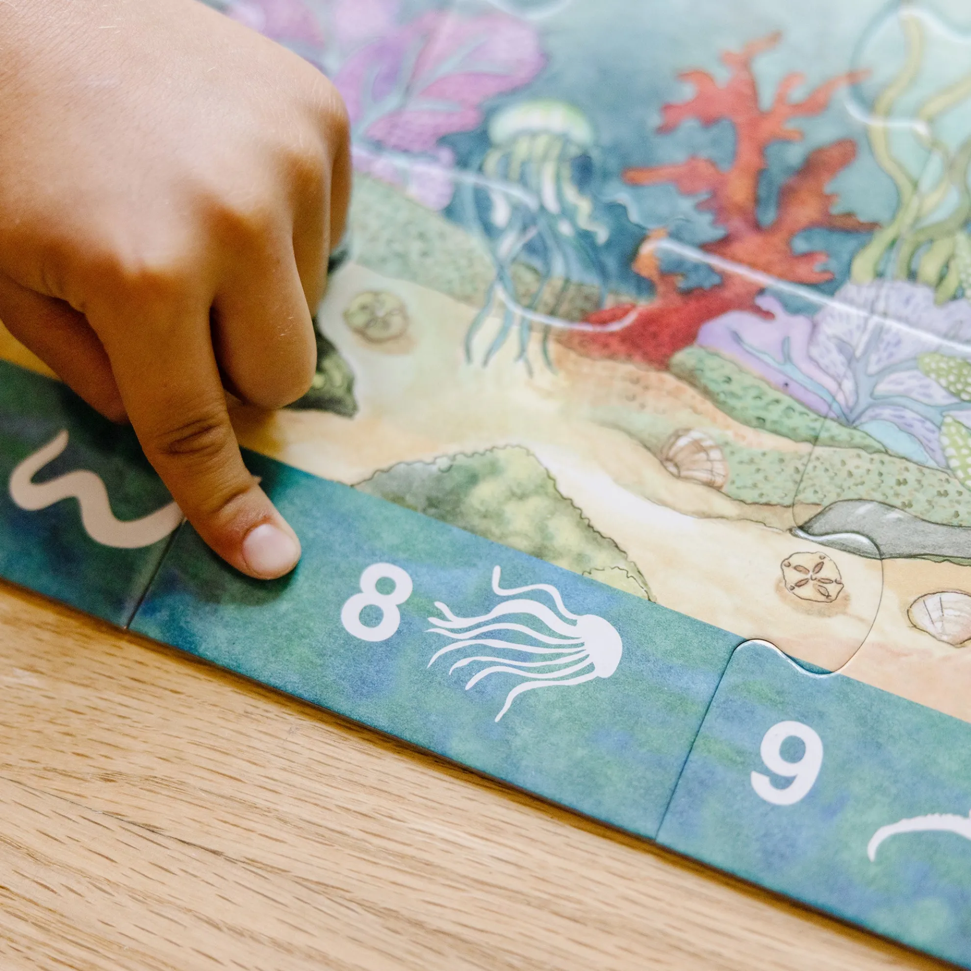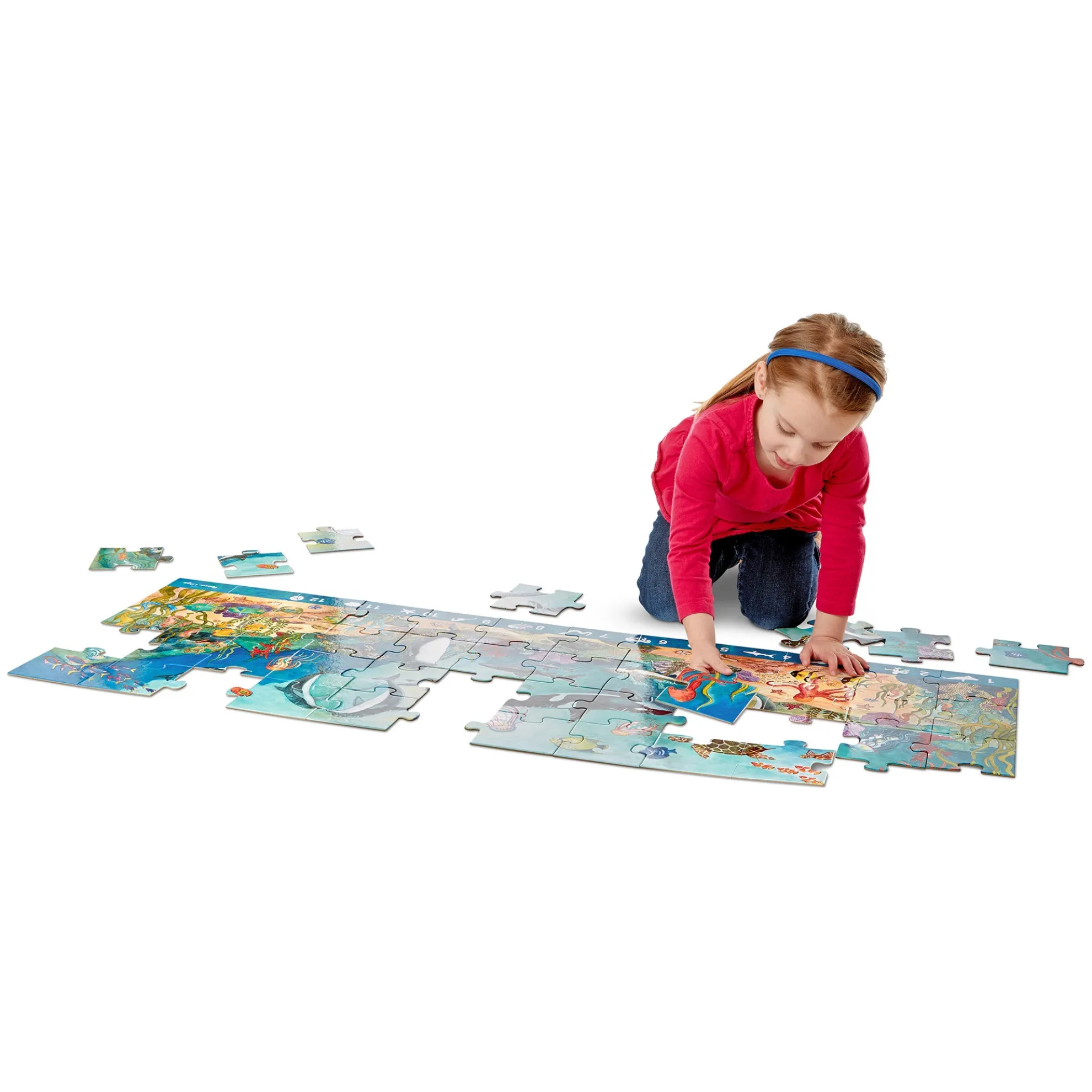 This jumbo search-and-find puzzle offers an extra activity when completed! The Beneath the Waves floor puzzle features 48 pieces that assemble to reveal a stunning underwater scene filled with animals to spot and count. The puzzle measures over four feet long when it’s assembled, and the 48 extra-thick cardboard pieces feature an easy-to-clean surface to keep it looking like new. A visual picture list is printed right on the puzzle, encouraging kids to do counting games and picture-search activities with no reading required. Playing with this puzzle is a great way for kids to explore the hidden world under the ocean while developing their cognitive, physical, and emotional skills. When children work on puzzles, they are fine-tuning their gross motor skills, improving their hand-eye coordination, strengthening their problem-solving skills, and beginning to develop logic and critical thinking processes. This Melissa & Doug puzzle makes an exceptional gift for preschoolers and kids ages four and older for hands-on, screen-free play. This product is certified by the Forest Stewardship Council. FSC certification ensures that products come from responsibly managed forests that provide environmental, social, and economic benefits, and that forests are protected for future generations. Please note that FSC certification applies to new inventory only (FSC C156584).