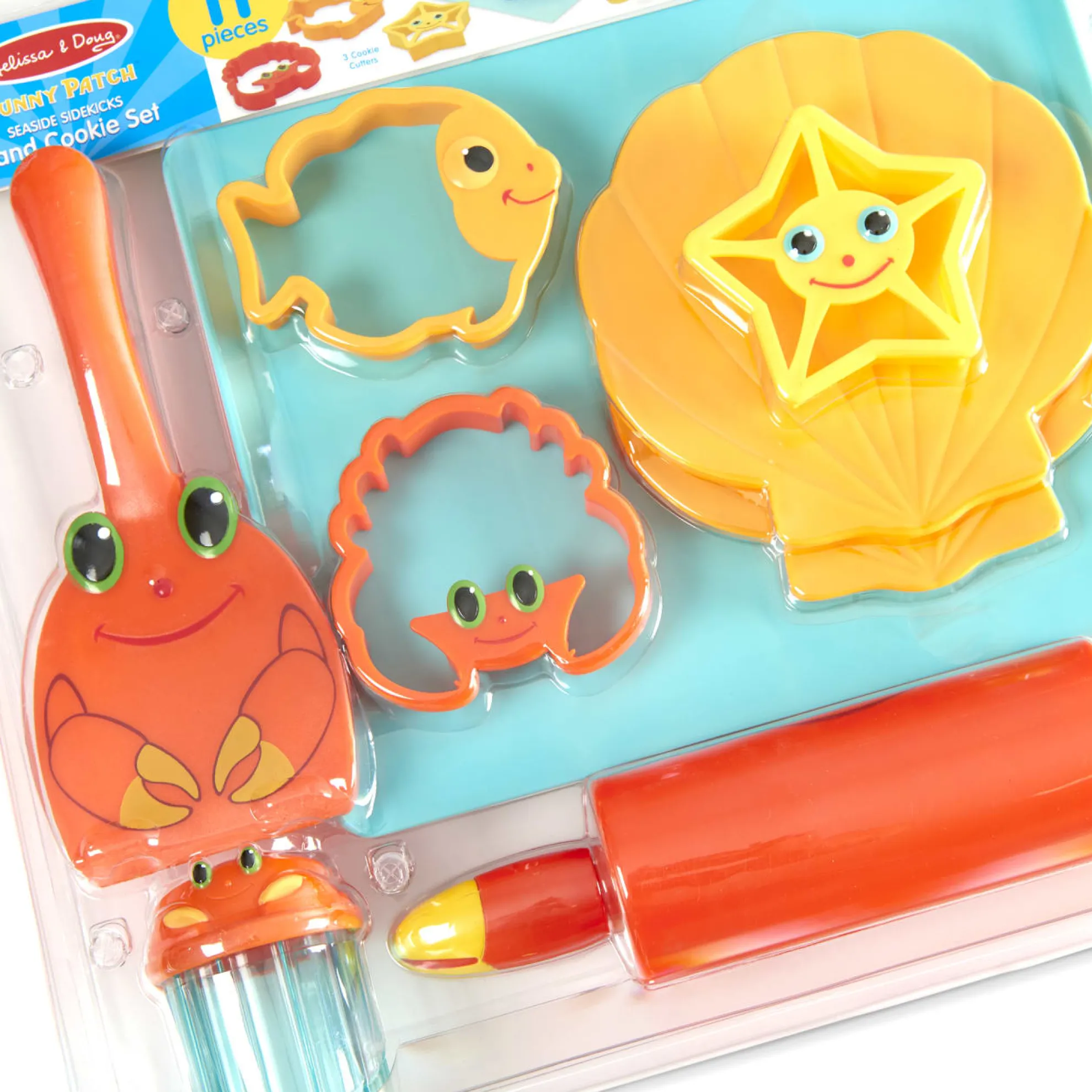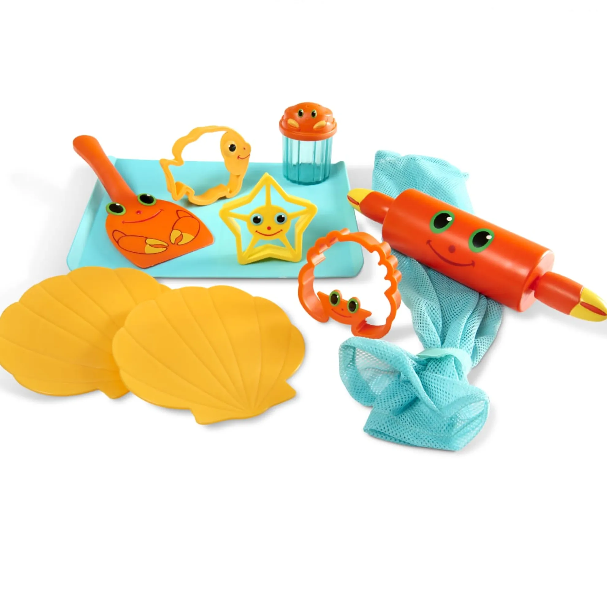 - Includes 3 cookie cutters, rolling pin, crab-topped sprinkles shaker, cookie sheet, spatula and two shell-shaped dishes.