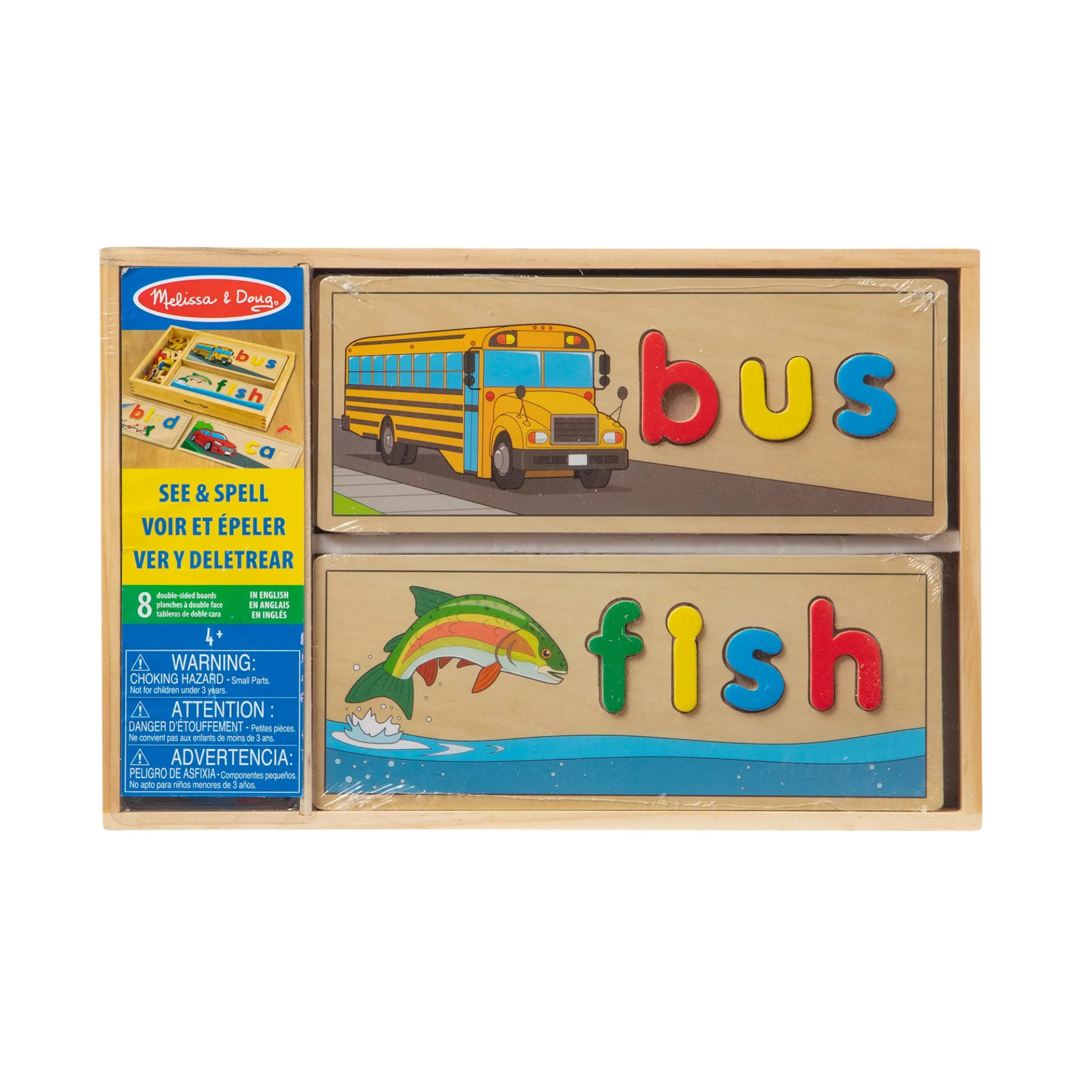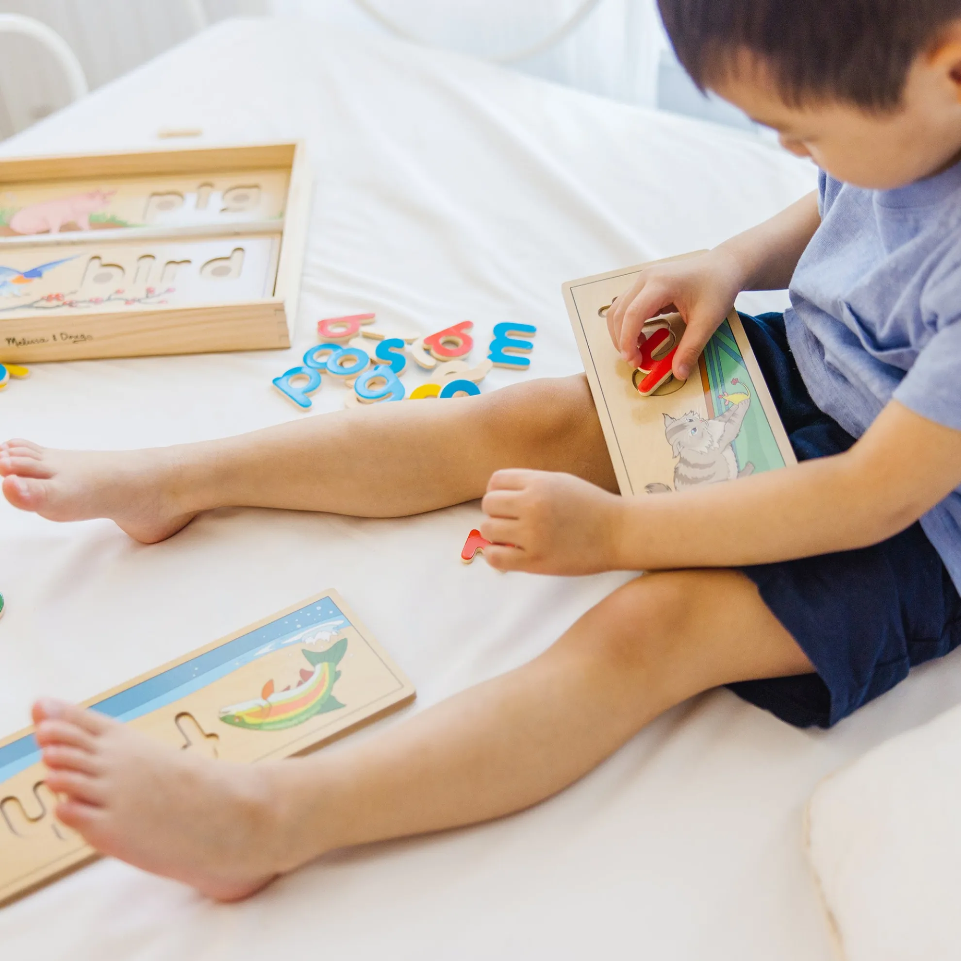 - Place letters into wooden puzzle boards to spell words that match illustrations