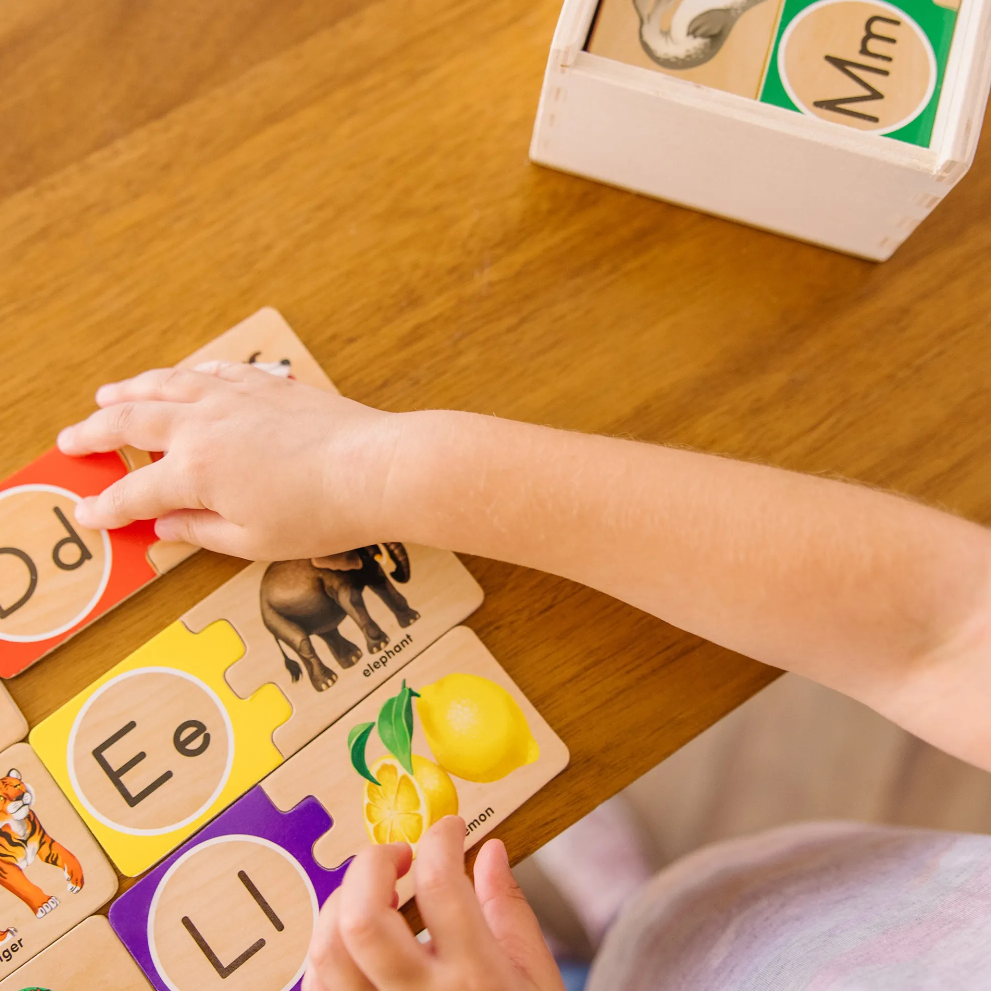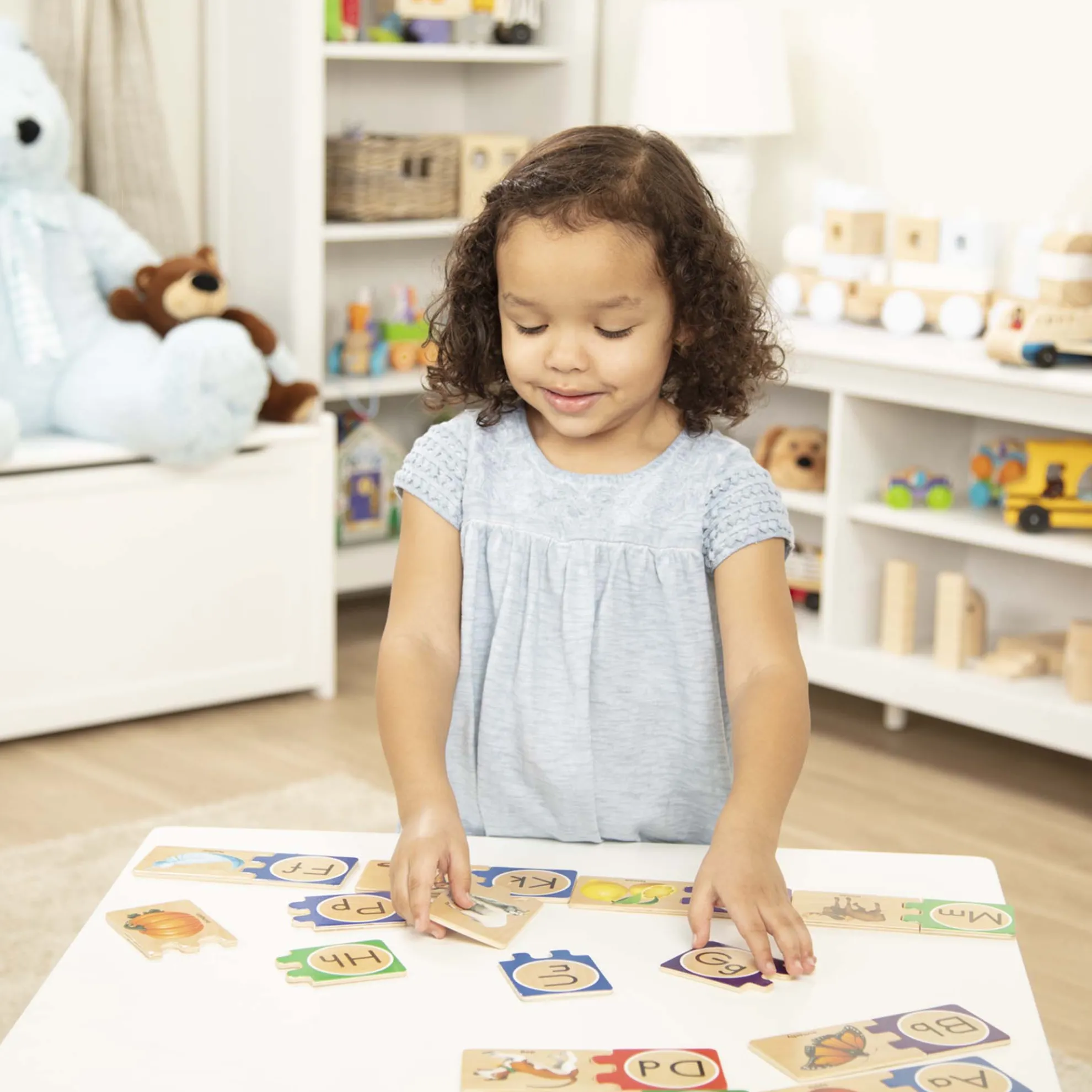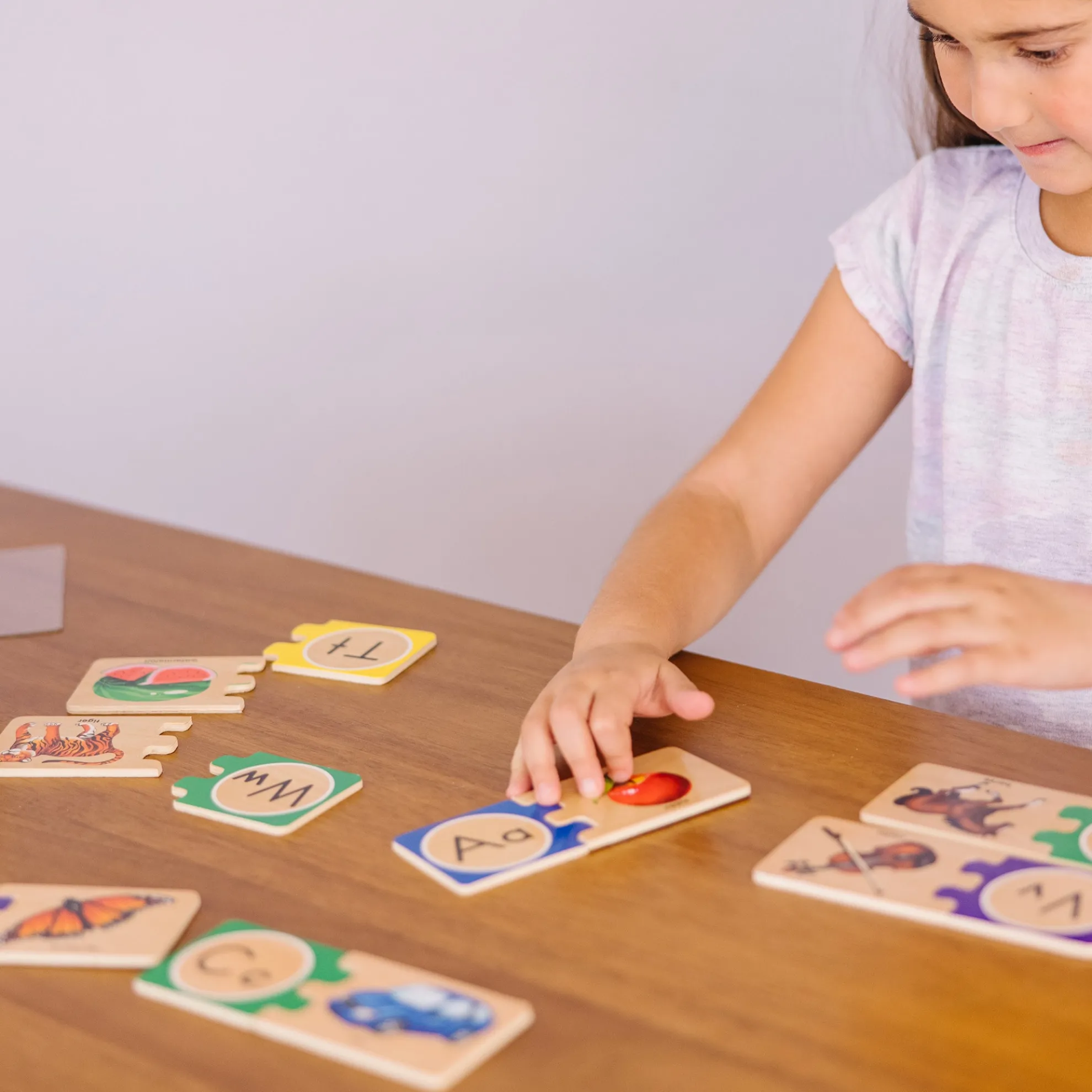 Kids can match these wooden puzzle pairs to make mastering letters as easy as A-B-C! A different object illustrates each letter of the alphabet shown in both upper and lower case, and the puzzles are self-correcting because each puzzle piece has only one match that fits. It’s a great way for children to play independently and learn at the same time. The puzzle includes 52 high-quality wooden pieces, and comes in a sturdy wooden box with a slide-in lid for easy storage and accessibility. The colorful puzzle pieces feature a familiar item to represent each letter ranging from an apple to a zebra. The Self-Correcting Alphabet Puzzles help kids practice letter recognition, matching and memory skills, eye-hand coordination, and fine motors skills. Finding the correct matching piece and solving a letter puzzle can also help kids feel a sense of pride and accomplishment. It makes a great gift for preschoolers and young learners ages four and older, for hands-on, screen-free play.