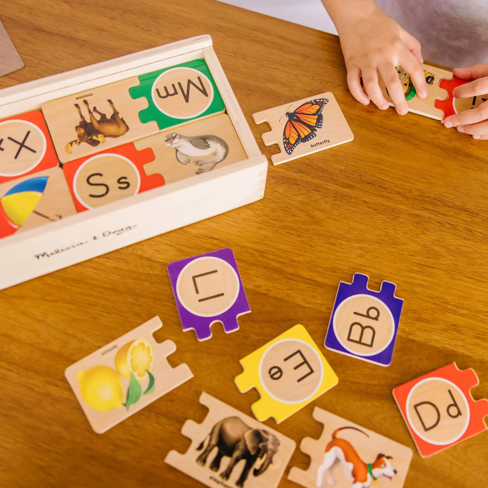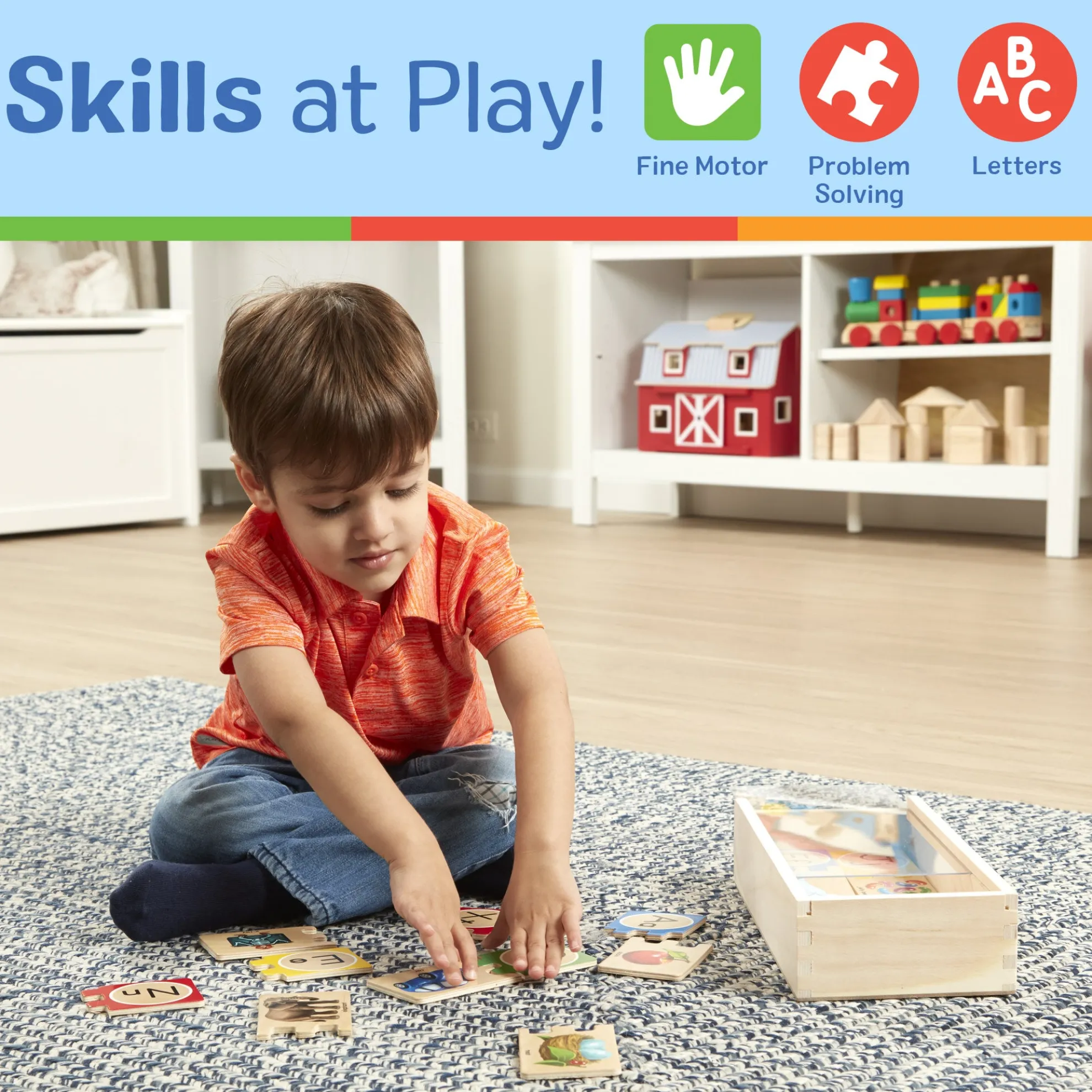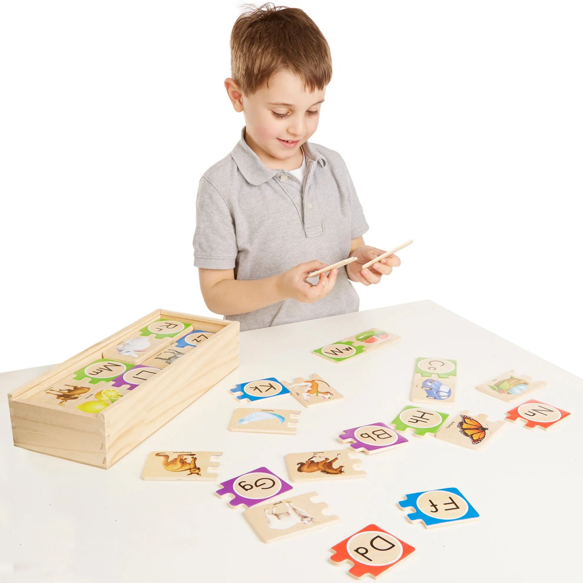 Kids can match these wooden puzzle pairs to make mastering letters as easy as A-B-C! A different object illustrates each letter of the alphabet shown in both upper and lower case, and the puzzles are self-correcting because each puzzle piece has only one match that fits. It’s a great way for children to play independently and learn at the same time. The puzzle includes 52 high-quality wooden pieces, and comes in a sturdy wooden box with a slide-in lid for easy storage and accessibility. The colorful puzzle pieces feature a familiar item to represent each letter ranging from an apple to a zebra. The Self-Correcting Alphabet Puzzles help kids practice letter recognition, matching and memory skills, eye-hand coordination, and fine motors skills. Finding the correct matching piece and solving a letter puzzle can also help kids feel a sense of pride and accomplishment. It makes a great gift for preschoolers and young learners ages four and older, for hands-on, screen-free play.