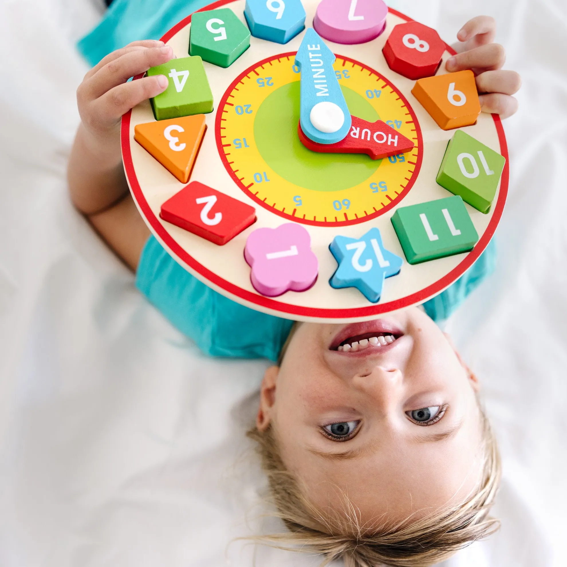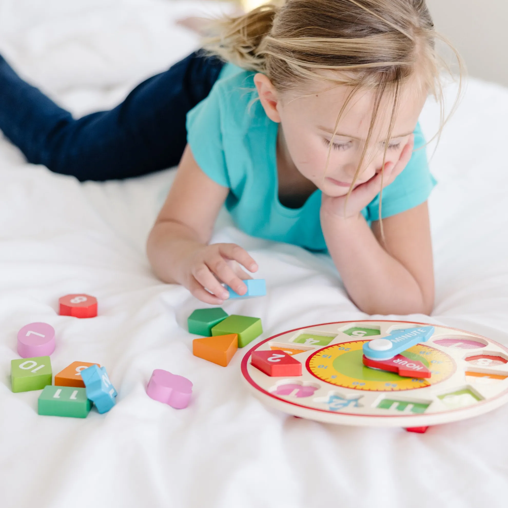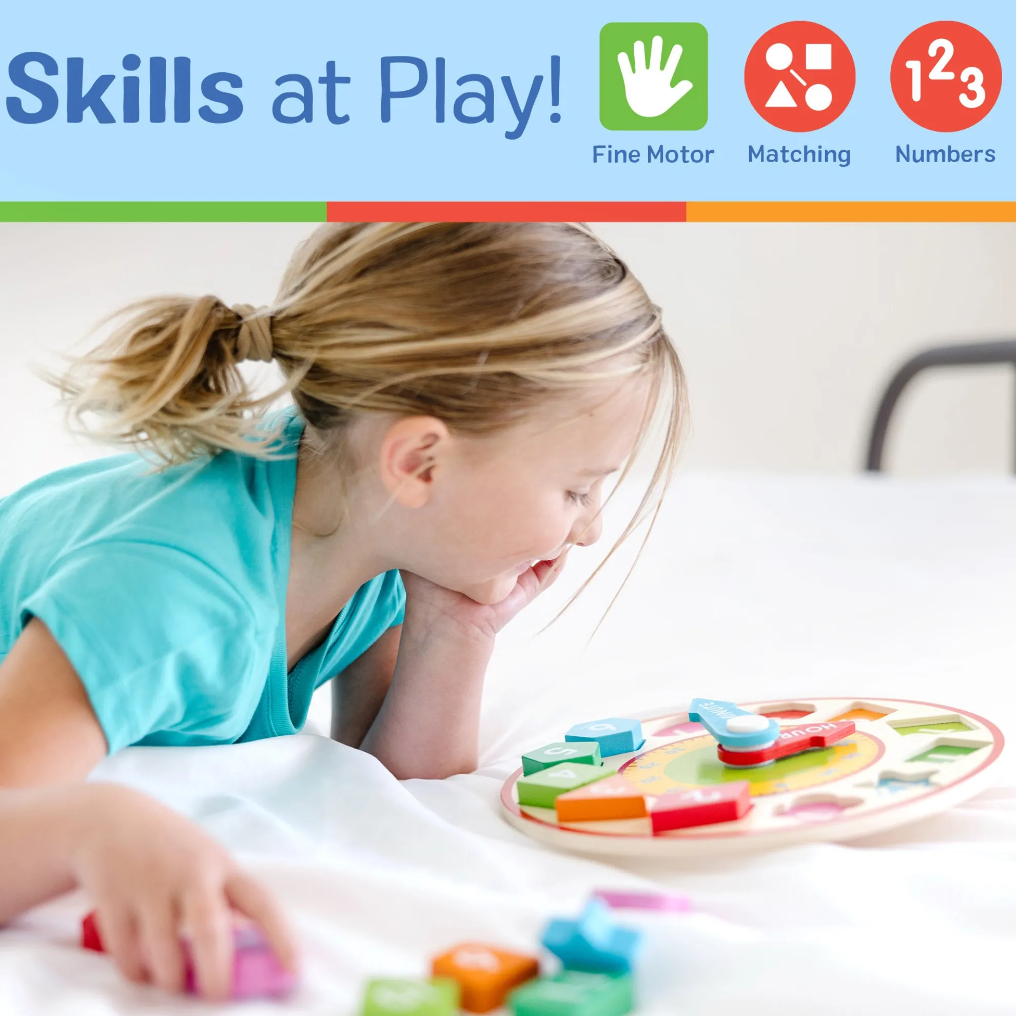 Our popular preschool-friendly clock gets a cool update! A larger face, exposed natural wood, and pops of vibrant color on match-able chunky pieces make for a fresh modern look . . . but the classic play value and top-quality construction remains the same. Kids love the color-coded minute and hour hands that spin around with a simple push. (No matter where they point, it’s always time for learning and fun!) Children can match the colors, sort the shapes, and solve the puzzle as they manipulate the color blocks and turn the hands, building cognitive and motor skills and laying the groundwork for learning to tell time. Extension activities printed right on the box encourage parent-and-child play, helping children begin to master early-learning concepts as they gain familiarity with the form of a clock and concepts of time.