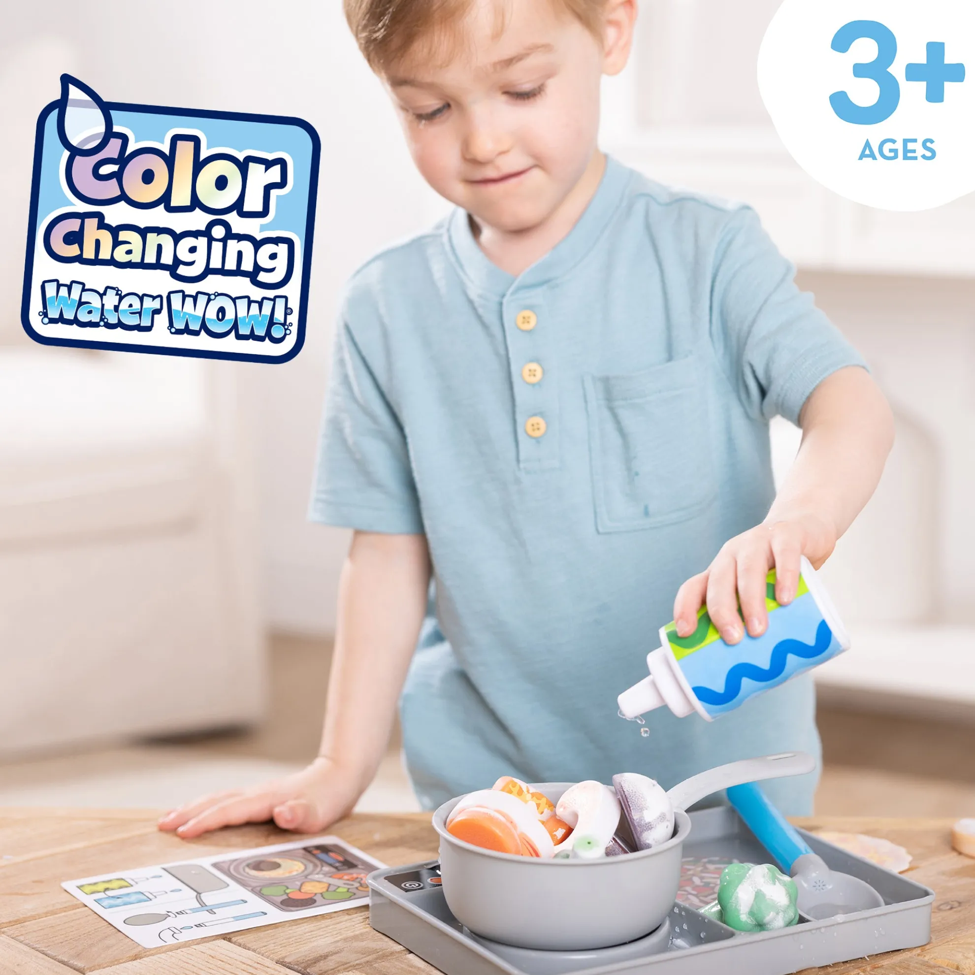 - Includes durable stovetop, water-dispensing spoon and squeeze bottle, cooking pot, 6 color-changing vegetables, 6 color-changing proteins, 2 color-changing meal disks, and double-sided reusable activity card