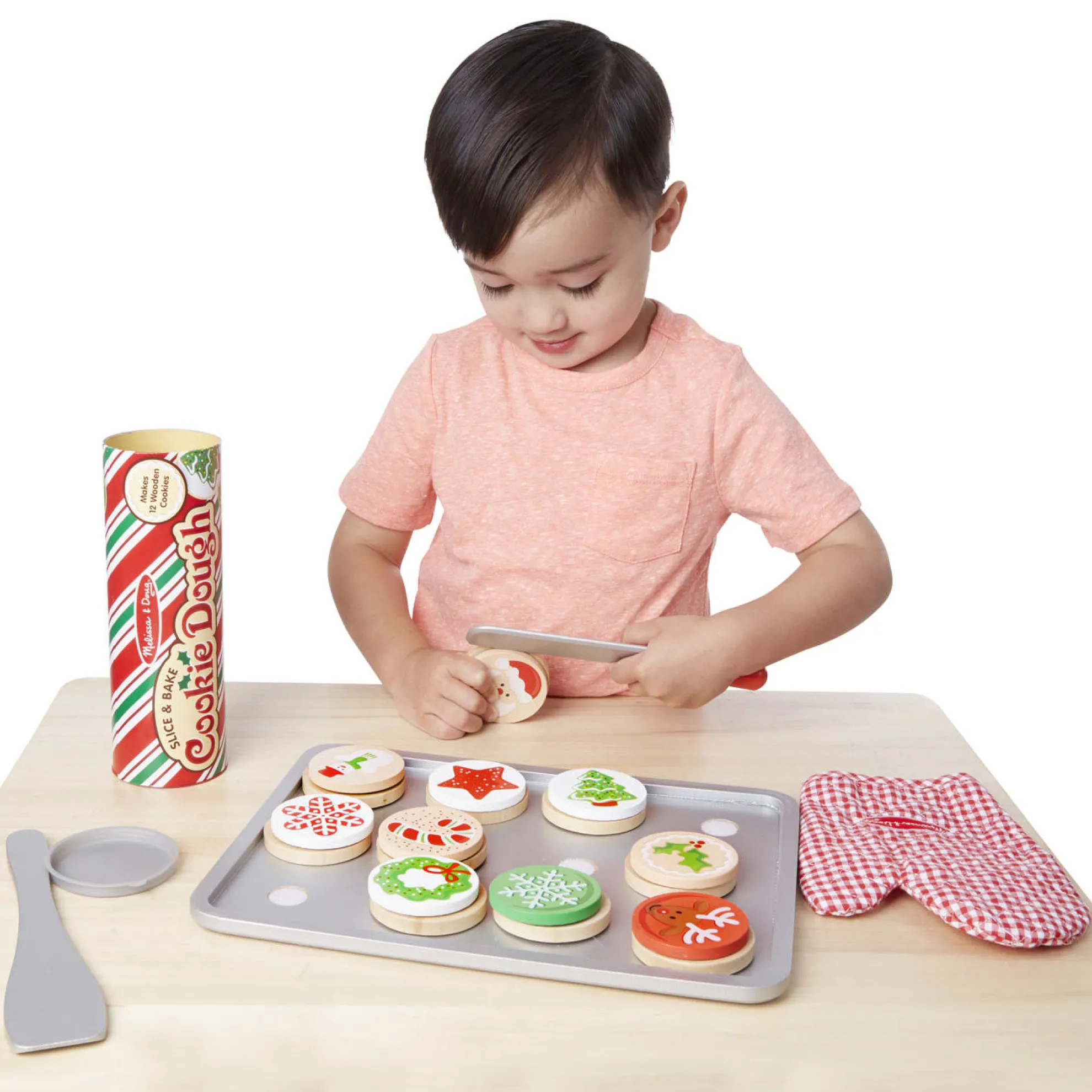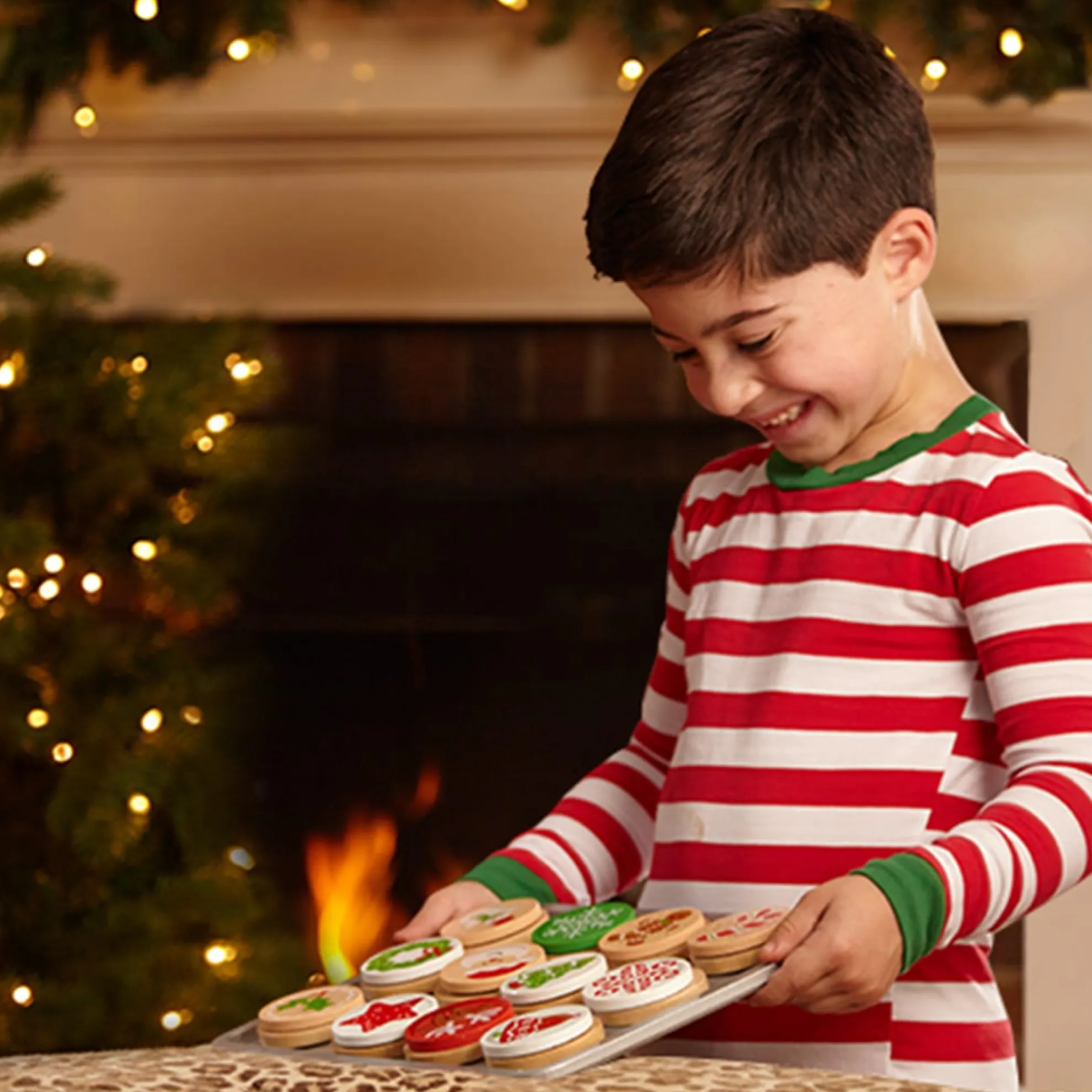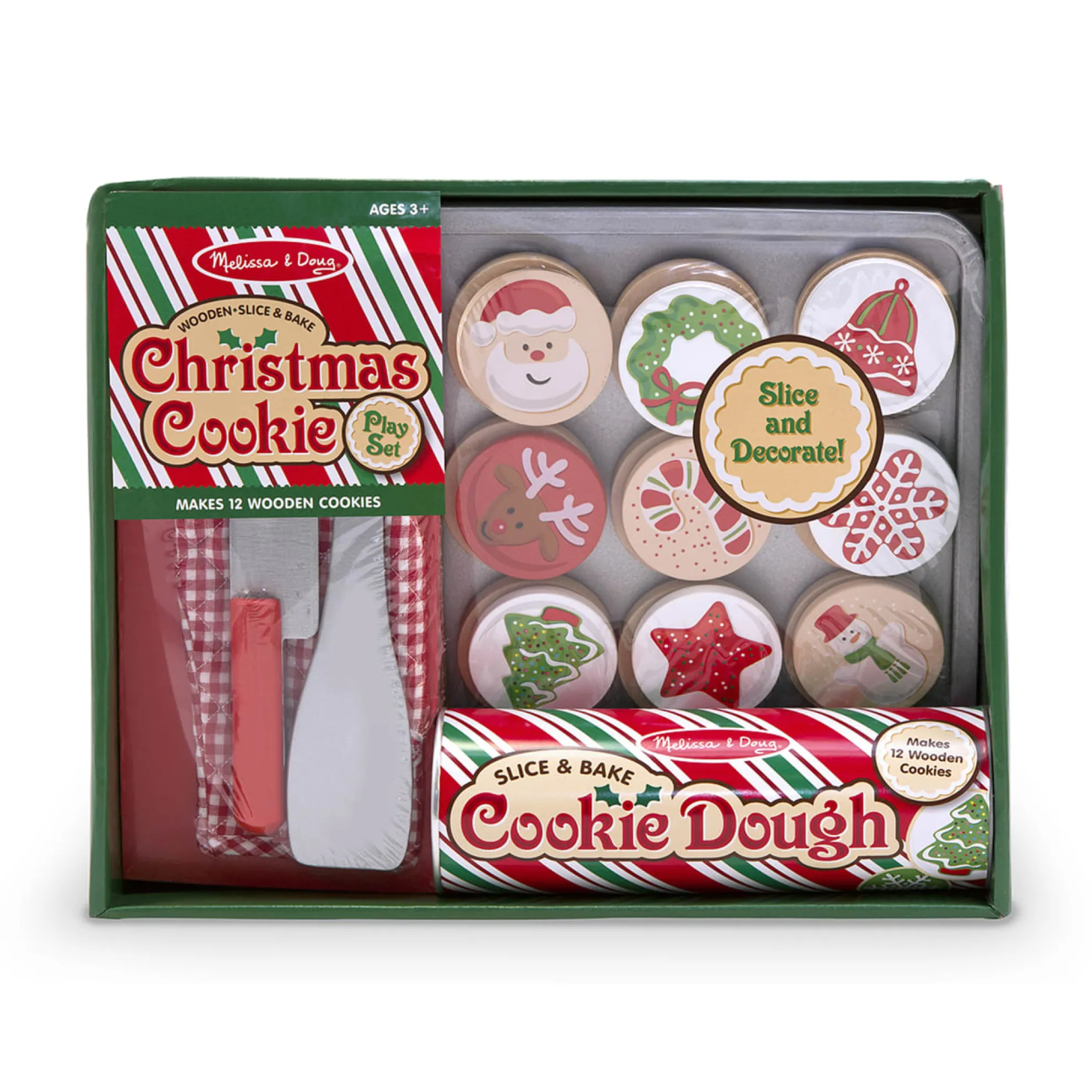Slice and pretend to bake a dozen wooden cookies, then decorate them for Christmas! This colorful play-food set includes a tube of 12 sliceable cookies with 12 decorative toppings, an oven mitt, wooden cookie sheet, knife and spatula, plus pretend baking directions to encourage unlimited imaginative play and learning. It’s a festive way to reinforce basic skills, encourage creativity and celebrate the holidays!