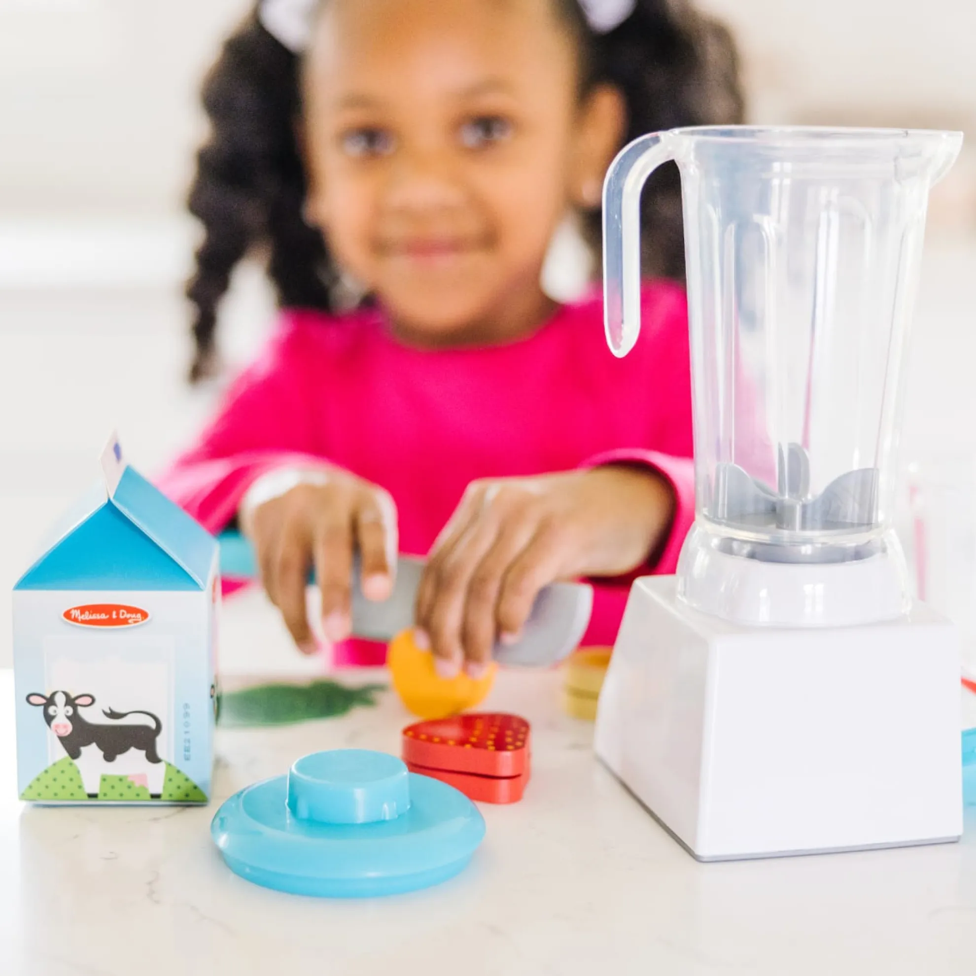- 22-piece pretend play blender set with base, jar, and lid, and play food ingredients