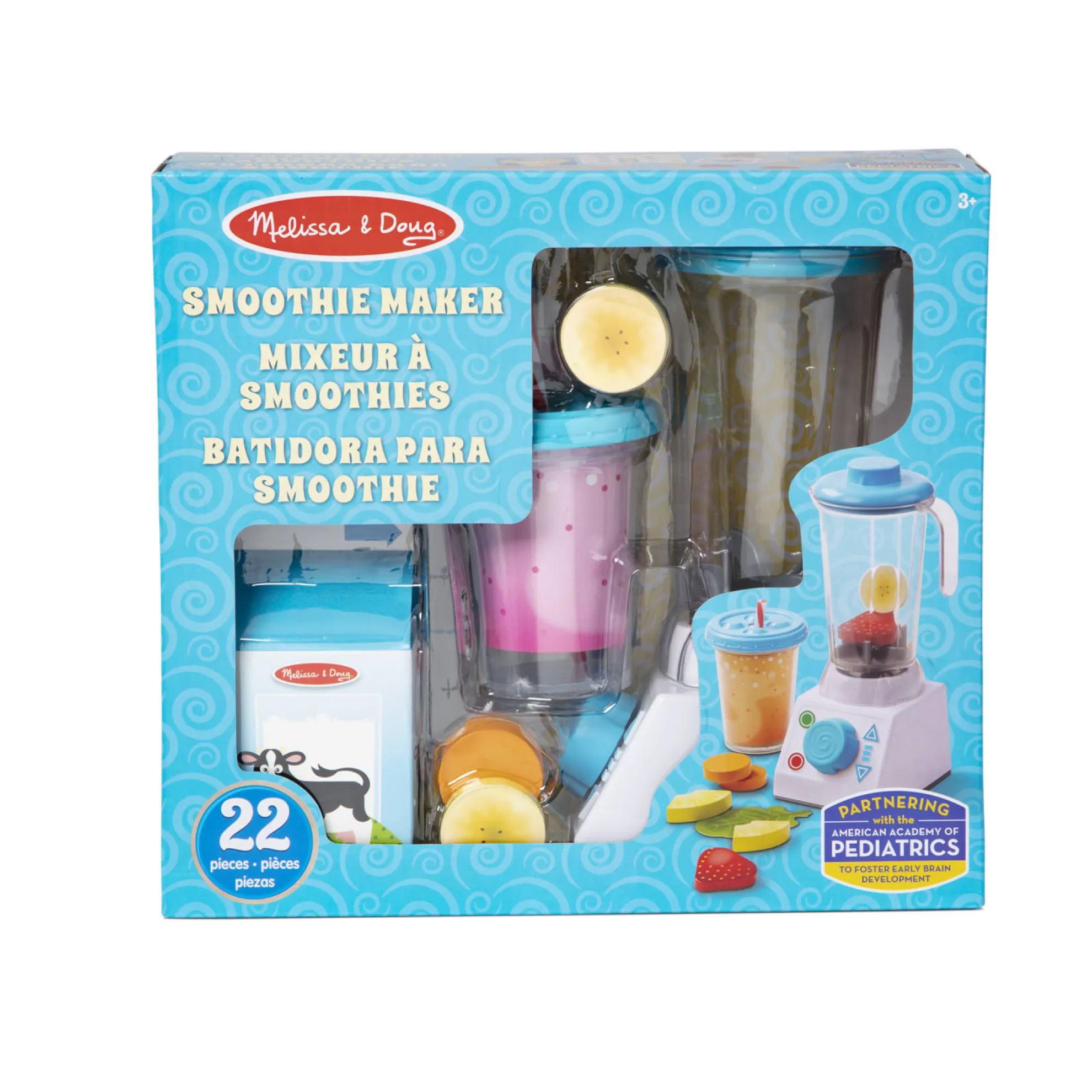 Whip up delicious playtime smoothies with this pretend play blender! Use the wooden knife to slice and wooden fruits and vegetables, choose other healthful ingredients, like kale or protein powder, and pop them in the blender. Add a dash of pretend milk, spin the dial to blend, pour into a cup with lid and straw, and serve! There’s a double-sided reusable menu card for taking orders, and cup inserts to add realistic color to smoothies. Any time is a good time for a smoothie!