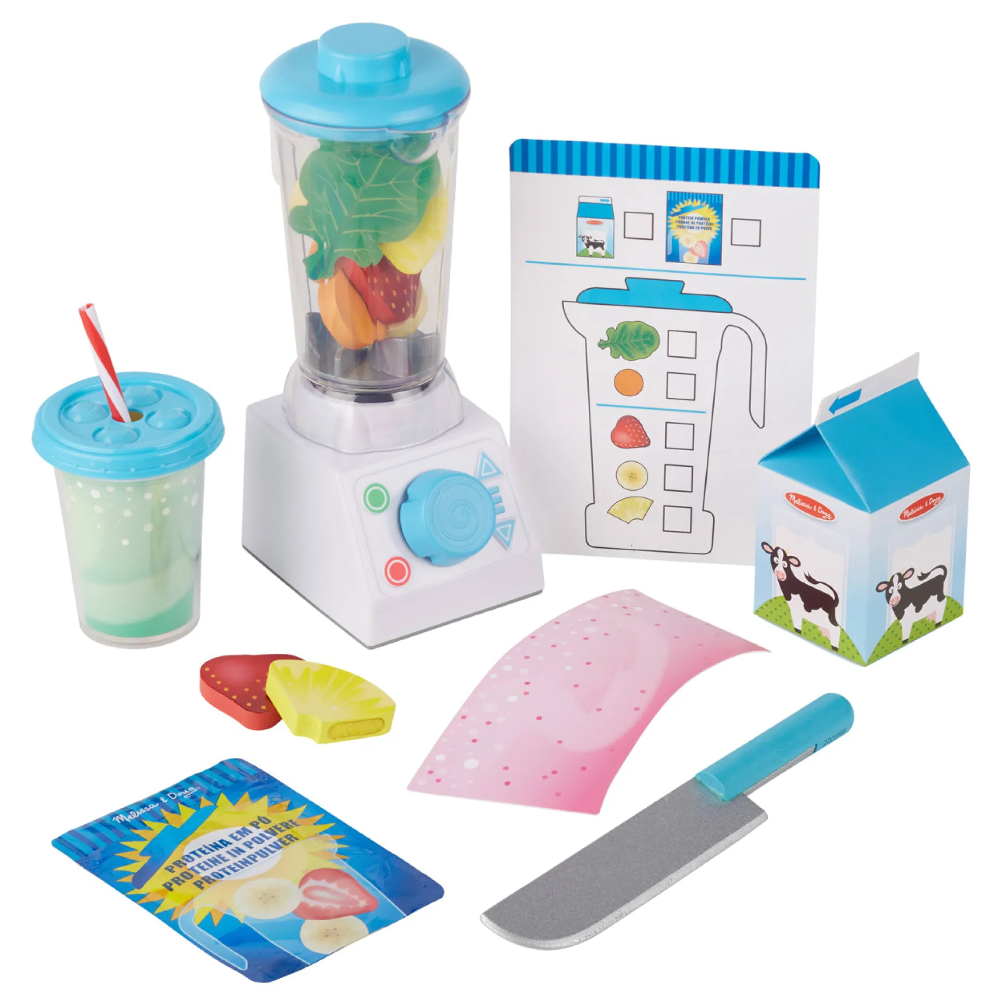 - Includes wooden fruit and vegetables to slice, kale leaf, protein powder disc in a pouch, milk carton, 2 double-sided cup inserts