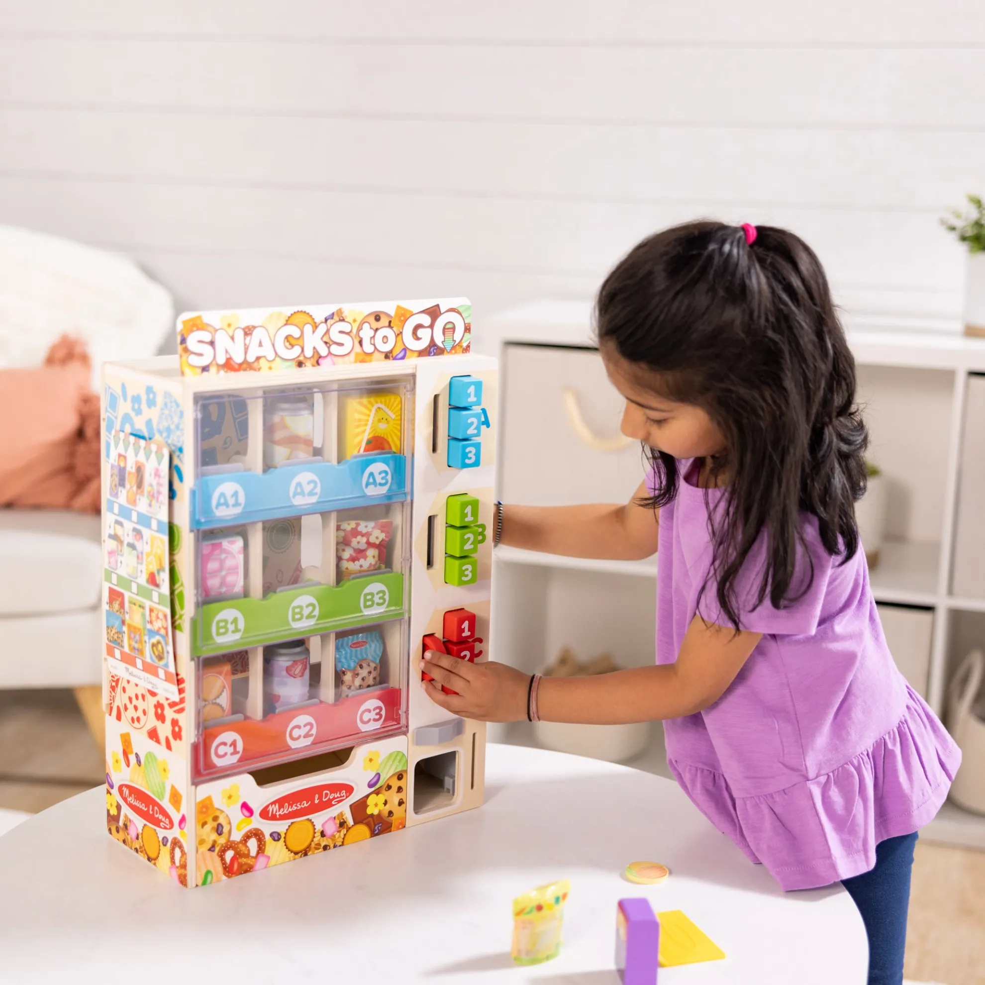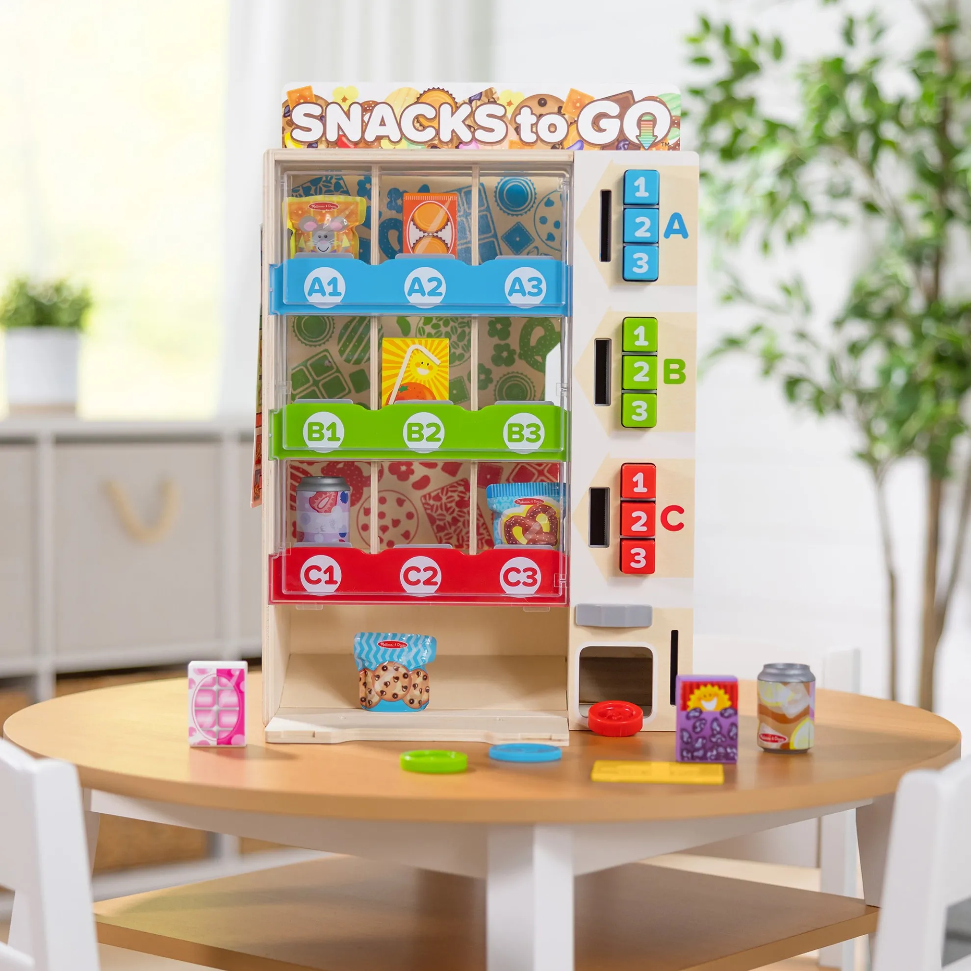- 19-piece play set includes wooden vending machine, 3 double-sided wooden snack bars, 3 double-sided drink cans, 3 play snacks in 3 double-sided snack pouches, 3 play coins, bank card, double-sided customizable sign, reusable activity card