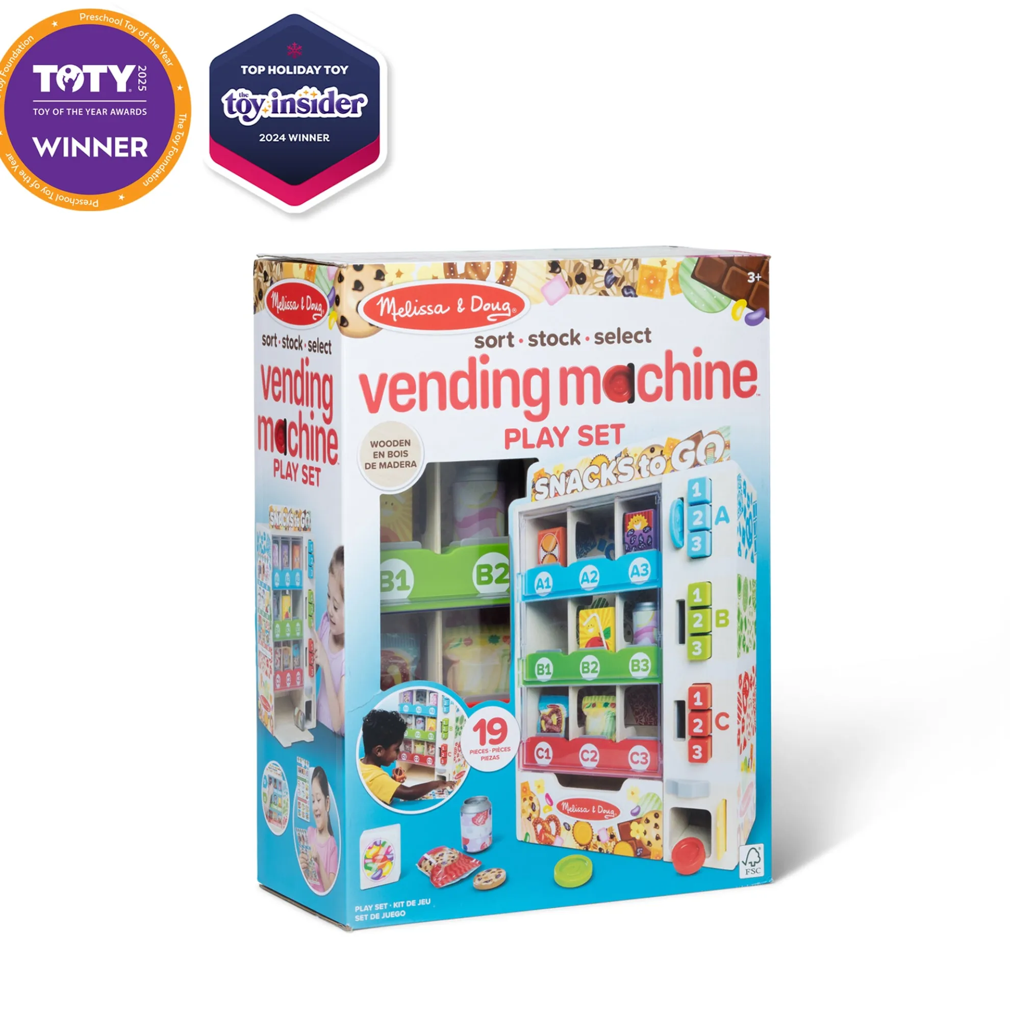 - Sort play food items, stock the wooden vending machine, then insert play coins and make a selection by pressing the corresponding button and watch items fall into the collection drawer