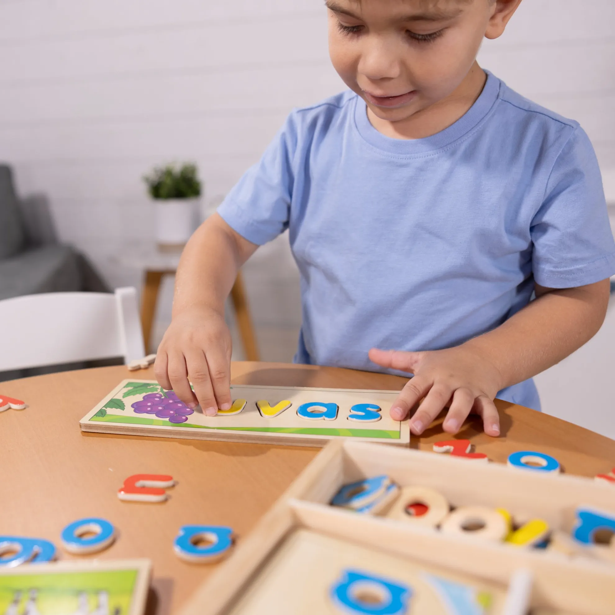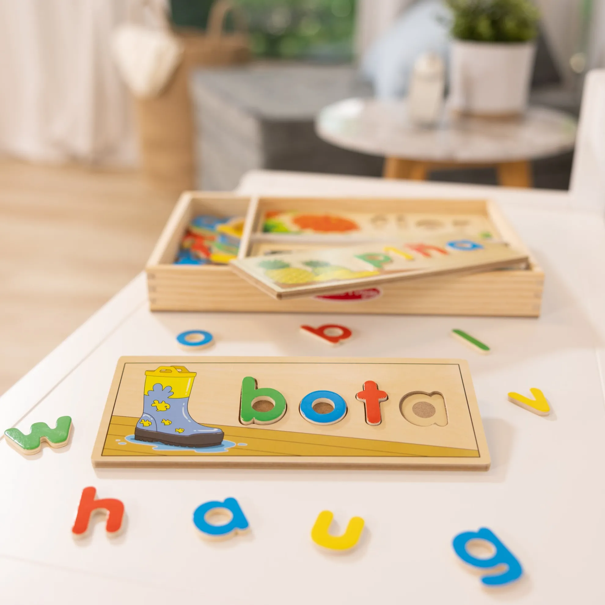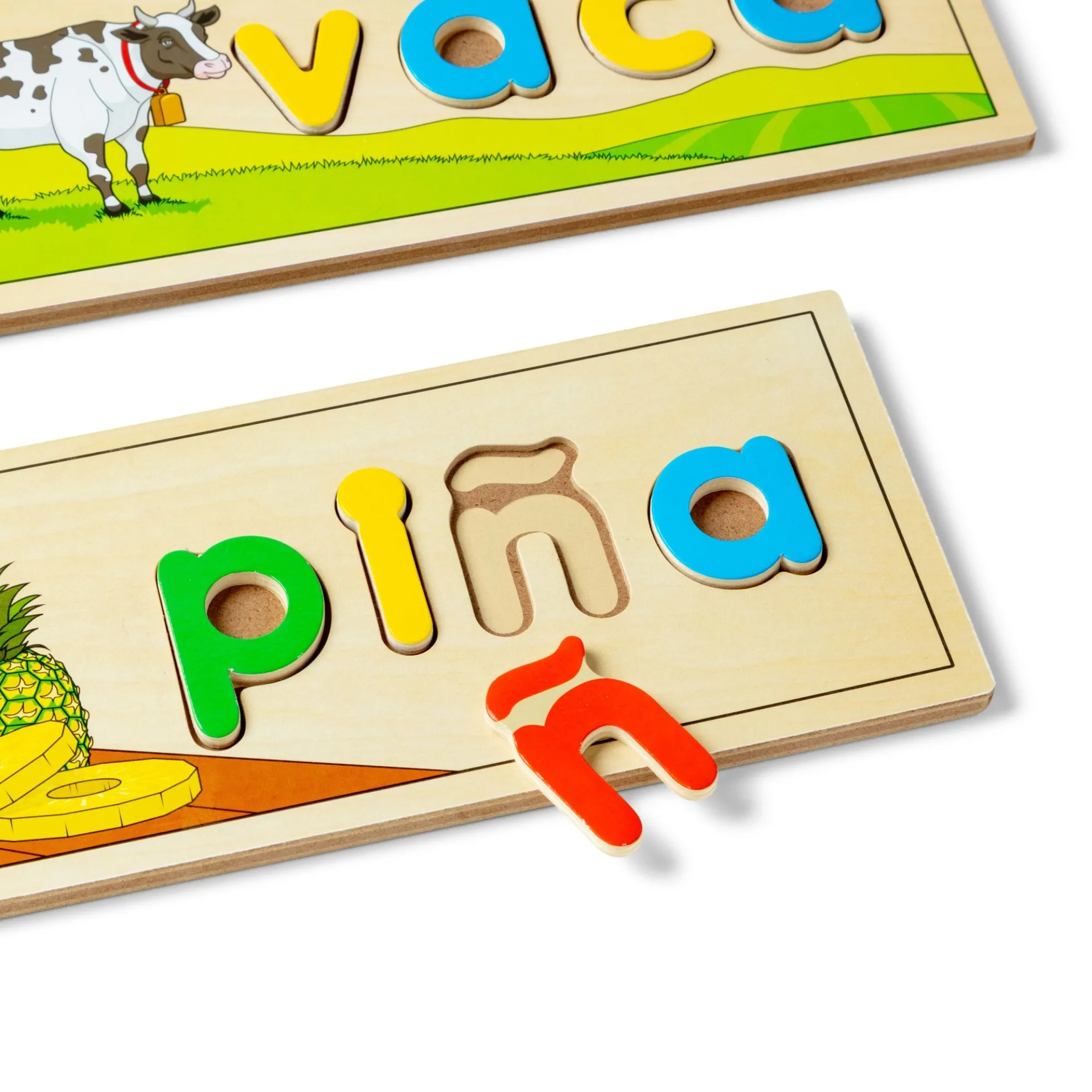 - Place letters into wooden puzzle boards to spell words in Spanish that match illustrations