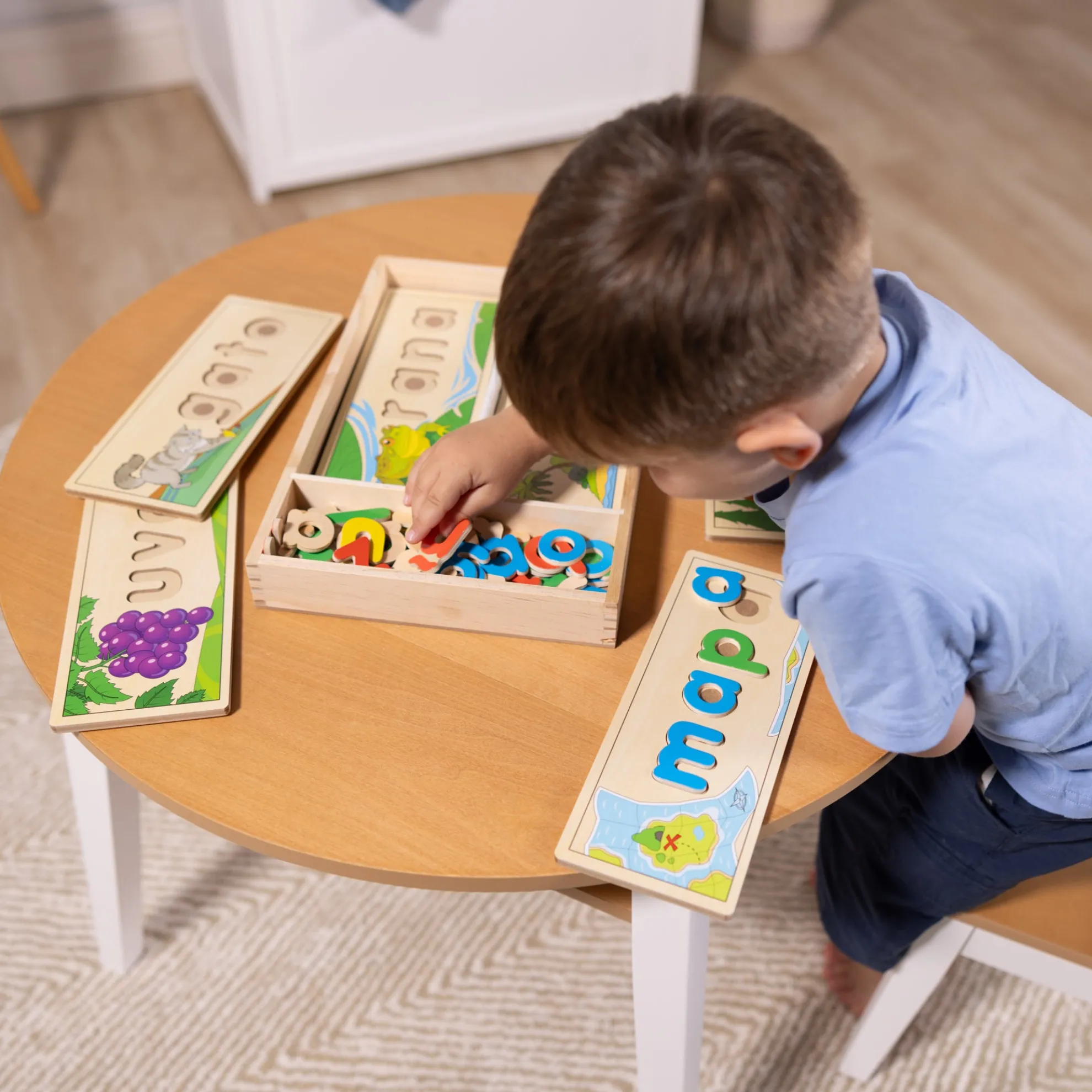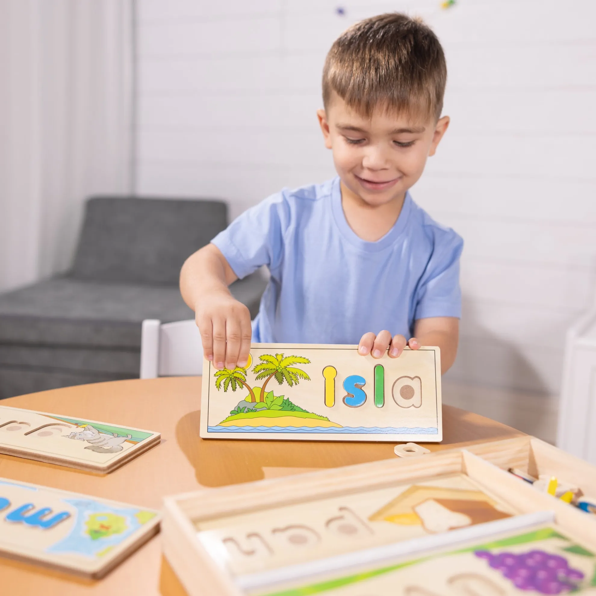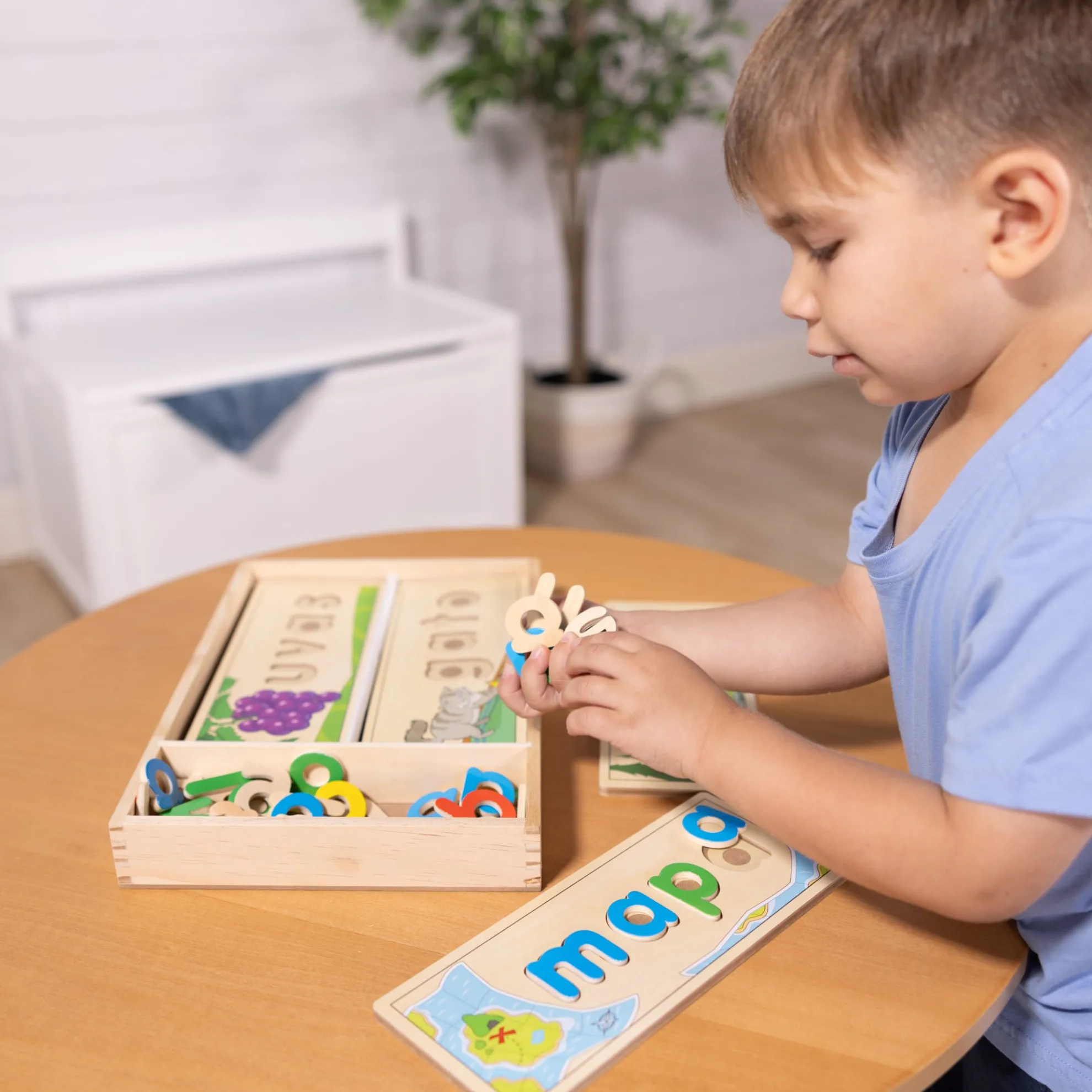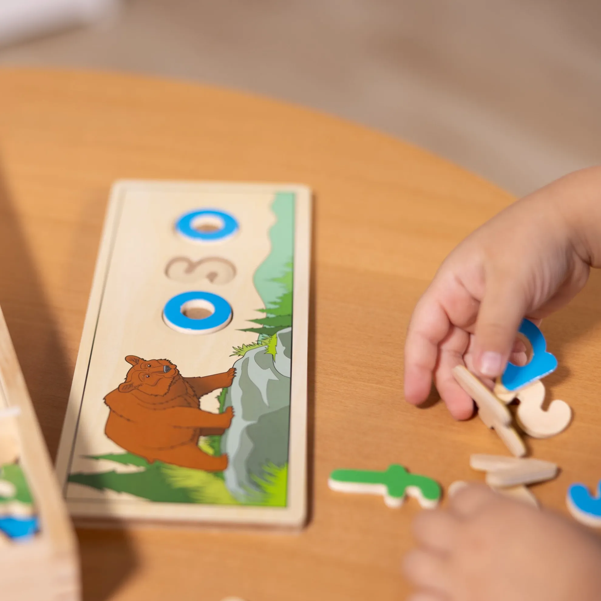 - Place letters into wooden puzzle boards to spell words in Spanish that match illustrations