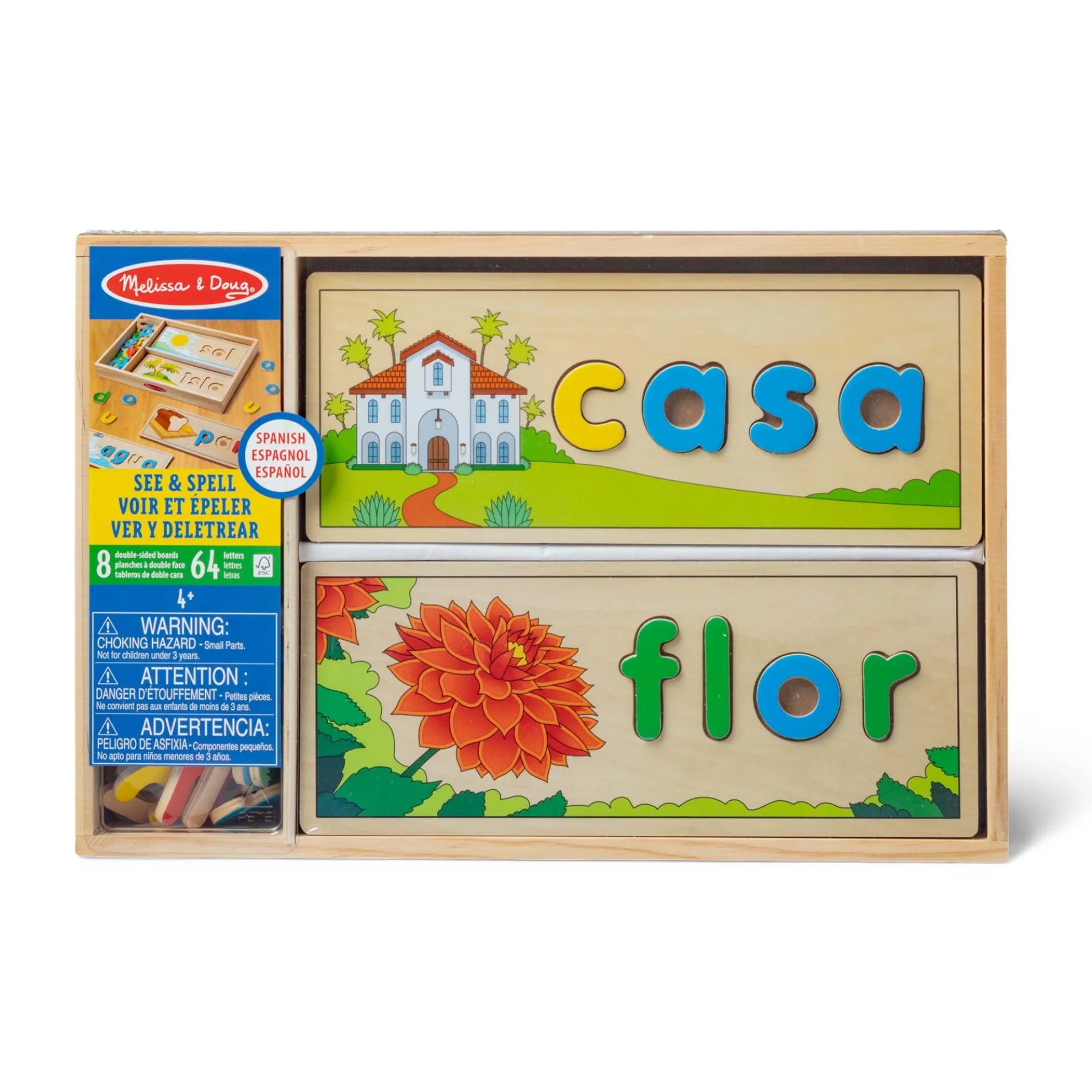 Complete a puzzle to spell a word in Spanish! This wonderfully illustrated wooden puzzle set is great for native Spanish-speakers and for kids learning another language. Place the wooden lowercase letters into the double-sided puzzle boards to spell words in Spanish that match the illustrations. The Melissa & Doug Spanish See & Spell helps children gain familiarity with the letters of the alphabet and their sounds as kids develop a sight-reading vocabulary (Spanish only). The letters are also great for stenciling and lots of learning games, as well as for color recognition and sorting and sequencing activities. The 64 colorful wooden letters fit into the eight two-sided cutout boards to spell three- and four-letter words, such as gato, casa, and sol. All this spelling and fine-motor fun stores conveniently in a compact wooden crate! This product is certified by the Forest Stewardship Council. FSC certification ensures that products come from responsibly managed forests that provide environmental, social, and economic benefits, and that forests are protected for future generations. Please note that FSC certification applies to new inventory only (FSC C156584)