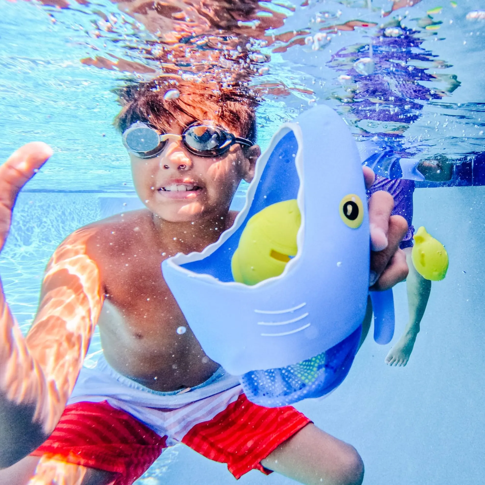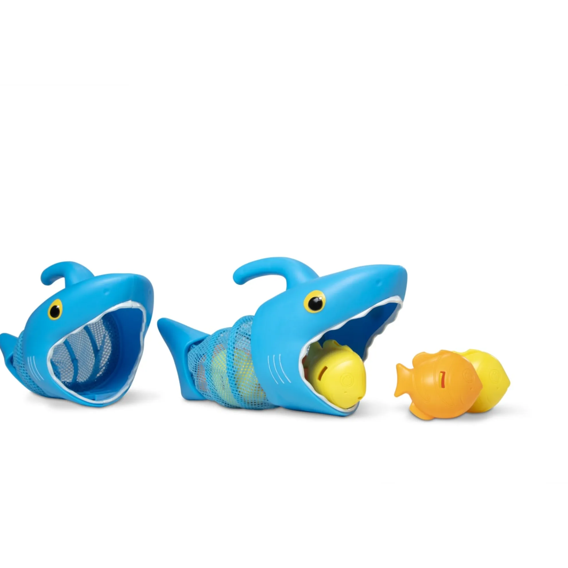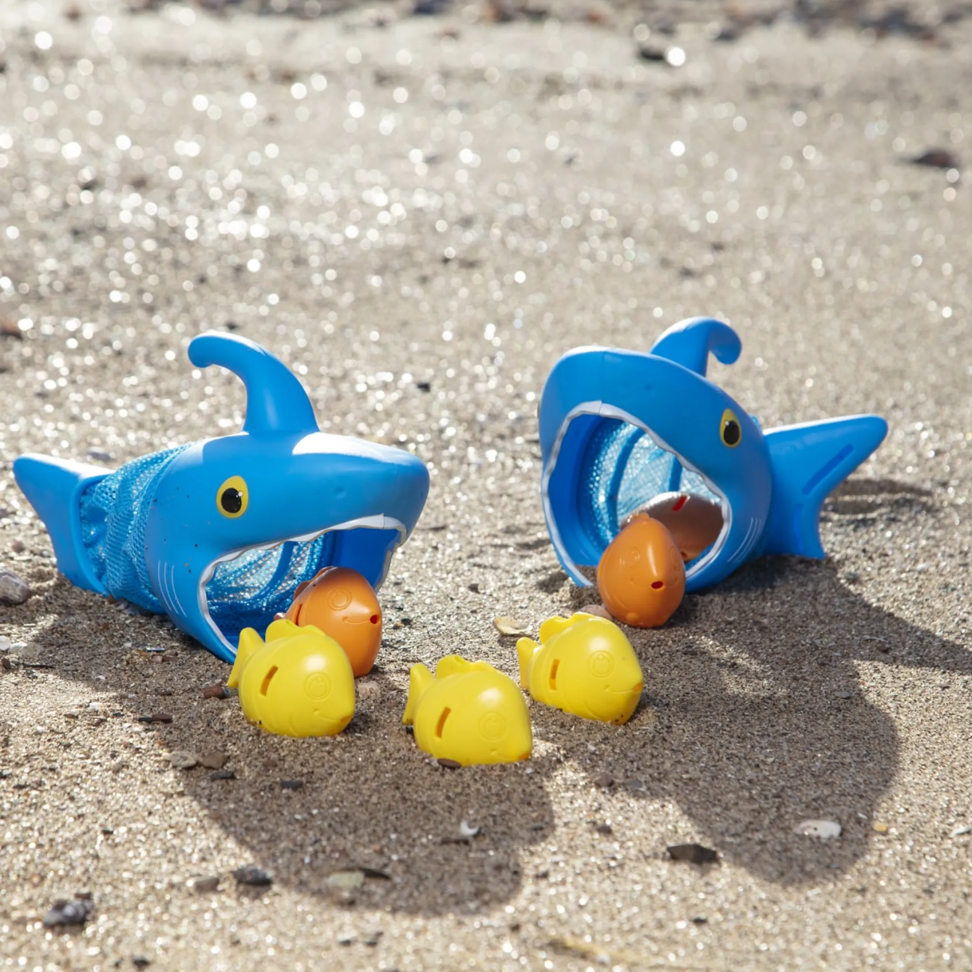 Speed like a hungry shark to gobble up tasty fish! Just grab onto the handle of a Spark Shark net and swim through the pool to scoop up the fishy sinkers. The set comes with two shark nets, six colorful sinkers and lots of play ideas for races, games and more!