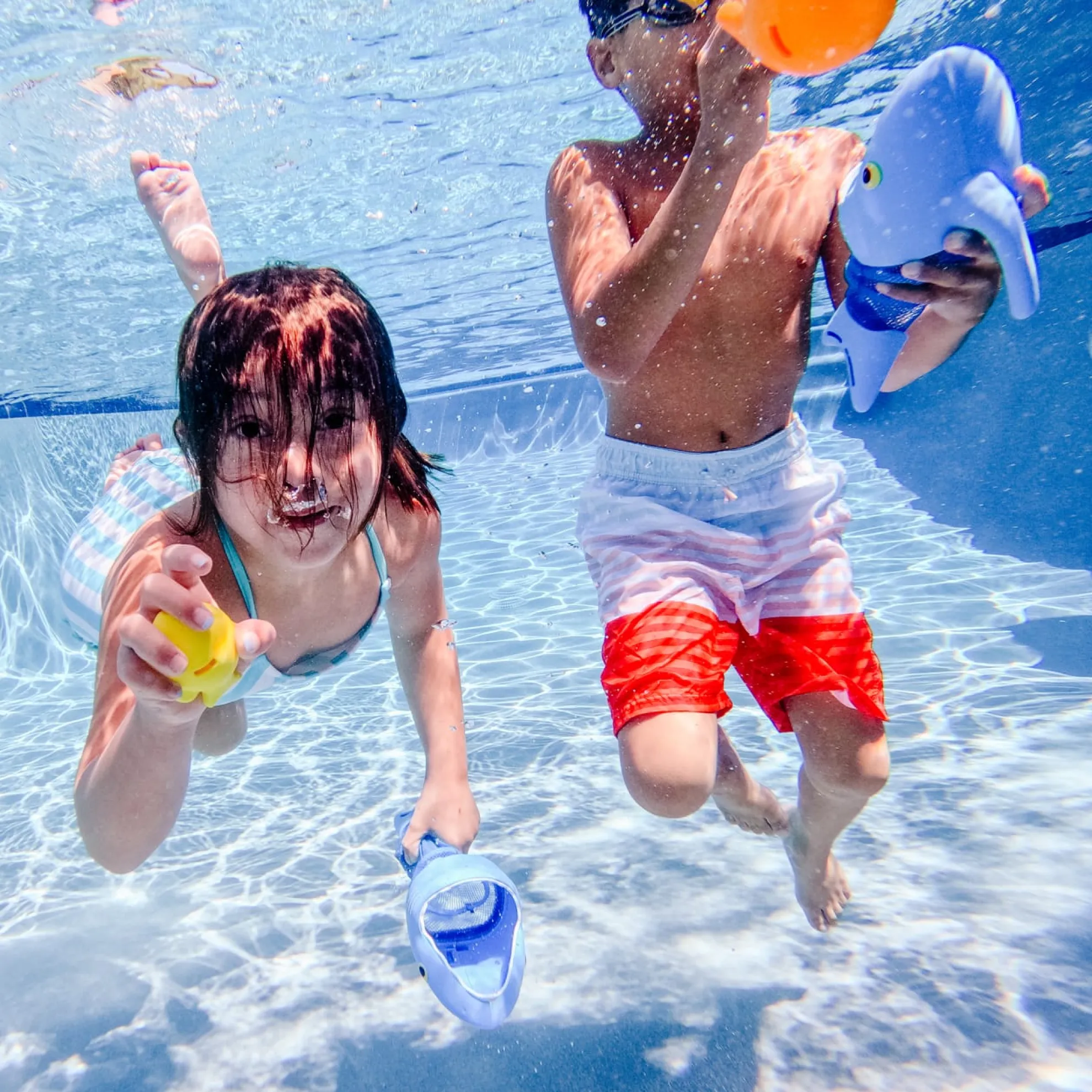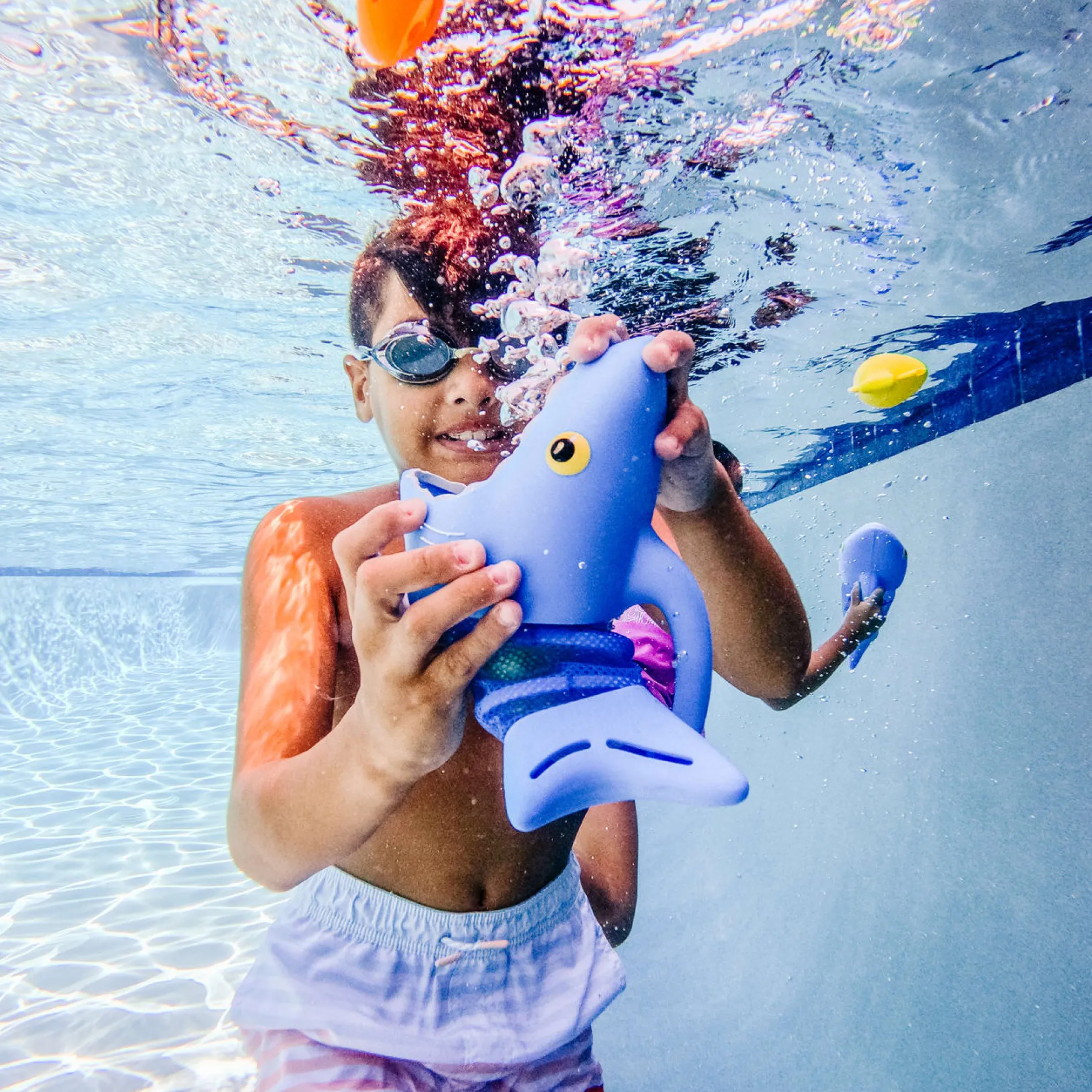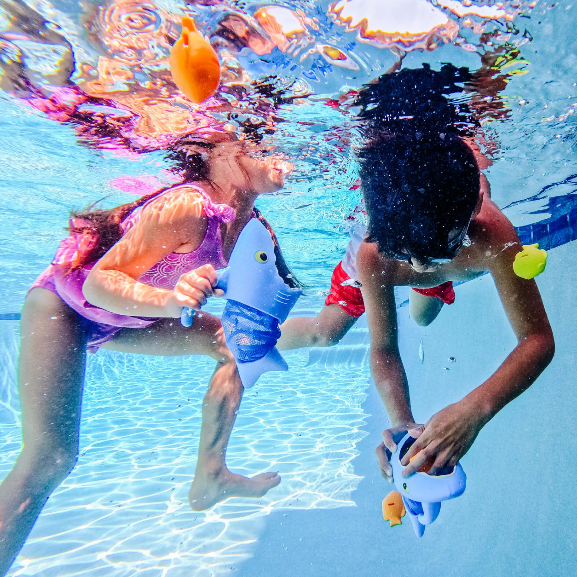 Speed like a hungry shark to gobble up tasty fish! Just grab onto the handle of a Spark Shark net and swim through the pool to scoop up the fishy sinkers. The set comes with two shark nets, six colorful sinkers and lots of play ideas for races, games and more!