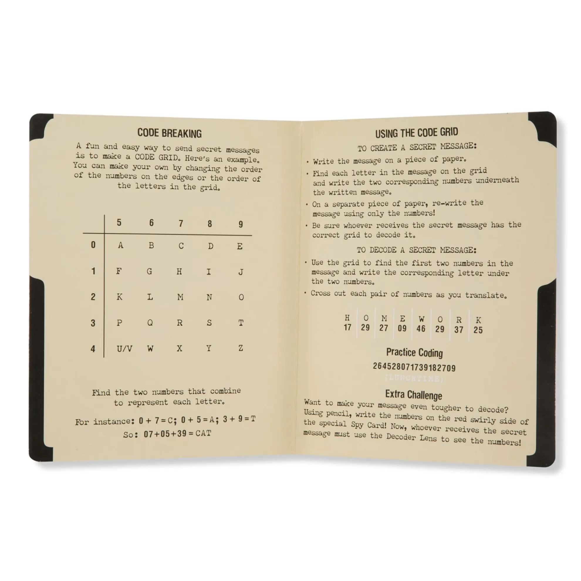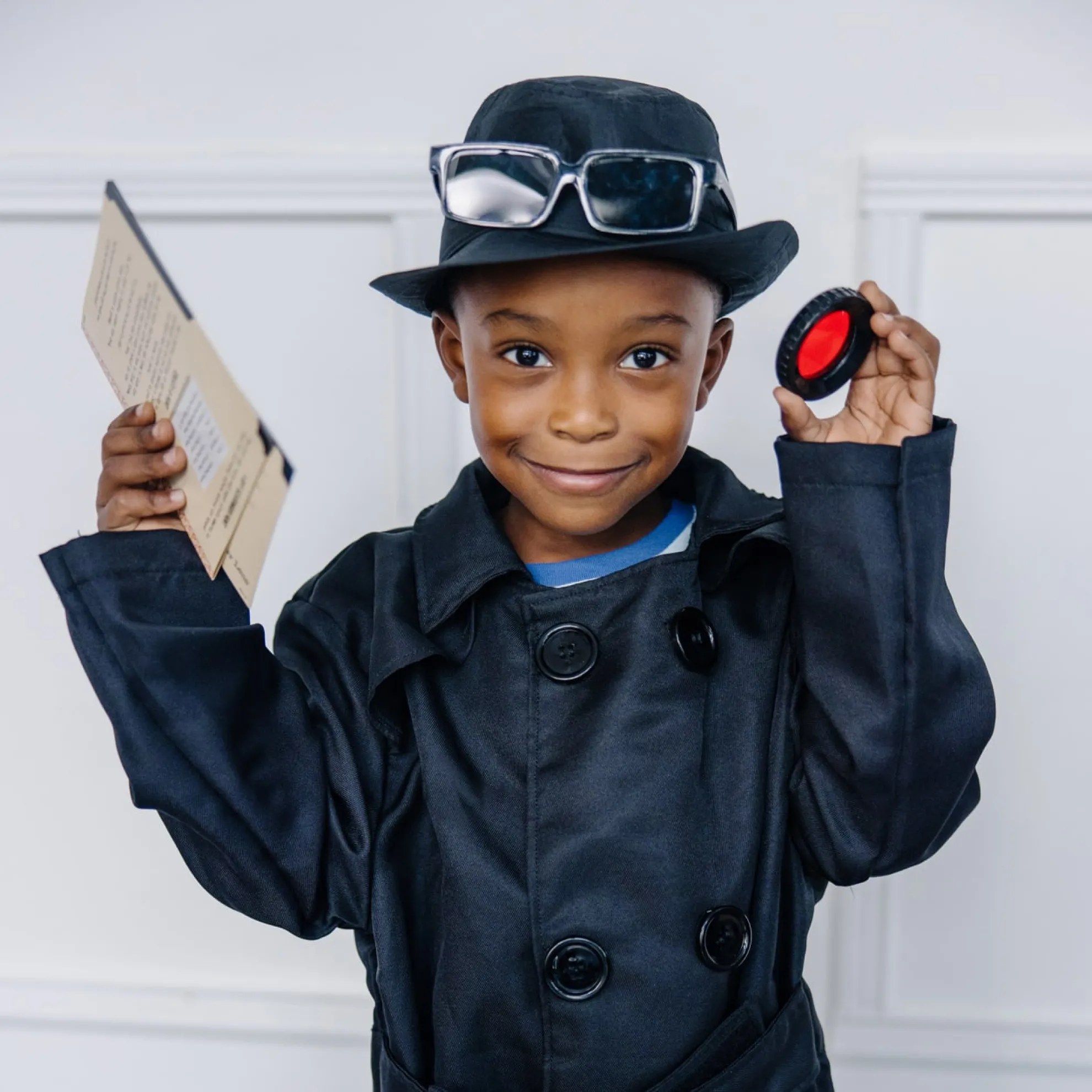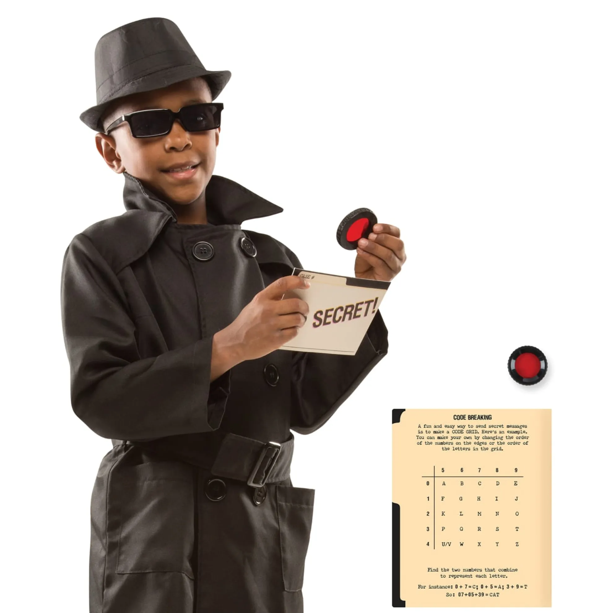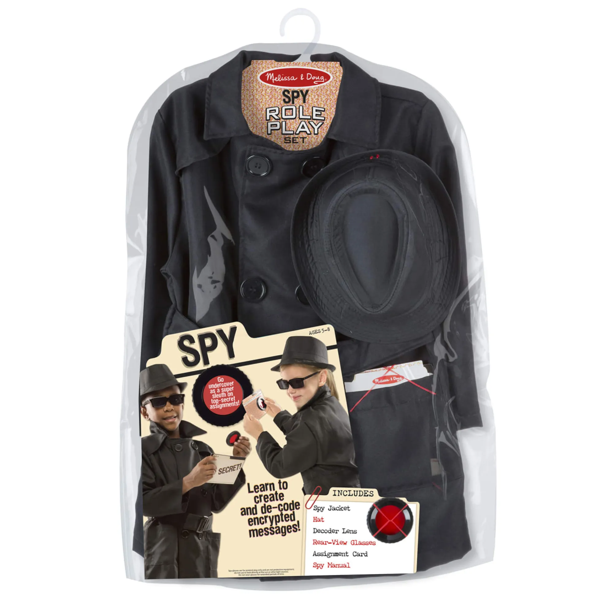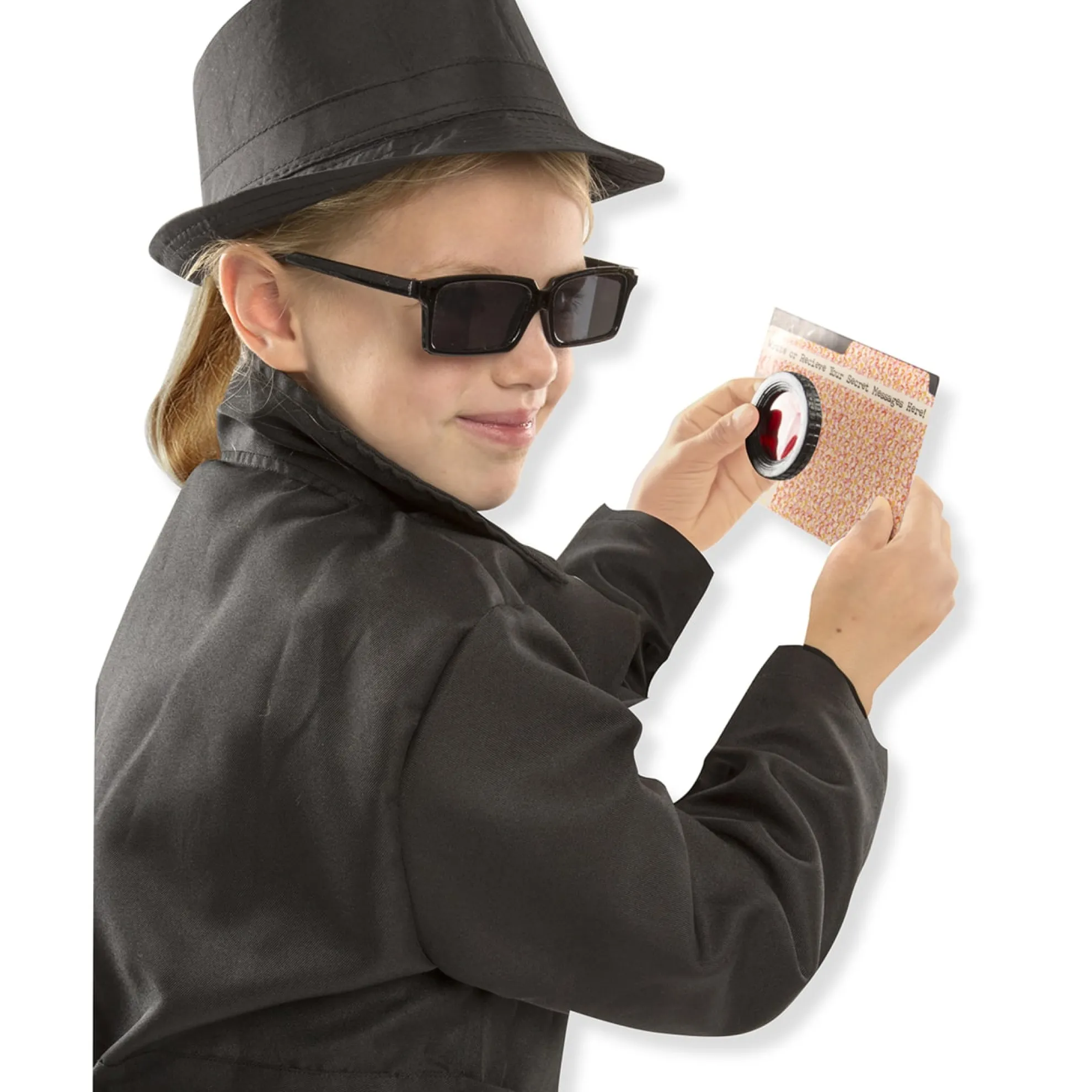 - Includes black spy jacket, hat, rear-view mirrored sunglasses, secret coded message card, decoder lens, spy guide