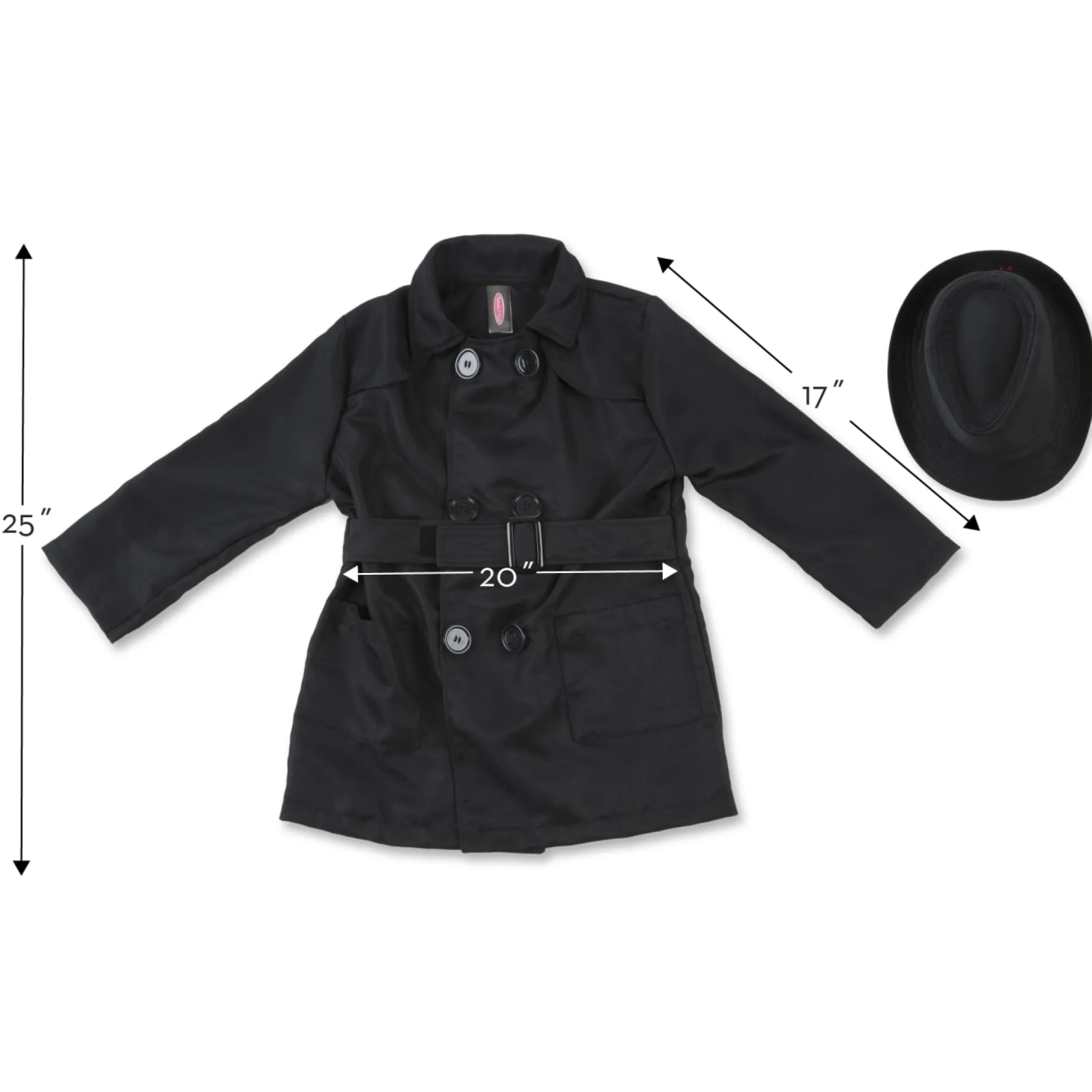 Super sleuths will find everything they need to be sly spies on top secret assignment with this undercover role play set! The costume includes a black trench coat and fedora hat, made with high quality fabric and sturdily constructed, sized to fit ages five to eight. Rear-view sunglasses add a cool touch while allowing detectives to see what’s happening behind them! Keep busy with a secret coded message card, a decoder lens, and a spy assignment guide.