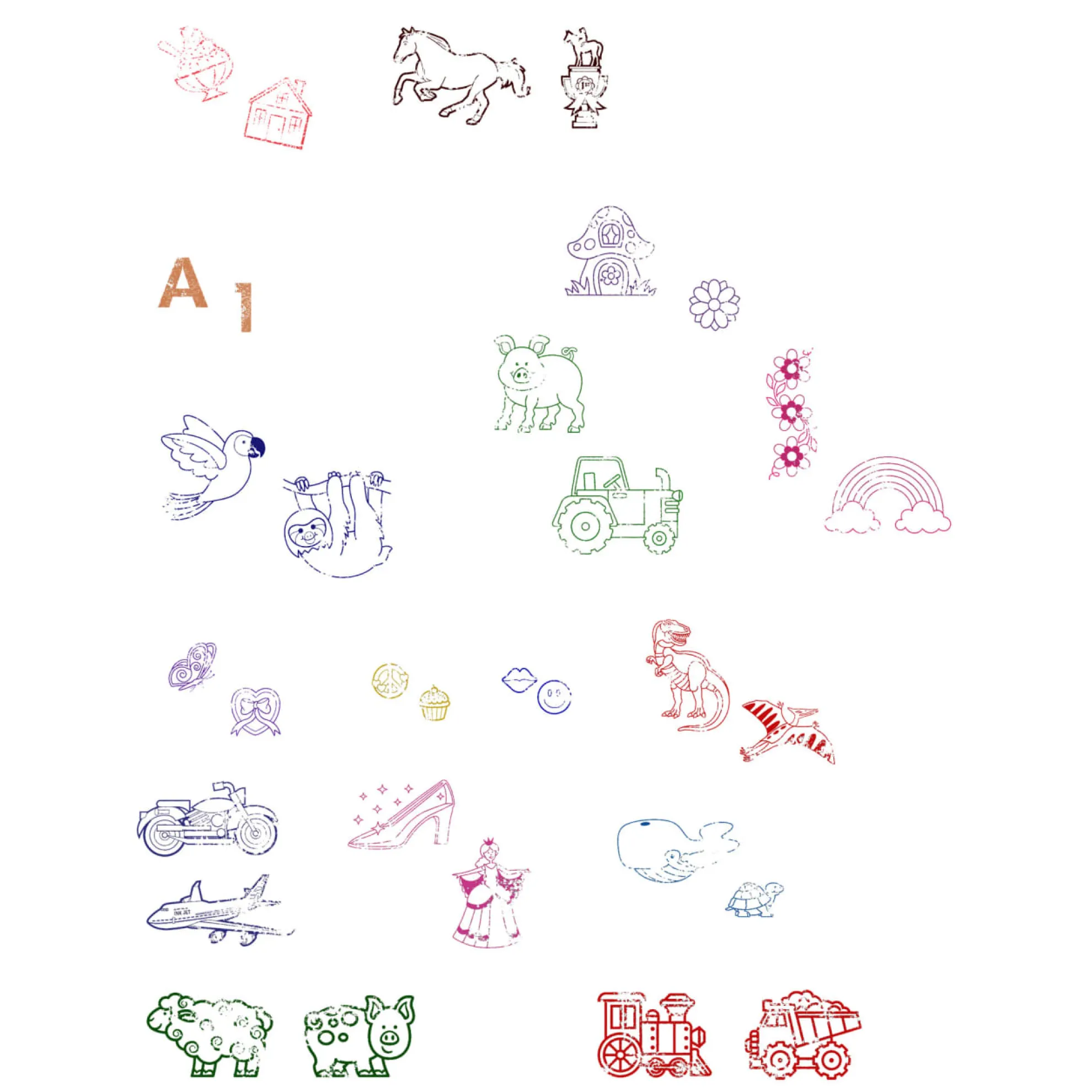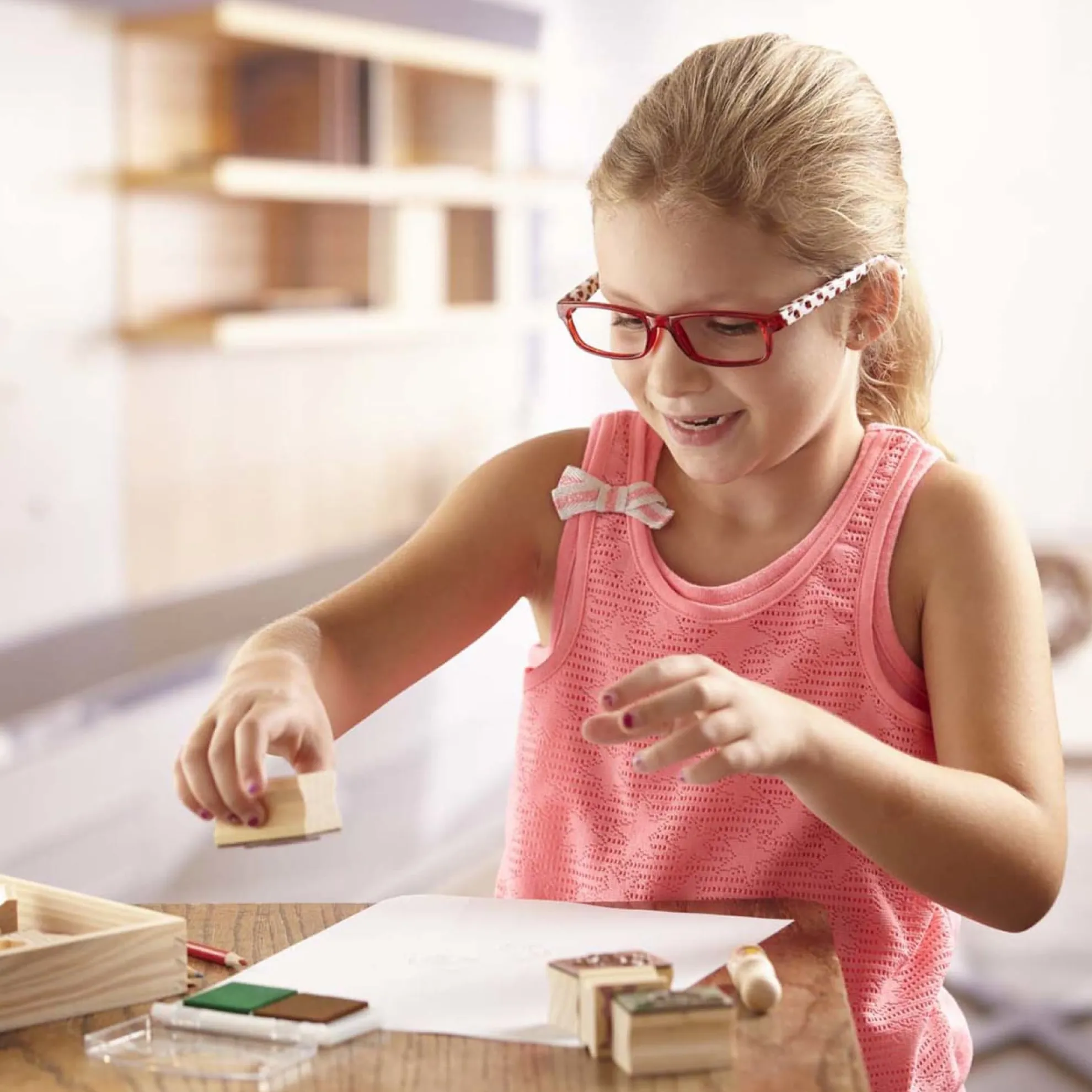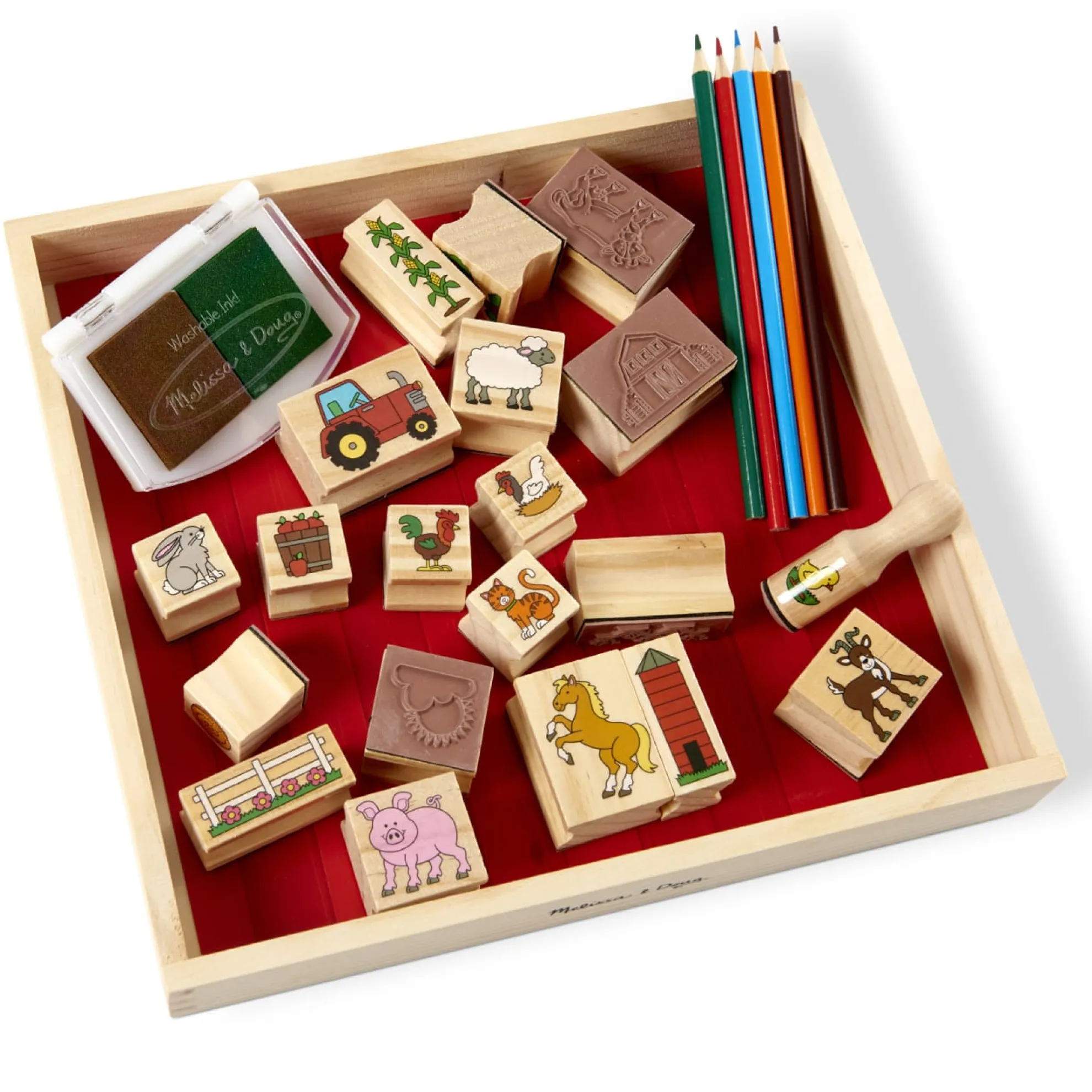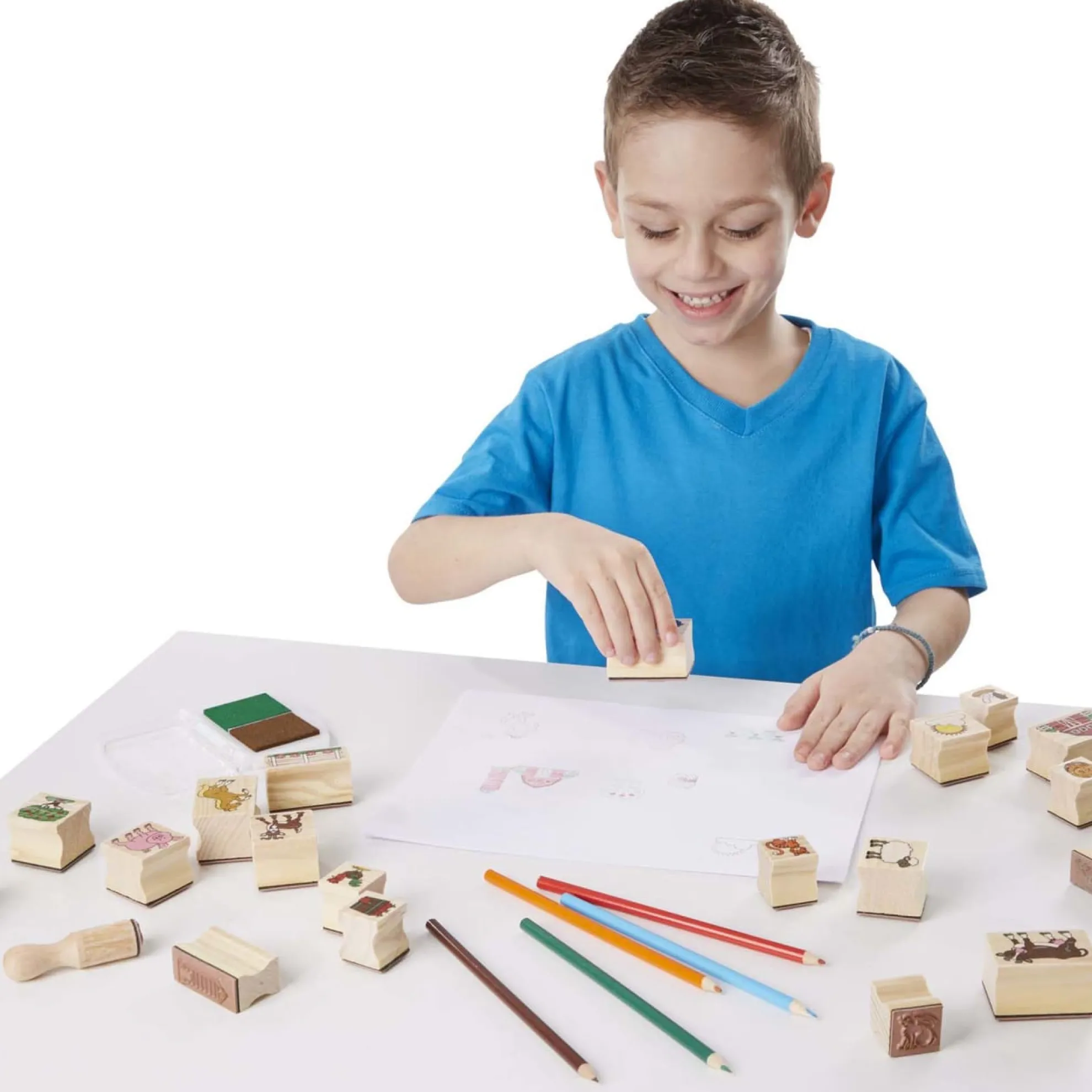 - Includes 20 stamps, 5 colored pencils, durable 2-color stamp pad, and wooden storage tray.