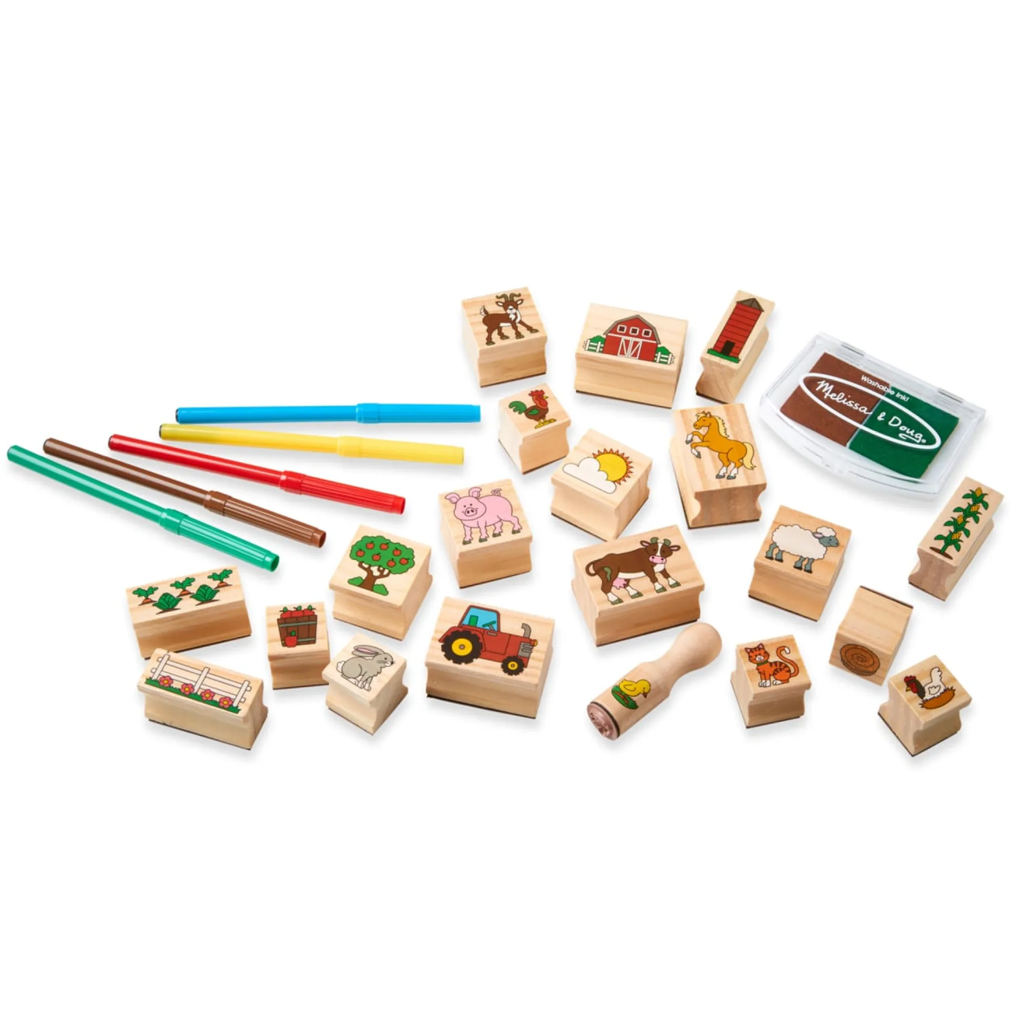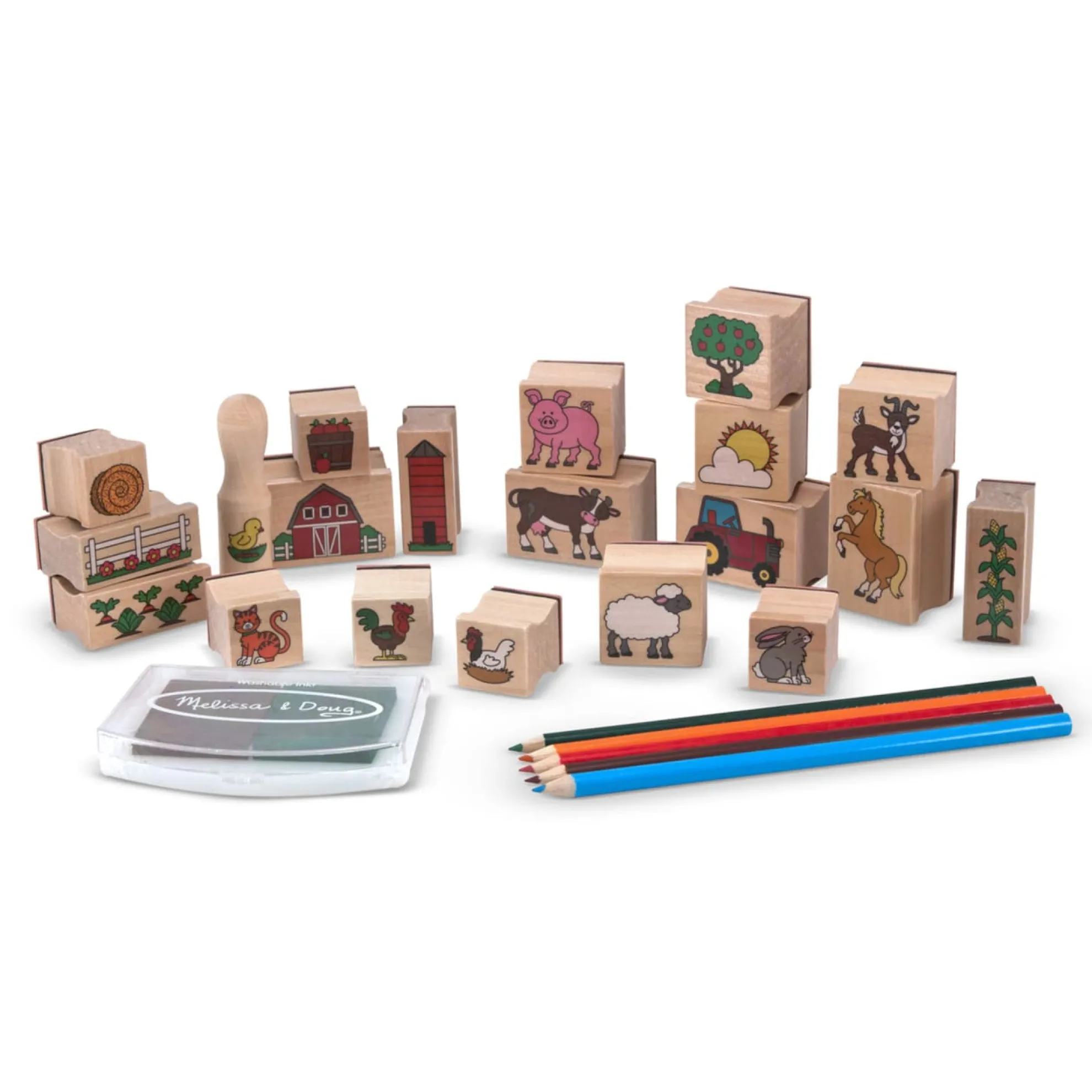 A barn, tractor, sheep, bunny, pig, and a barn’s worth of animals and crops come in this color-in stamp set for kids! This extra-large set of wooden stamps makes it easy to create an exciting storyline or a color-in scene: It includes 20 rubber-faced, wooden-handled outline stamps and a two-color stamp pad with brown and green washable ink. Five colored pencils coordinate with the farm theme to add details and color in the barnyard scene. It’s a complete arts & crafts activity and storytelling kit in one!