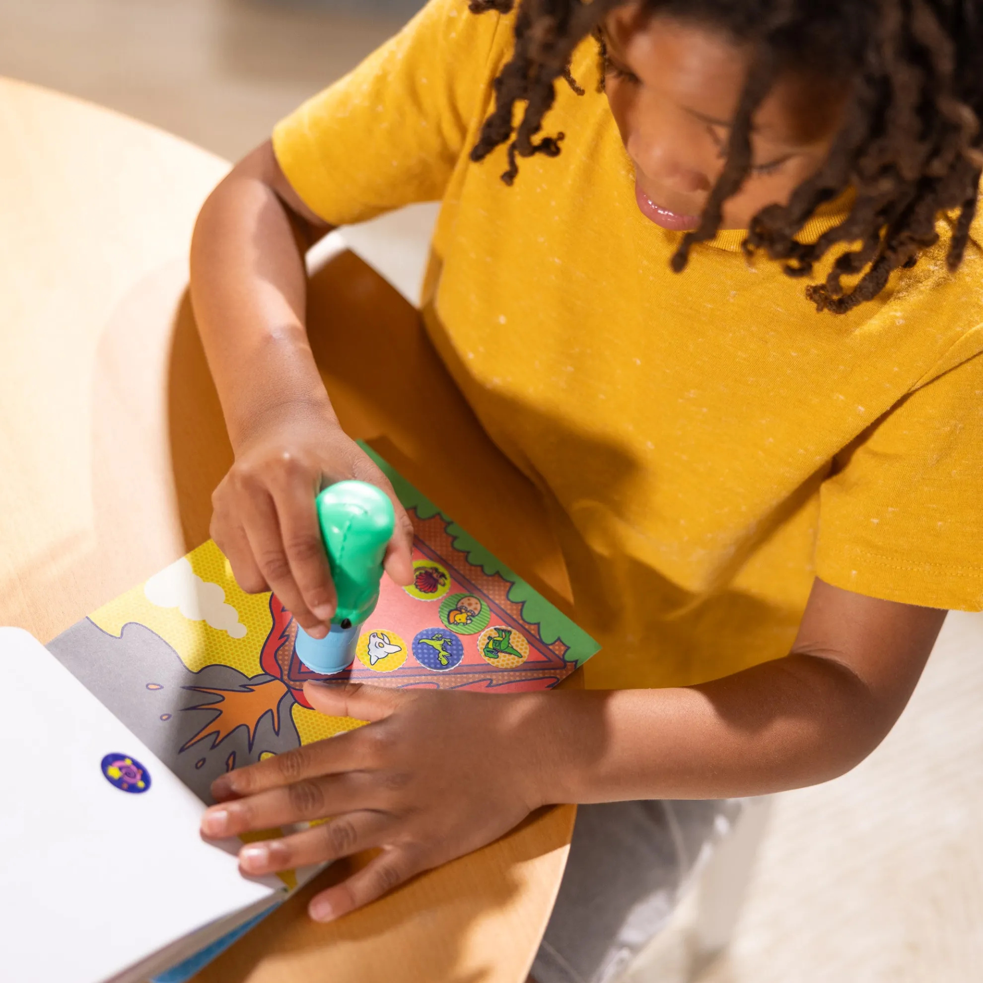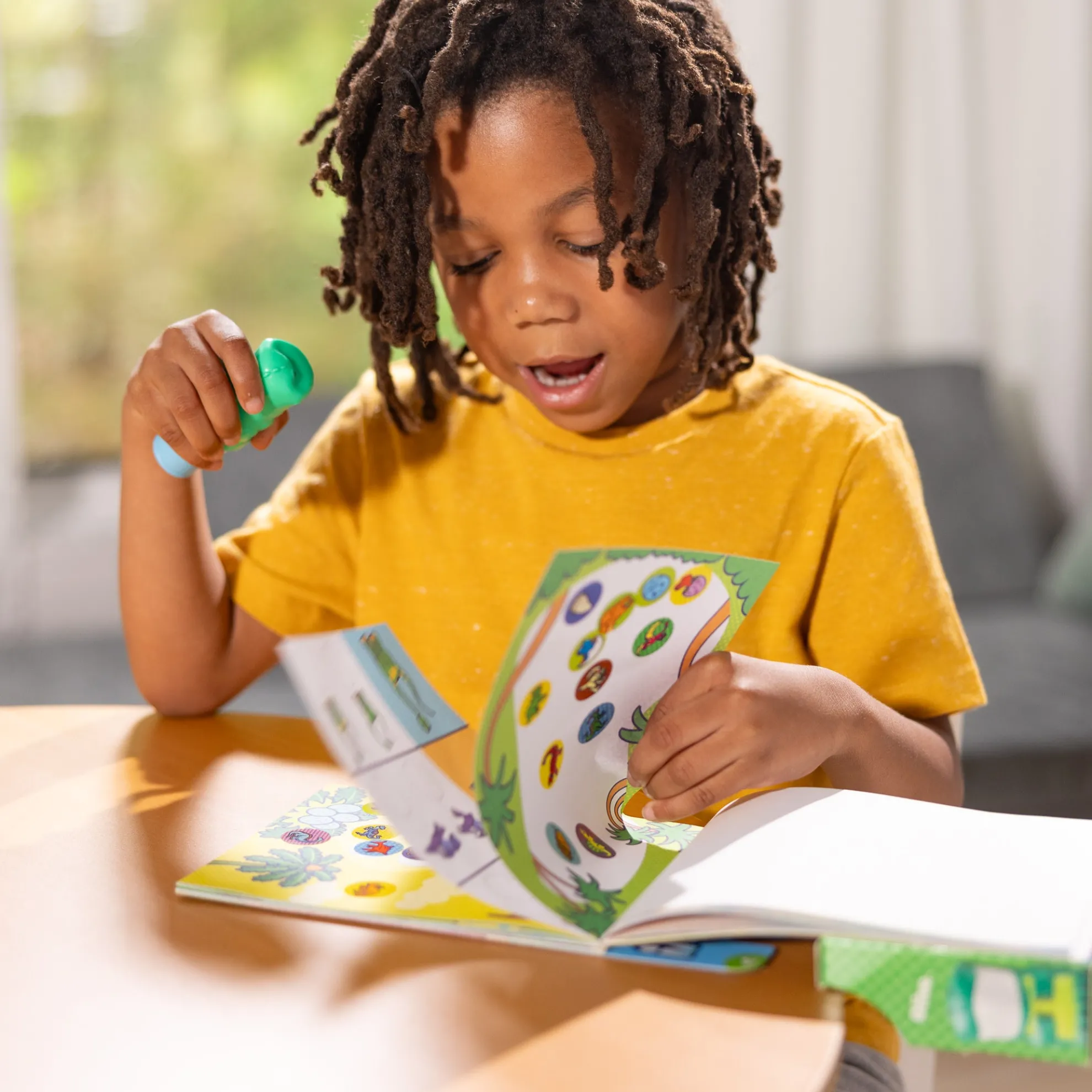 Melissa & Doug Sticker WOW!™ is a whole new way to play with stickers! Let the adorable, collectible Olive the Dinosaur stamp, stamp, stamp its way through 24 pages of fun-filled, prehistoric-themed counting, matching, and search-and-find activities. The refillable sticker stamper comes pre-loaded with a sticker stack of 300 assorted stickers – with 100 unique designs in every stack, each sticker is a surprise! Themed refill packs are sold separately and are compatible with any Sticker WOW!™ sticker stamper. Stickers are not reusable, but are easy to remove if necessary. Fill in the activity pages and use for creative art projects, such as bookmarks, posters, cards, and more. Easy-to-remove stickers and the convenient on-the-go format with built-in sticker stamper storage makes Sticker WOW!™ (patent pending) a great mess-free travel activity. Sticker WOW!™ promotes fine motor skills, encourages creative play, and it’s satisfying, fidget fun!