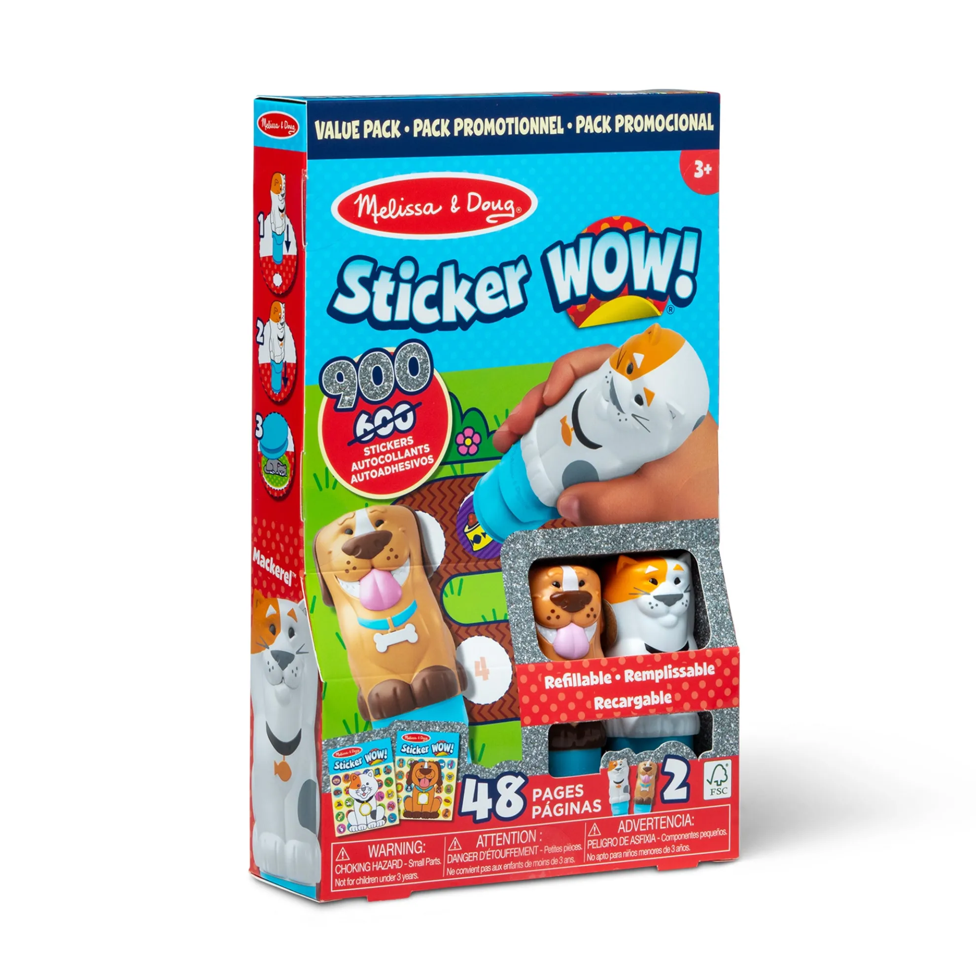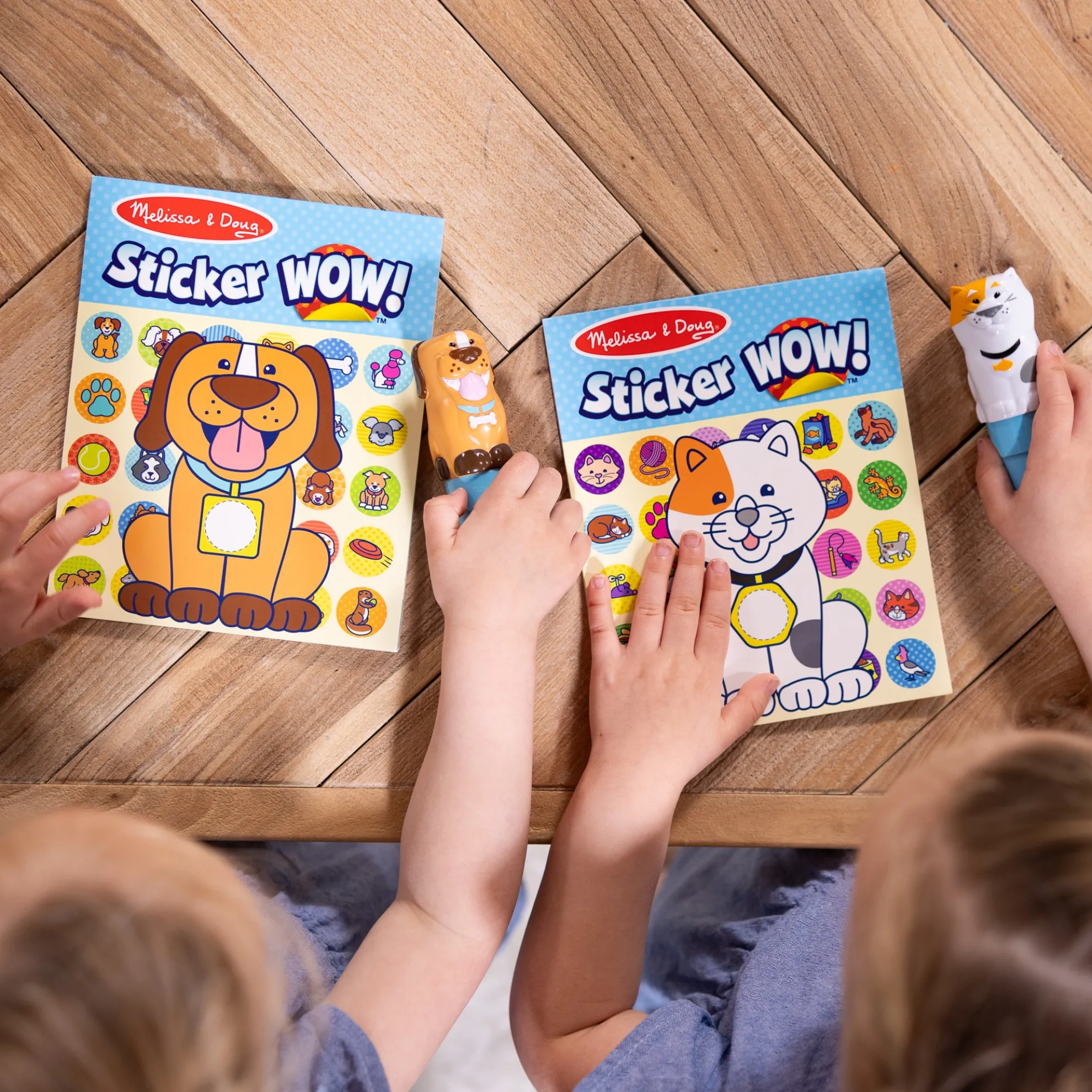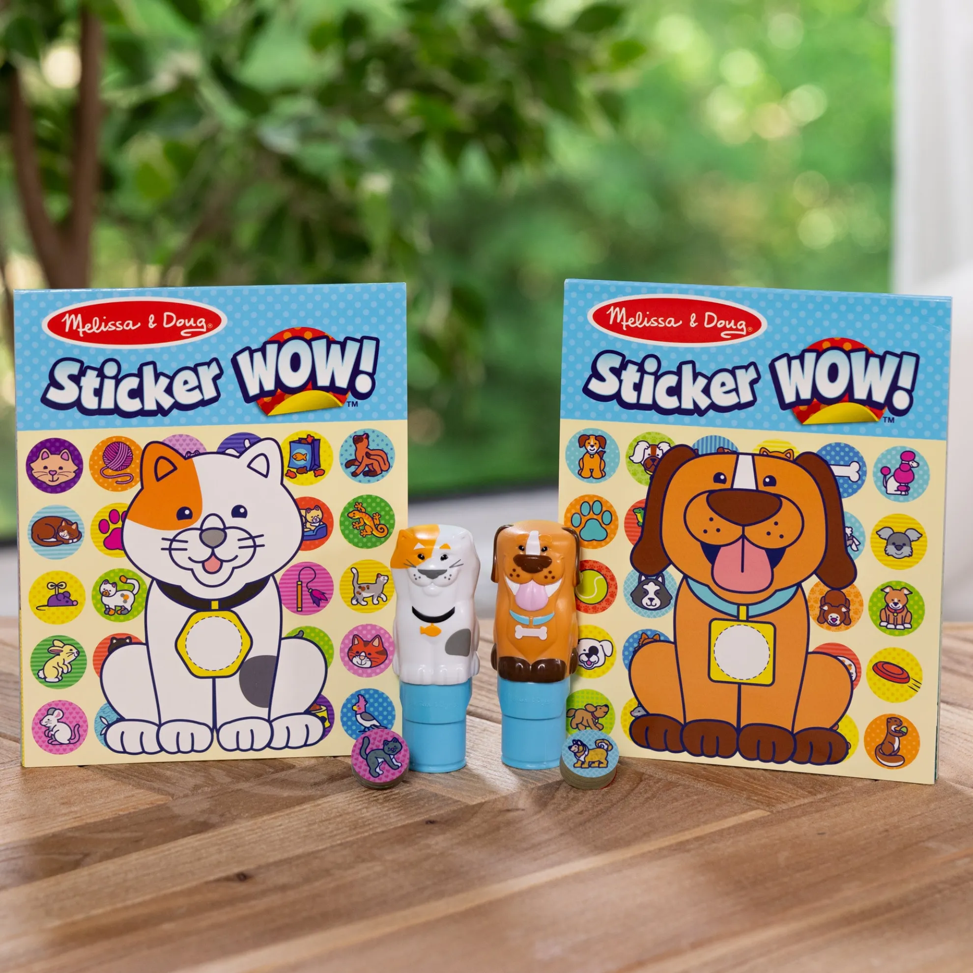 - Melissa & Doug Sticker WOW!™ is a whole new way to play with stickers – have twice the fun with TWO cute, collectible characters to stamp pet-themed stickers on TWO 24-page Cat and Dog activity pads and on other creative art projects