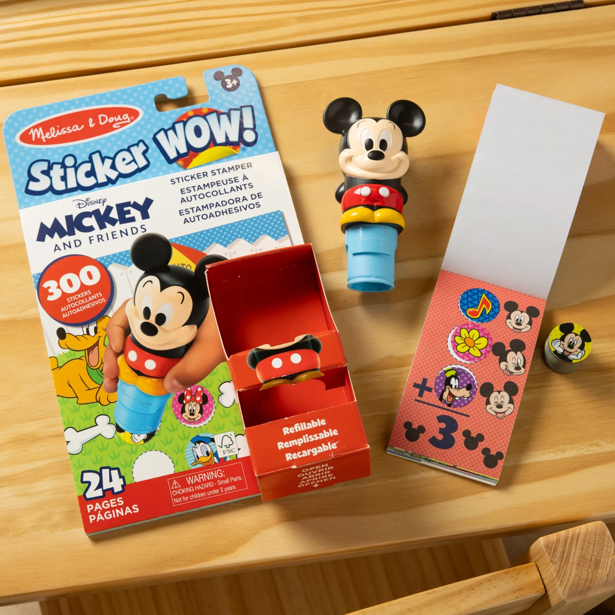- Melissa & Doug Sticker WOW!™ is a whole new way to play with stickers – use the cute, collectible character to stamp Disney Mickey Mouse-themed stickers on the 24-page Disney activity pad, the additional 24-page mini activity pad, and on other creative art projectsBundle includes Sticker WOW!™ Disney Mickey Mouse collectible sticker stamper preloaded with