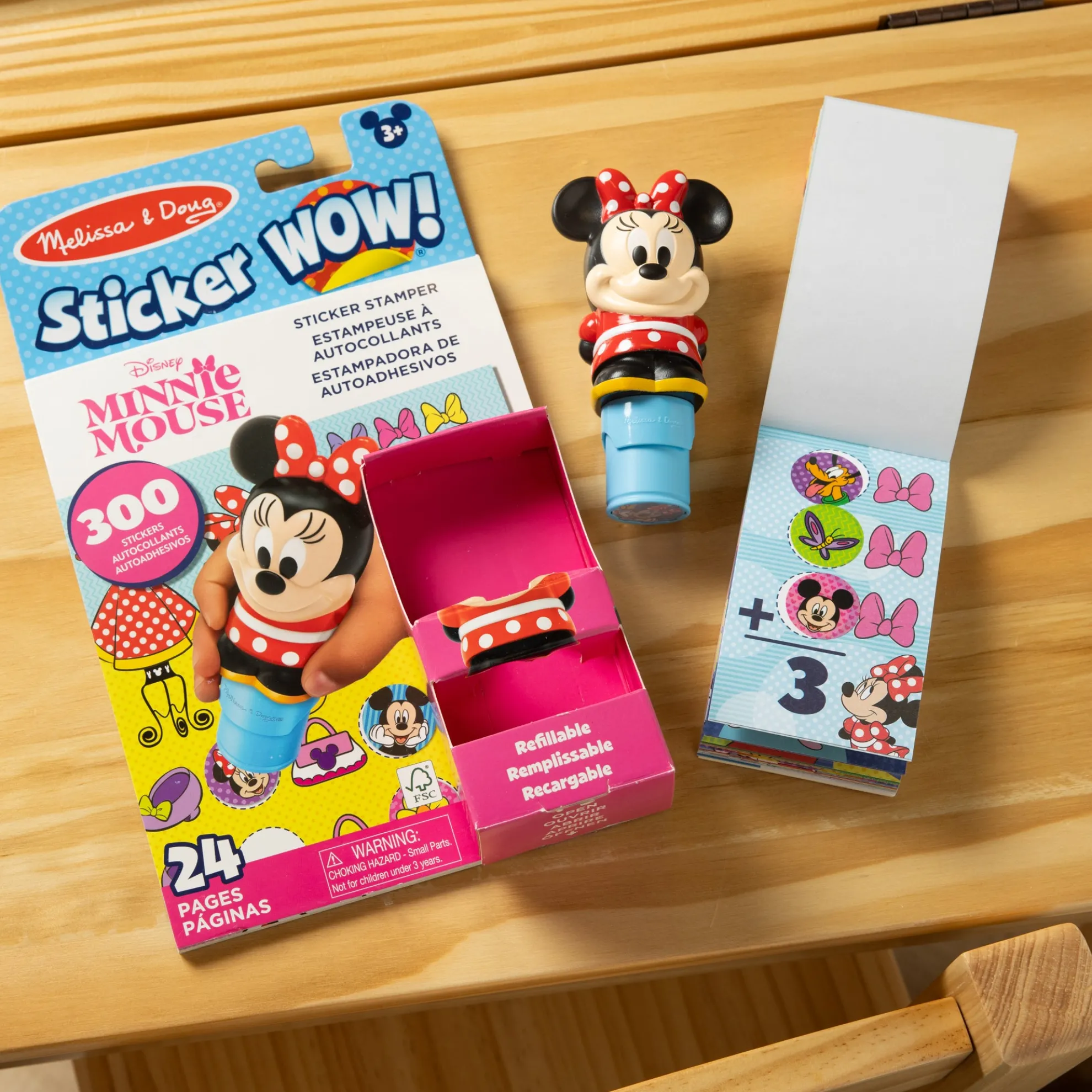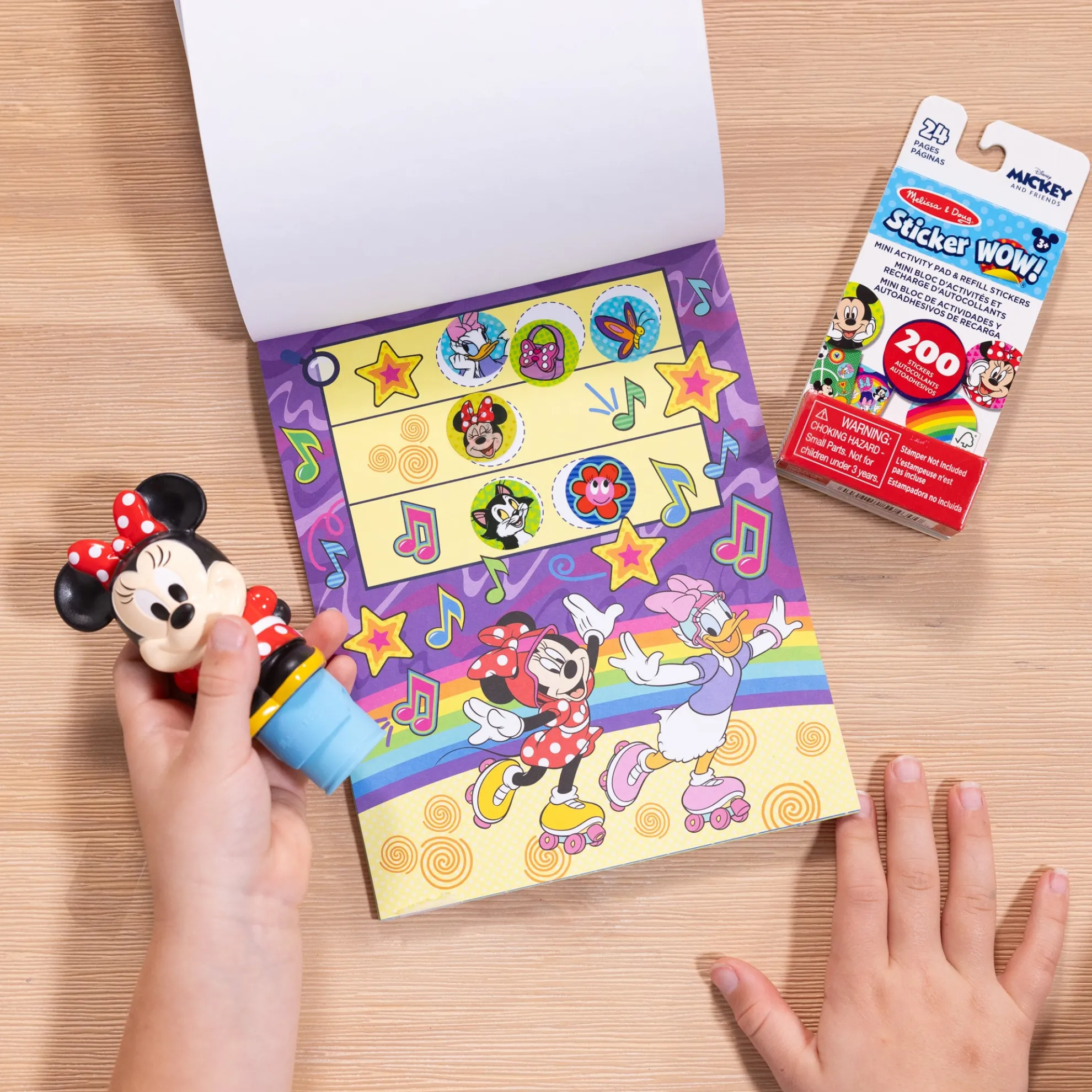 - Melissa & Doug Sticker WOW!™ is a whole new way to play with stickers – use the cute, collectible character to stamp Disney Mickey Mouse-themed stickers on the 24-page Disney activity pad, the additional 24-page mini activity pad, and on other creative art projectsBundle includes Sticker WOW!™ Disney Mickey Mouse collectible sticker stamper preloaded with 300 easy-to-remove stickers (100 unique Disney-themed designs), 24-page activity pad, 200 extra refill stickers (500 stickers total), and an additional 24-page mini activity pad
