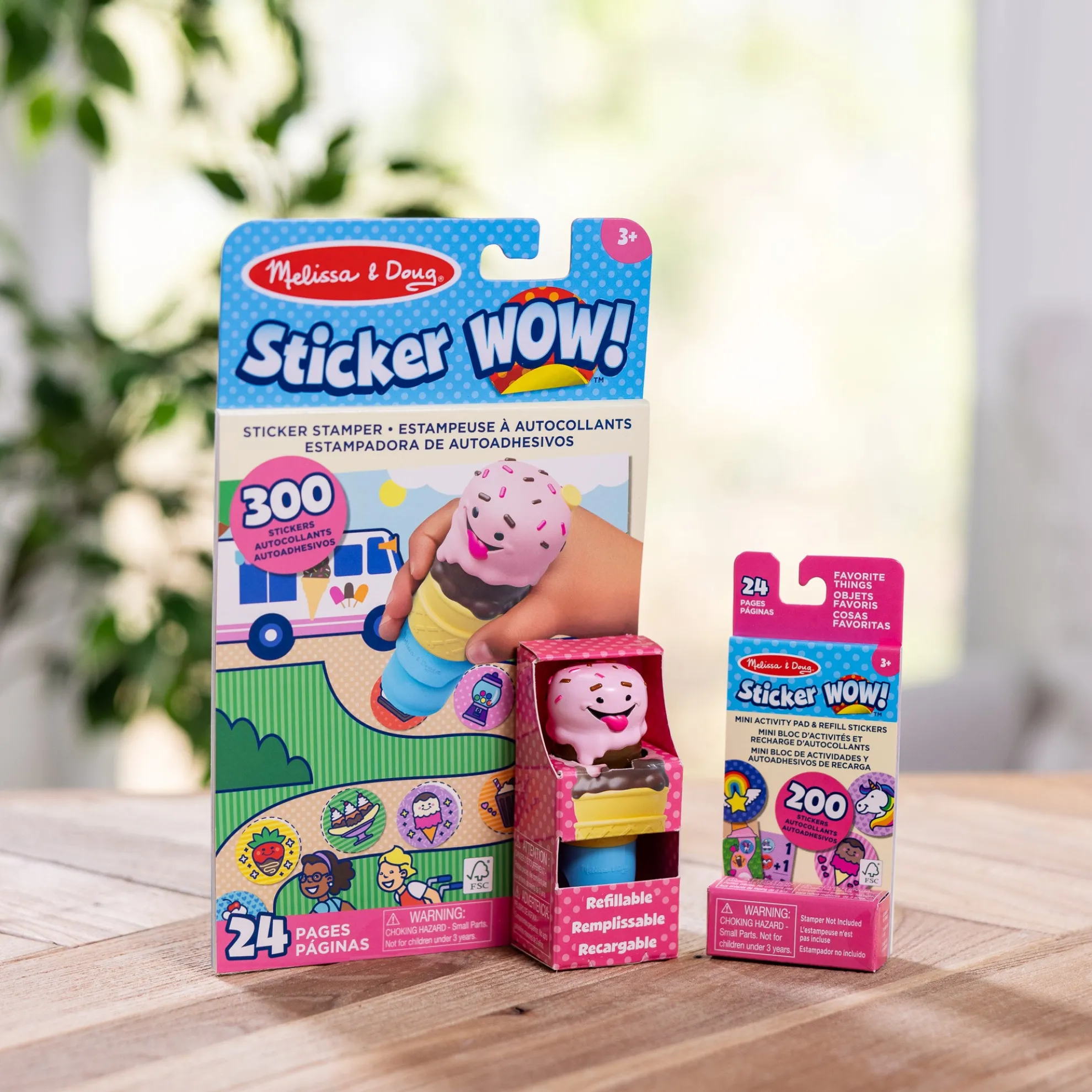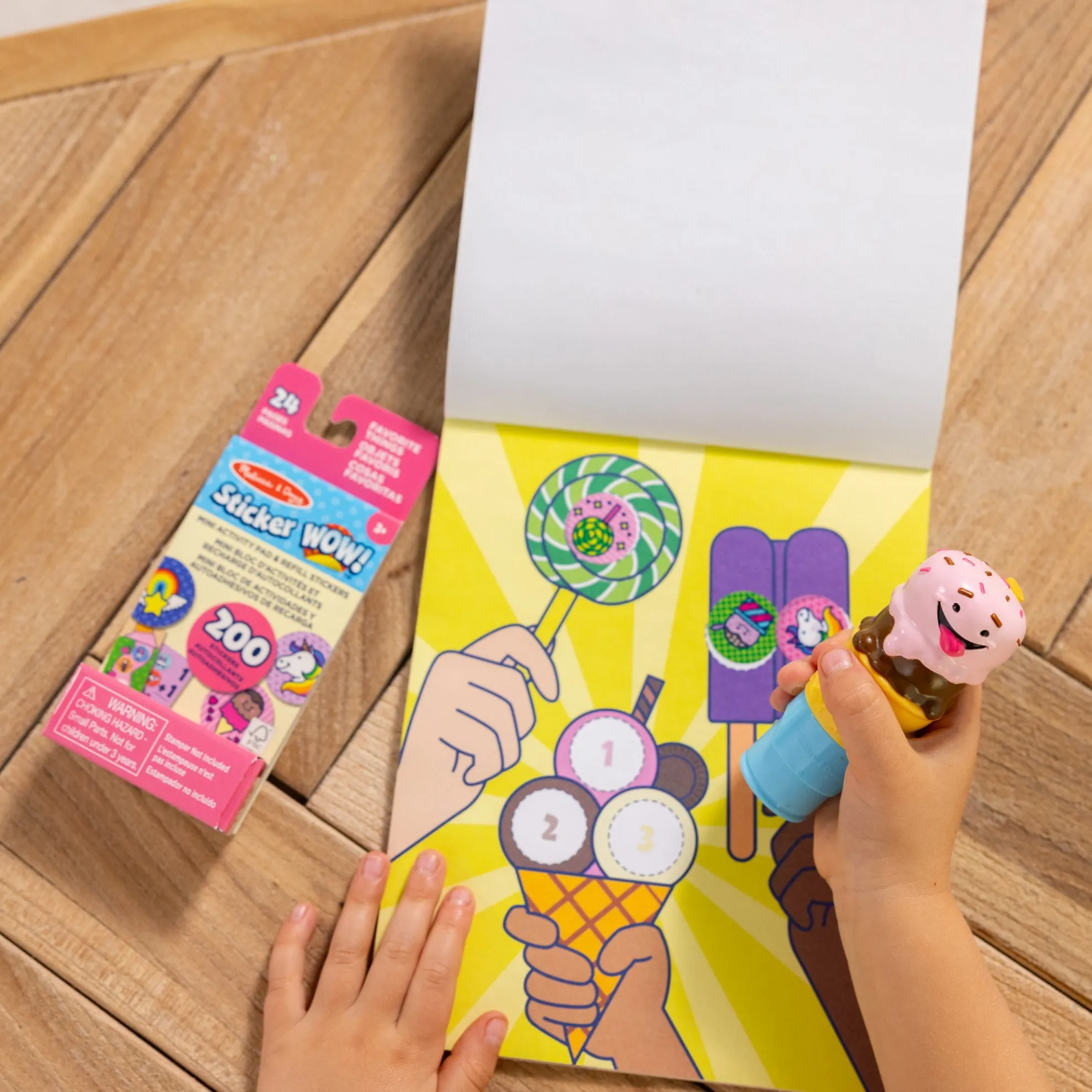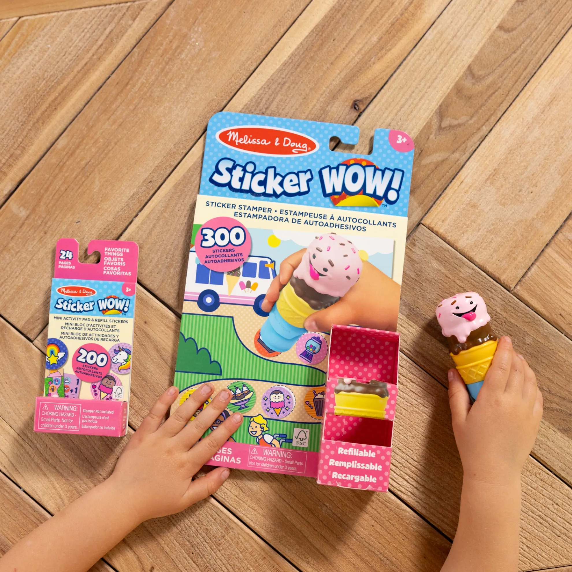 - Melissa & Doug Sticker WOW!™ is a whole new way to play with stickers – use the cute, collectible character to stamp favorite things-themed stickers on the 24-page Ice Cream activity pad, the additional 24-page mini activity pad, and on other creative art projects