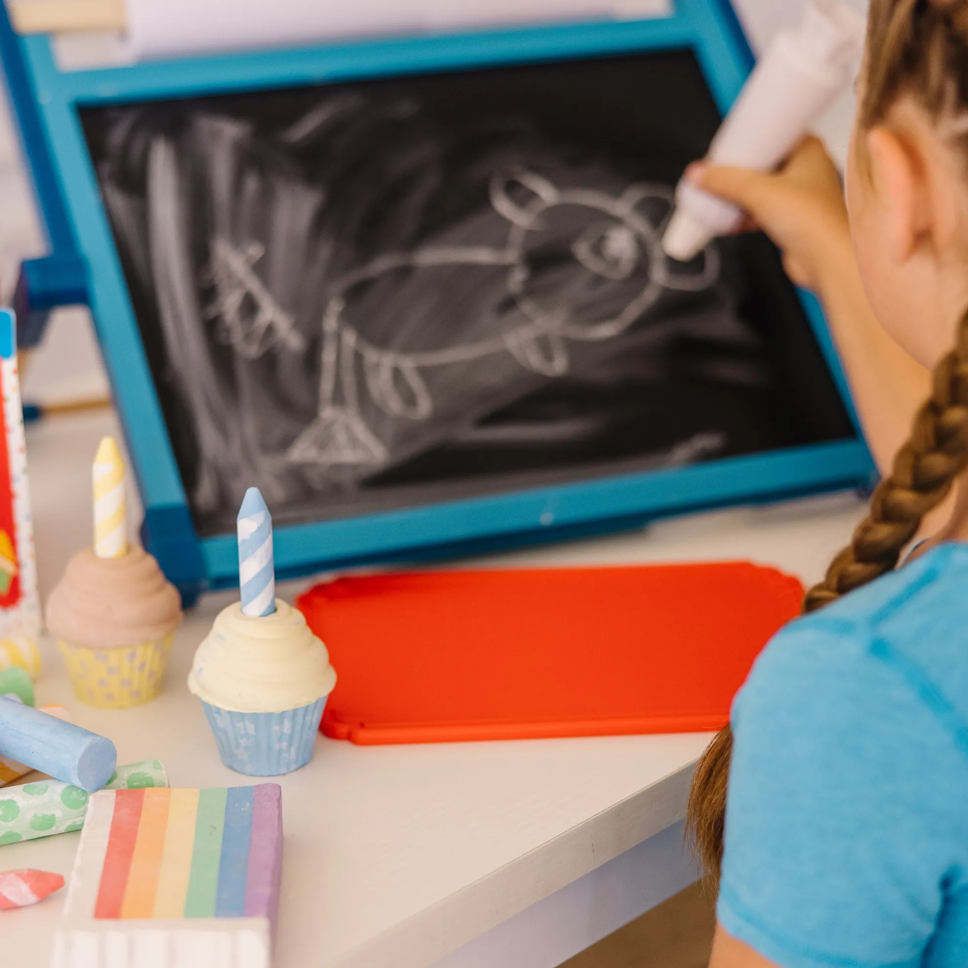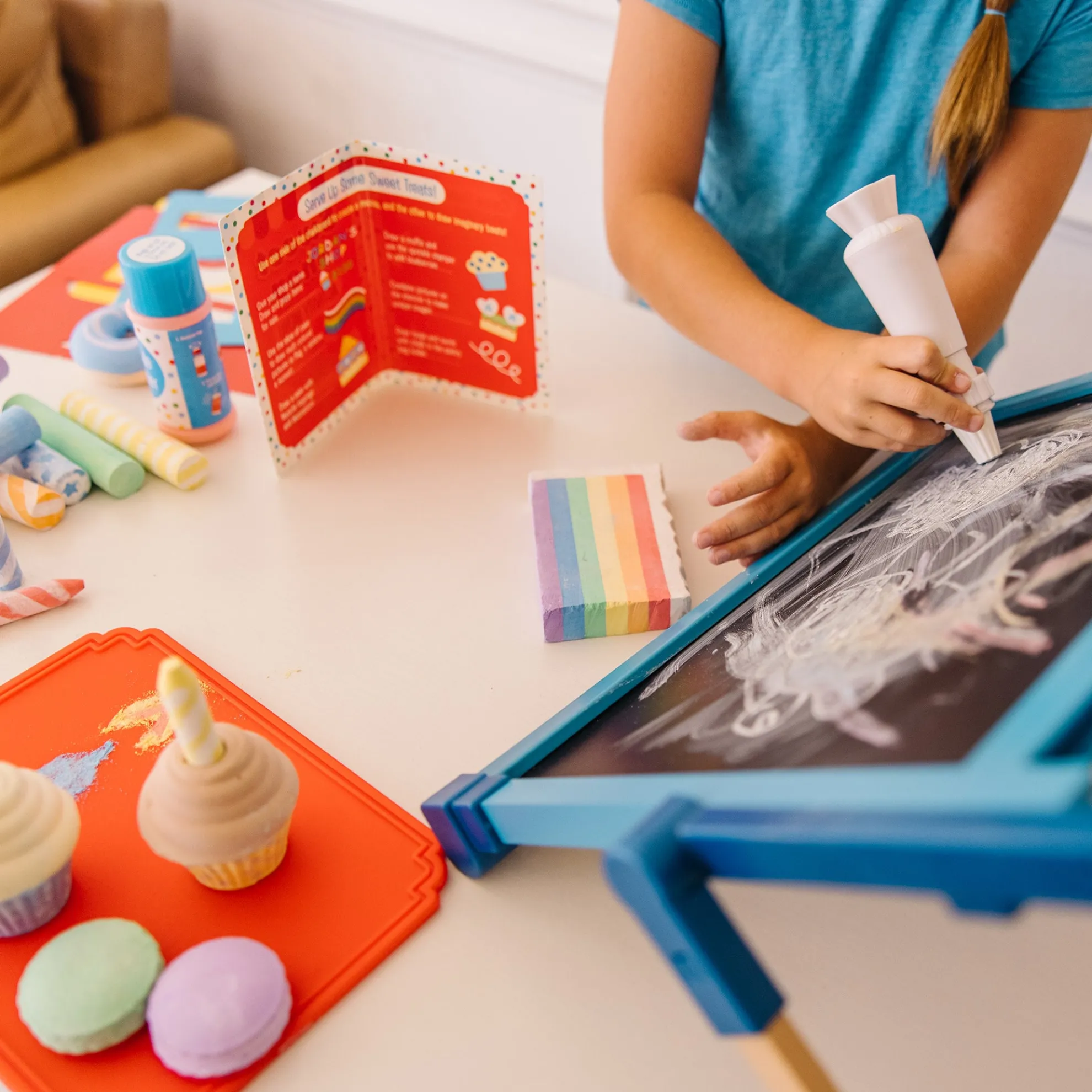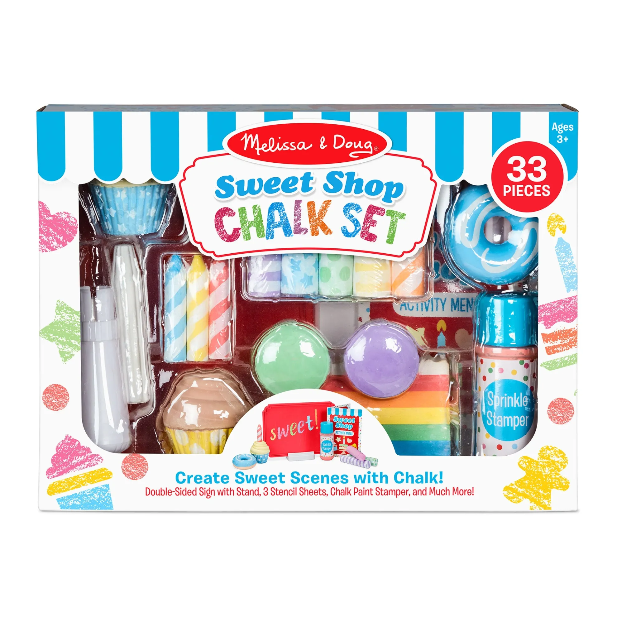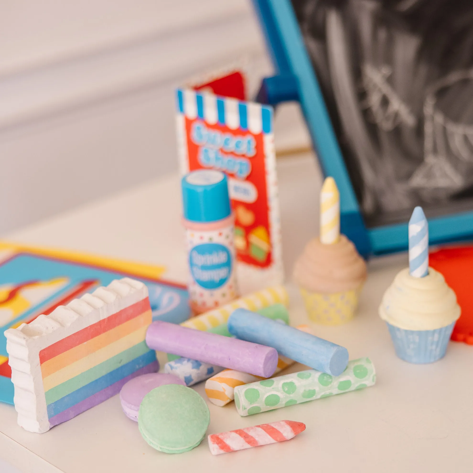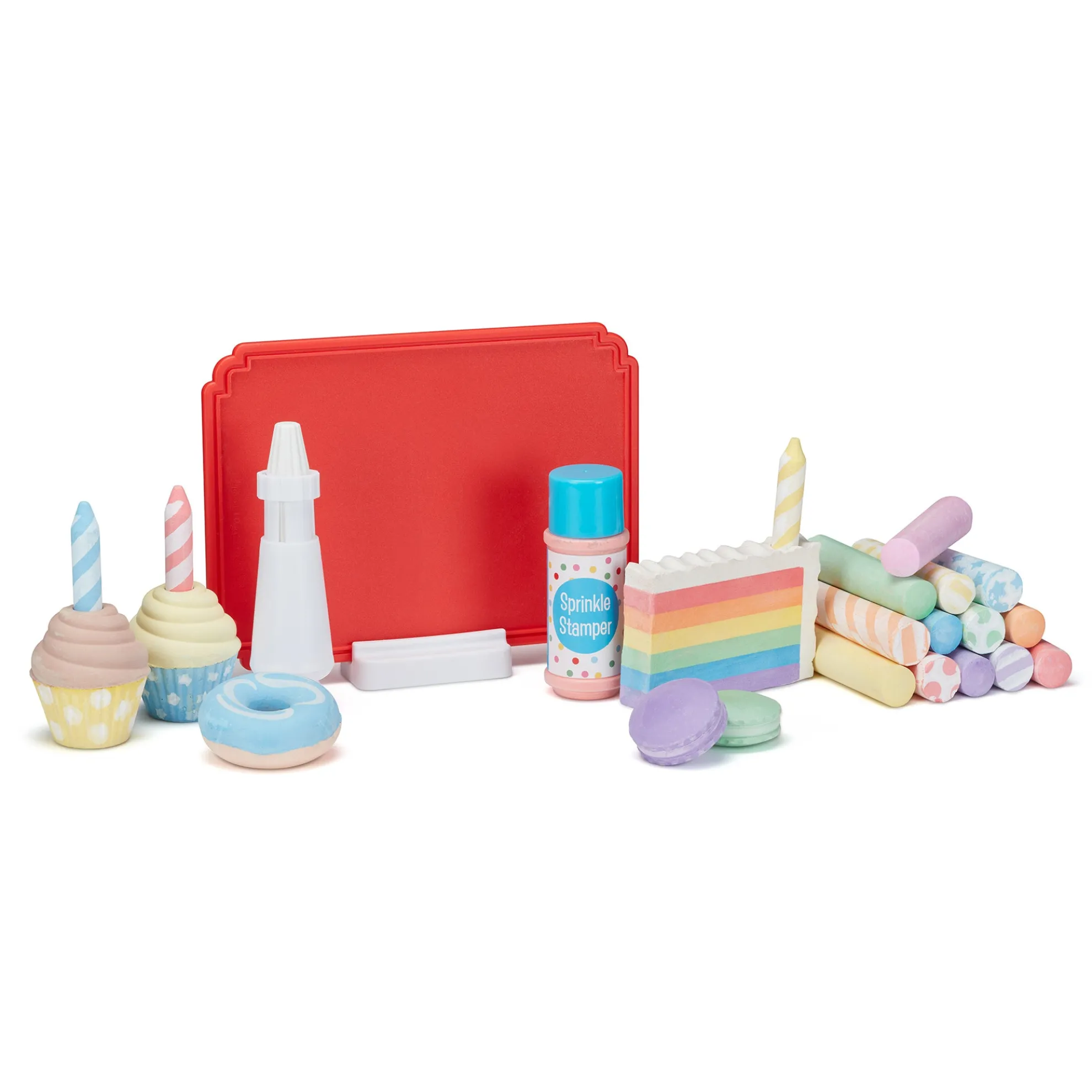 - 33-piece set includes jumbo chalk sticks in a rainbow of colors, chalk shaped like cupcakes, candles, cake, cookies, donut, and frosting; activity menu with drawing and game ideas
