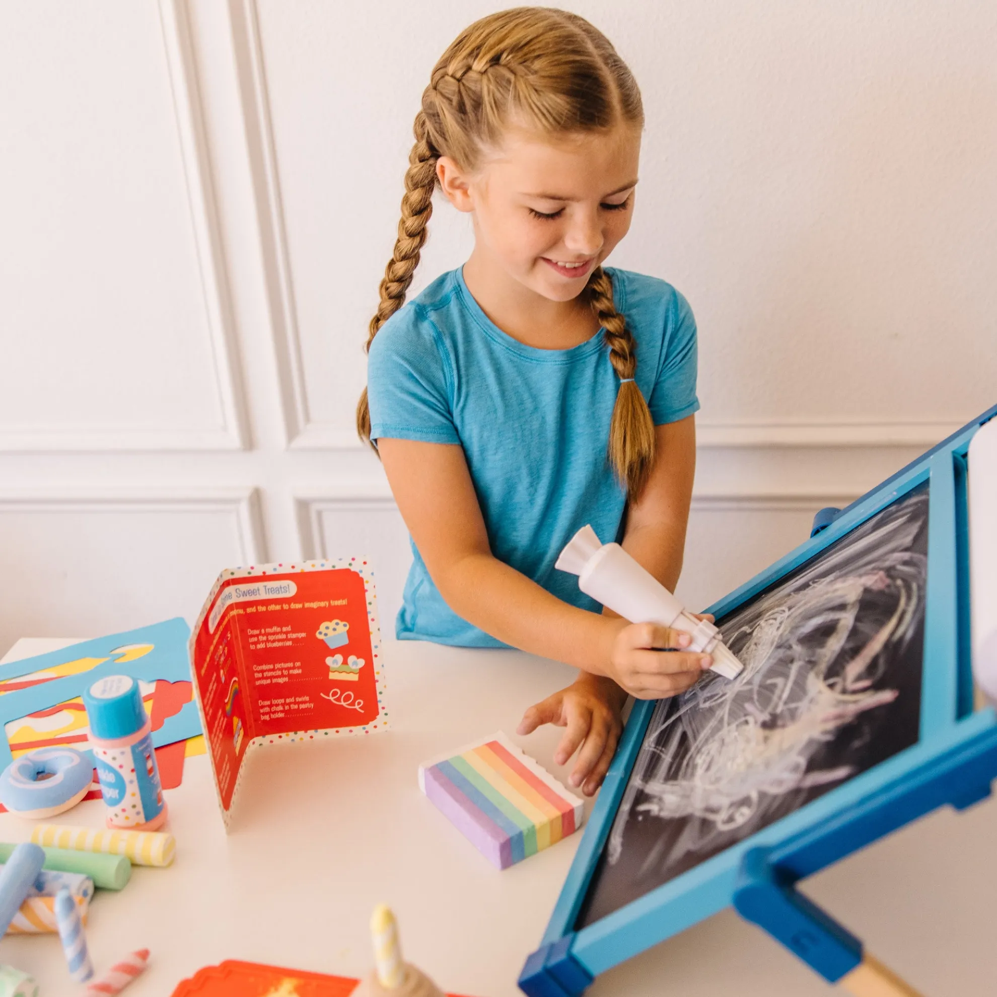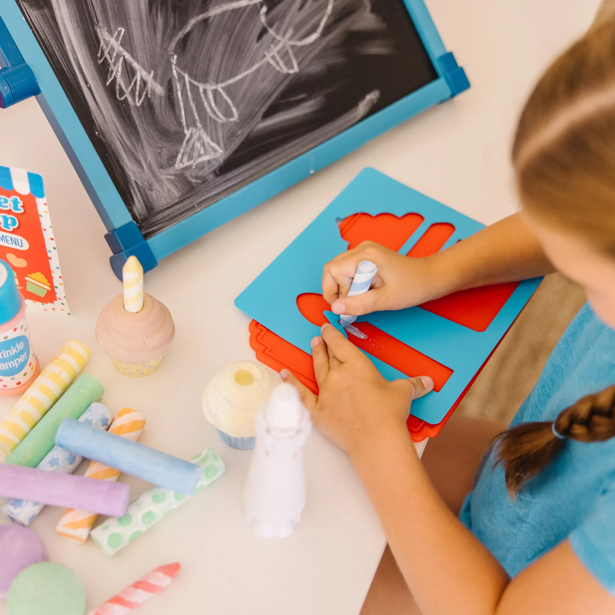 Create countless scenes with colorful chalk in “sweet” dessert shapes! Draw, trace, and stamp chalk designs with chalk cupcakes, cookies, birthday candles, frosting, donut, jumbo sticks, and more! The vibrant colors in this deliciously adorable 33-piece play set are perfect for drawing on the included sign with holder, sidewalks, driveways, or chalkboards. Trace shapes on three extra-thick stencil sheets or make quick and easy rainbow lines with the multi-colored slice of cake! Add water to the sprinkle stamper to make chalk paint polka-dots. There’s a “menu” of drawing and game ideas to help jumpstart imaginations—the possibilities are endless! Kids three and older will love creating sweet chalk designs again and again!