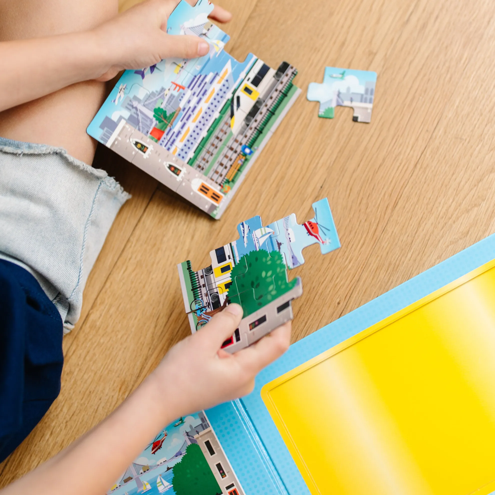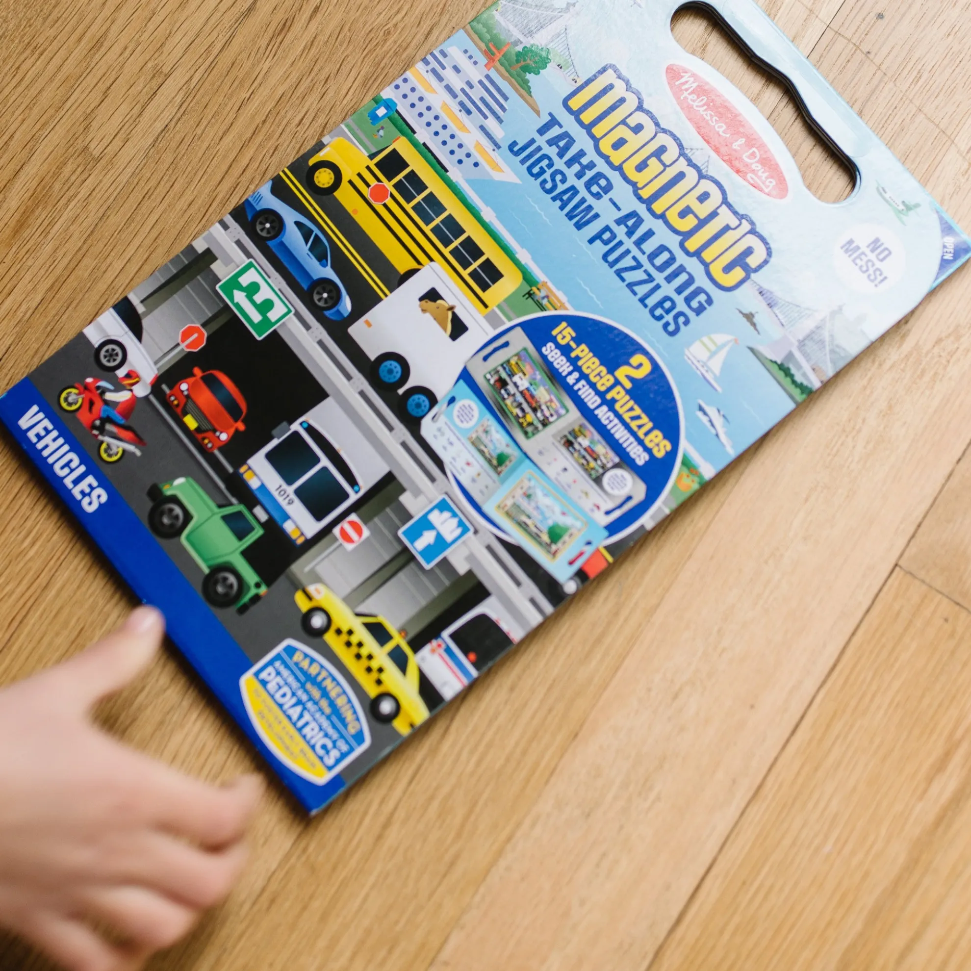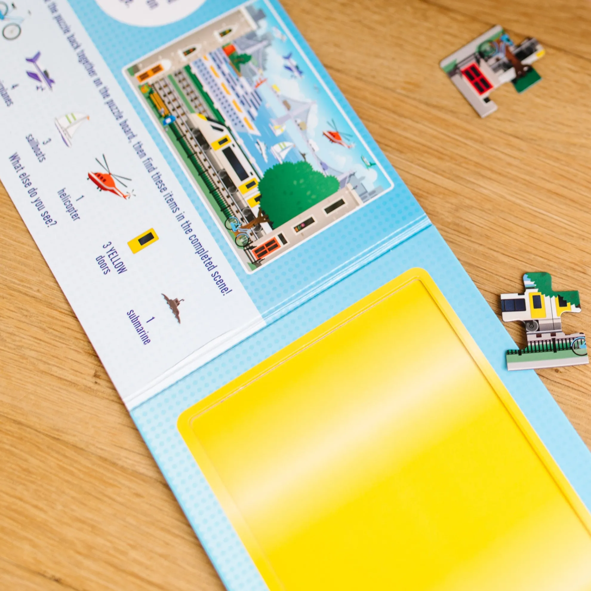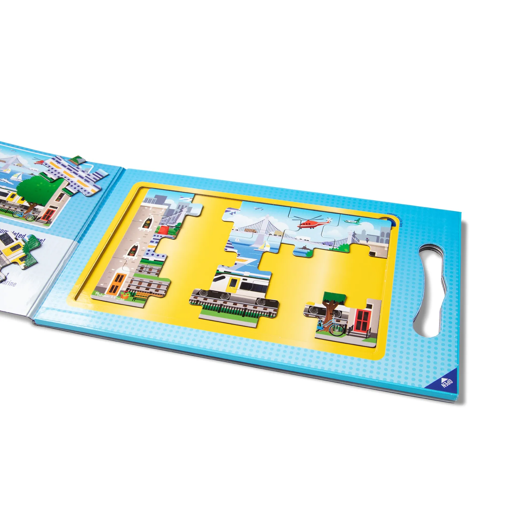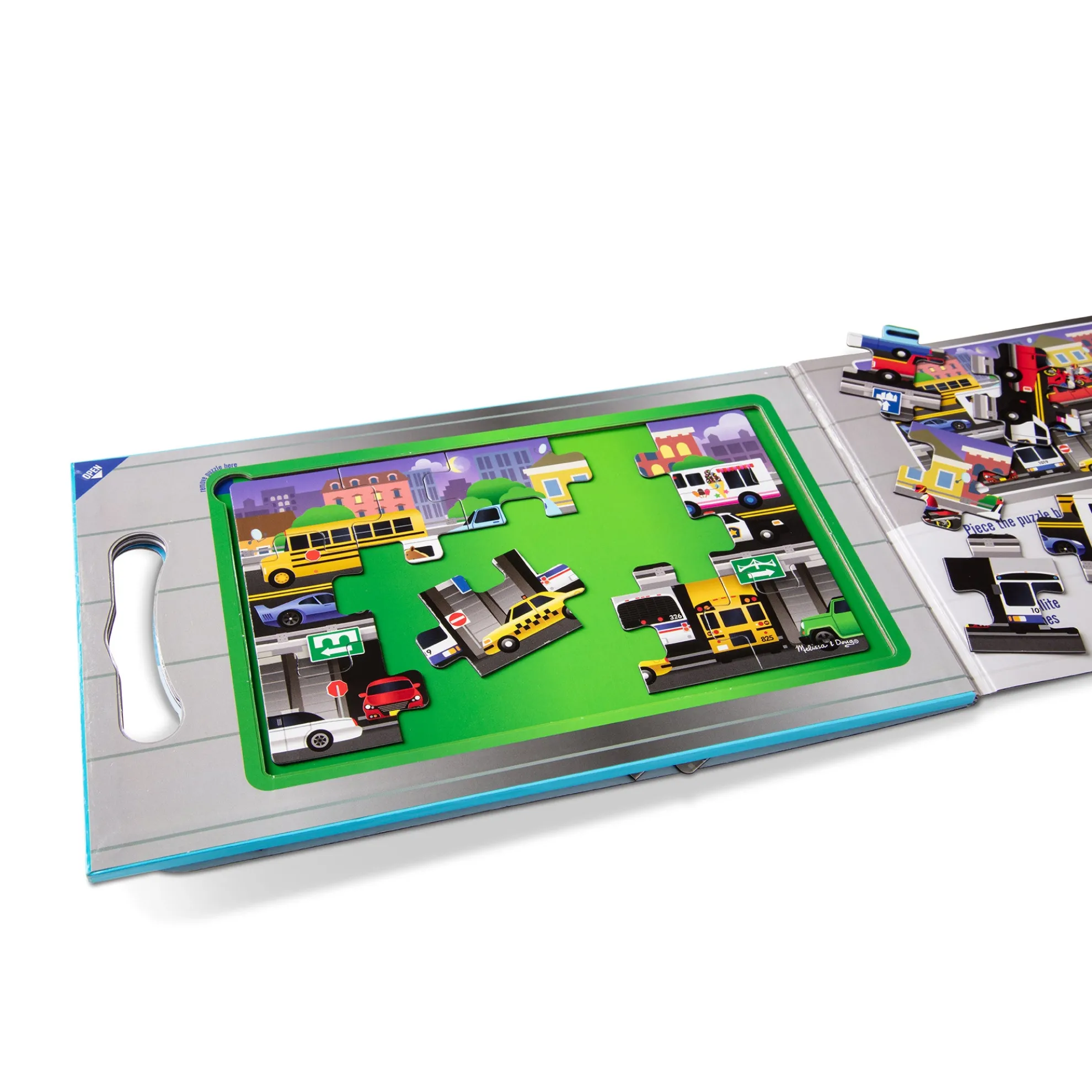 - 2 15-piece vehicle-themed magnetic jigsaw puzzles in a compact, fold-out format