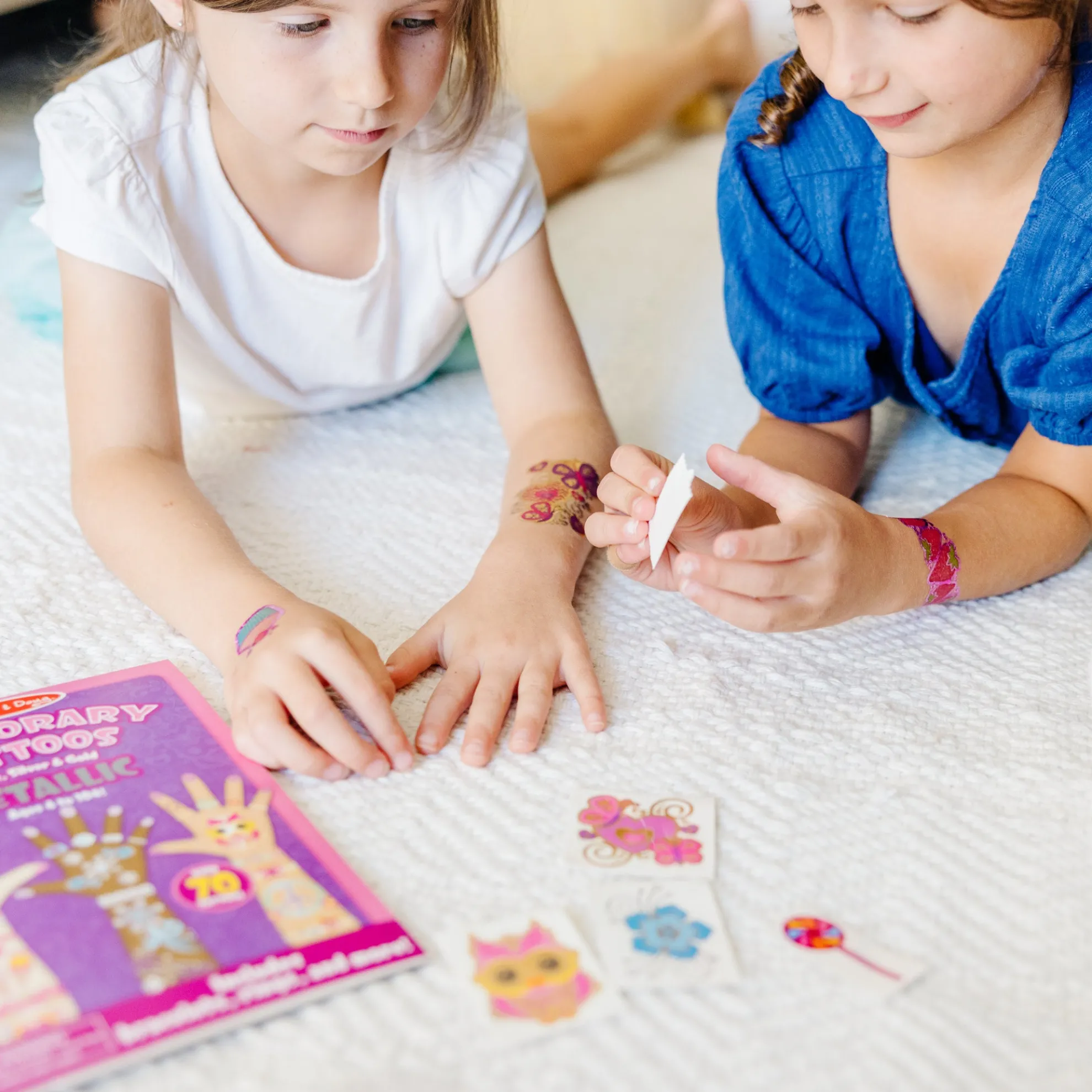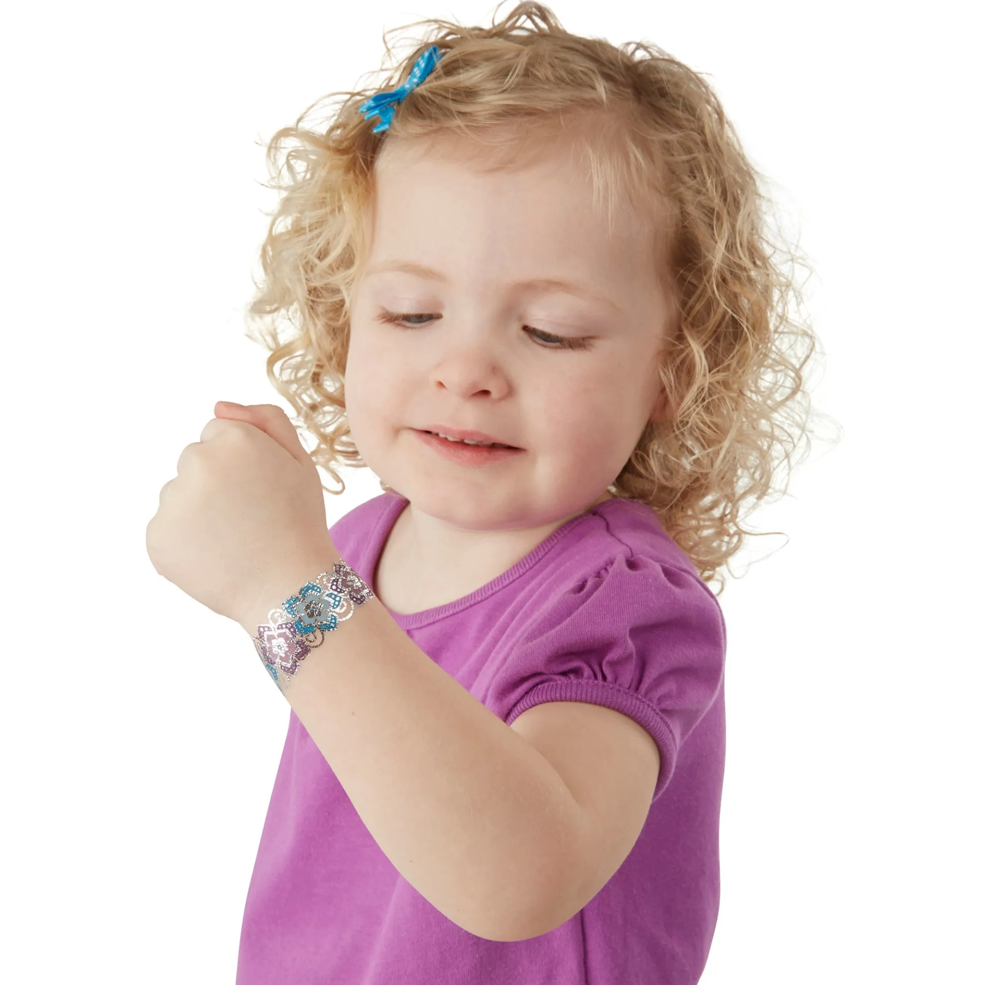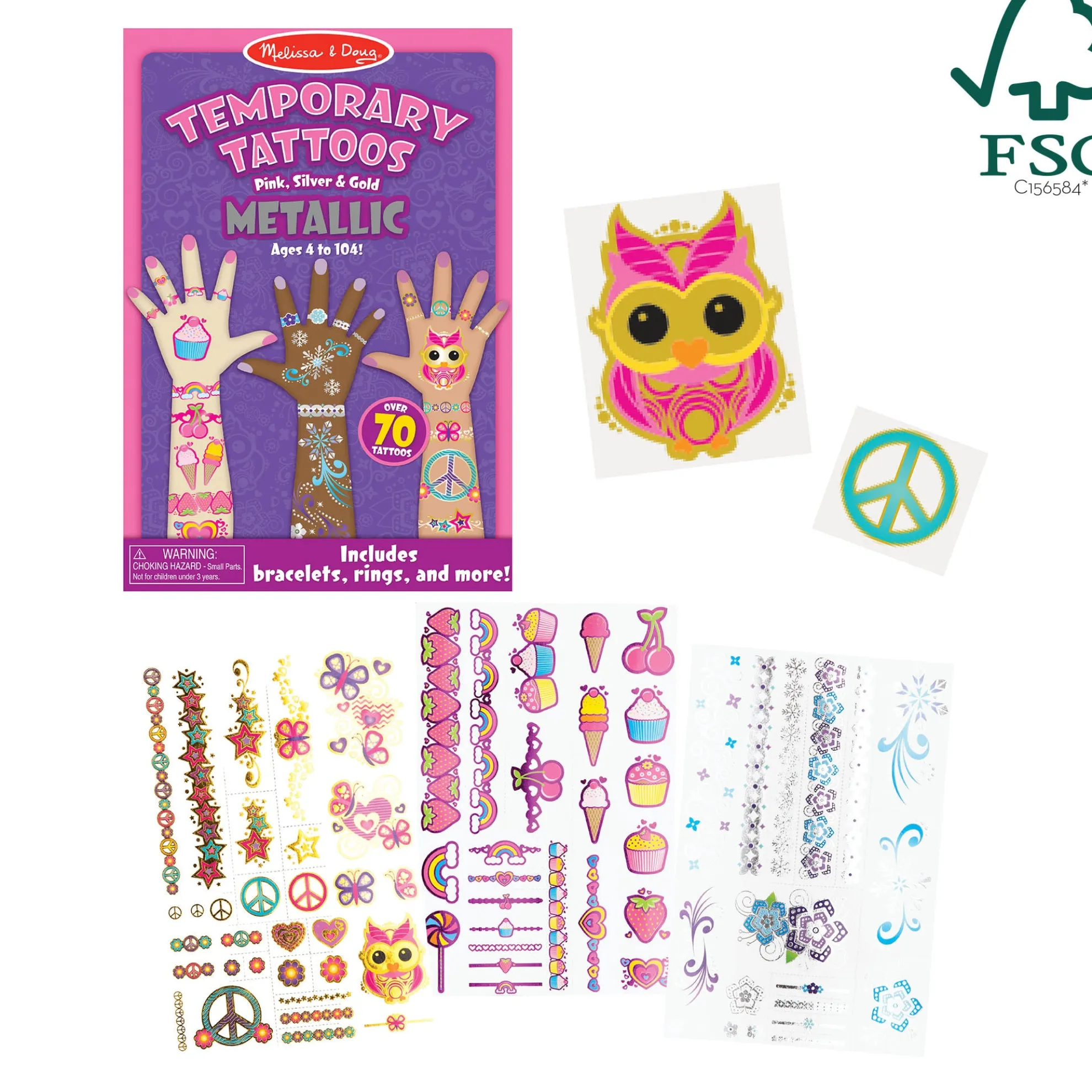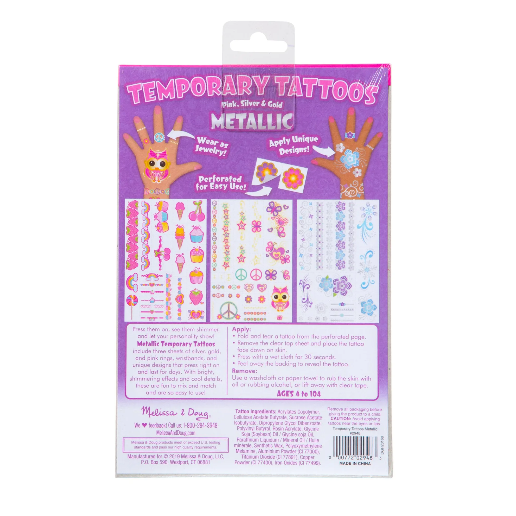 Kids love the look of these shiny jewelry and design tattoos! The pack includes three sheets of silver, gold, and pink rings, wristbands, and unique designs (more than 70 in all!) that press right on with a wet paper towel and last for days. The bright, shimmering effects and cool details look great on all skin tones. These are fun to mix and match and are so easy to use! Tattoos come on perforated sheets, so it’s easy for children four and older to see them all at a glance and easy to separate the “tattoo” of their choice. They also remove easily with oil, rubbing alcohol, or clear tape. This product is certified by the Forest Stewardship Council. FSC certification ensures that products come from responsibly managed forests that provide environmental, social, and economic benefits, and that forests are protected for future generations. Please note that FSC certification applies to new inventory only (FSC C156584).