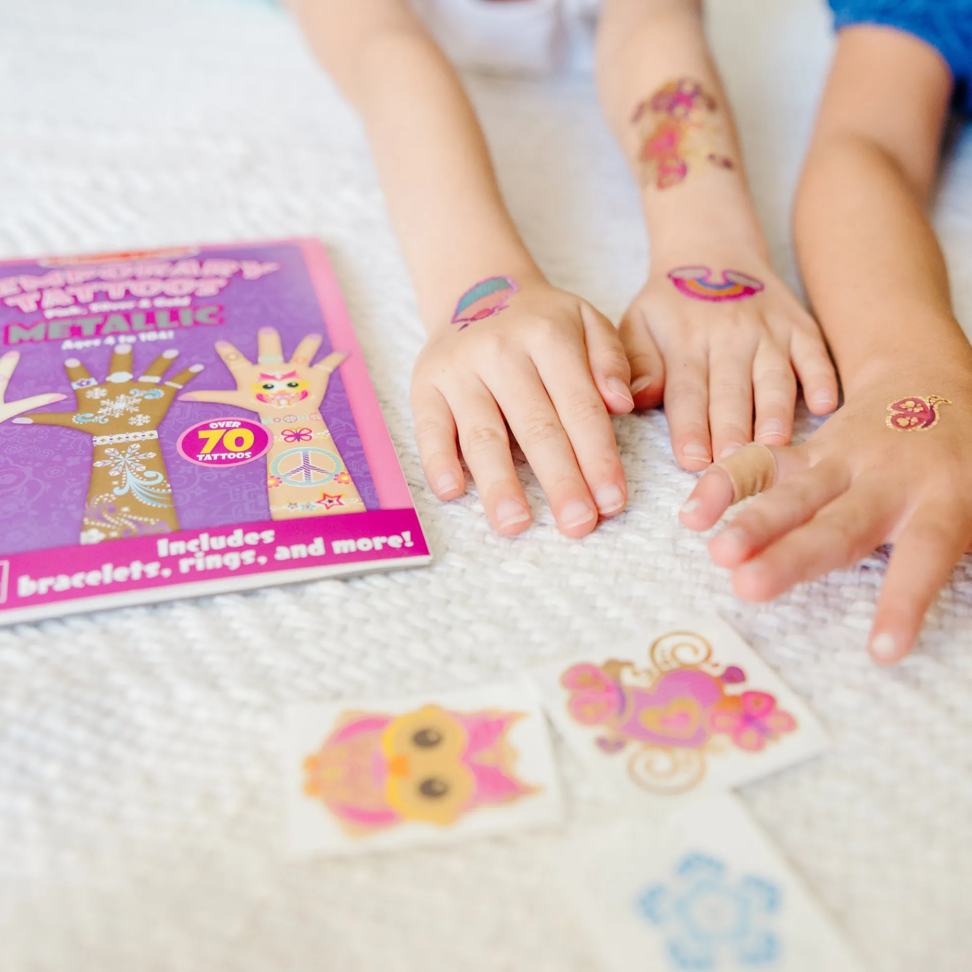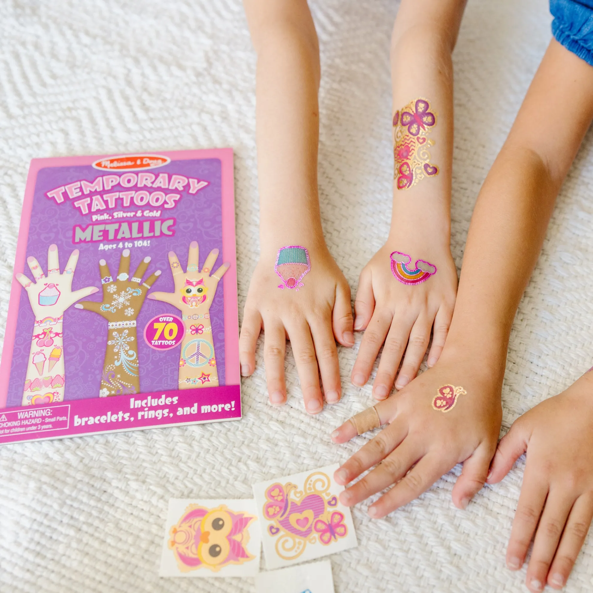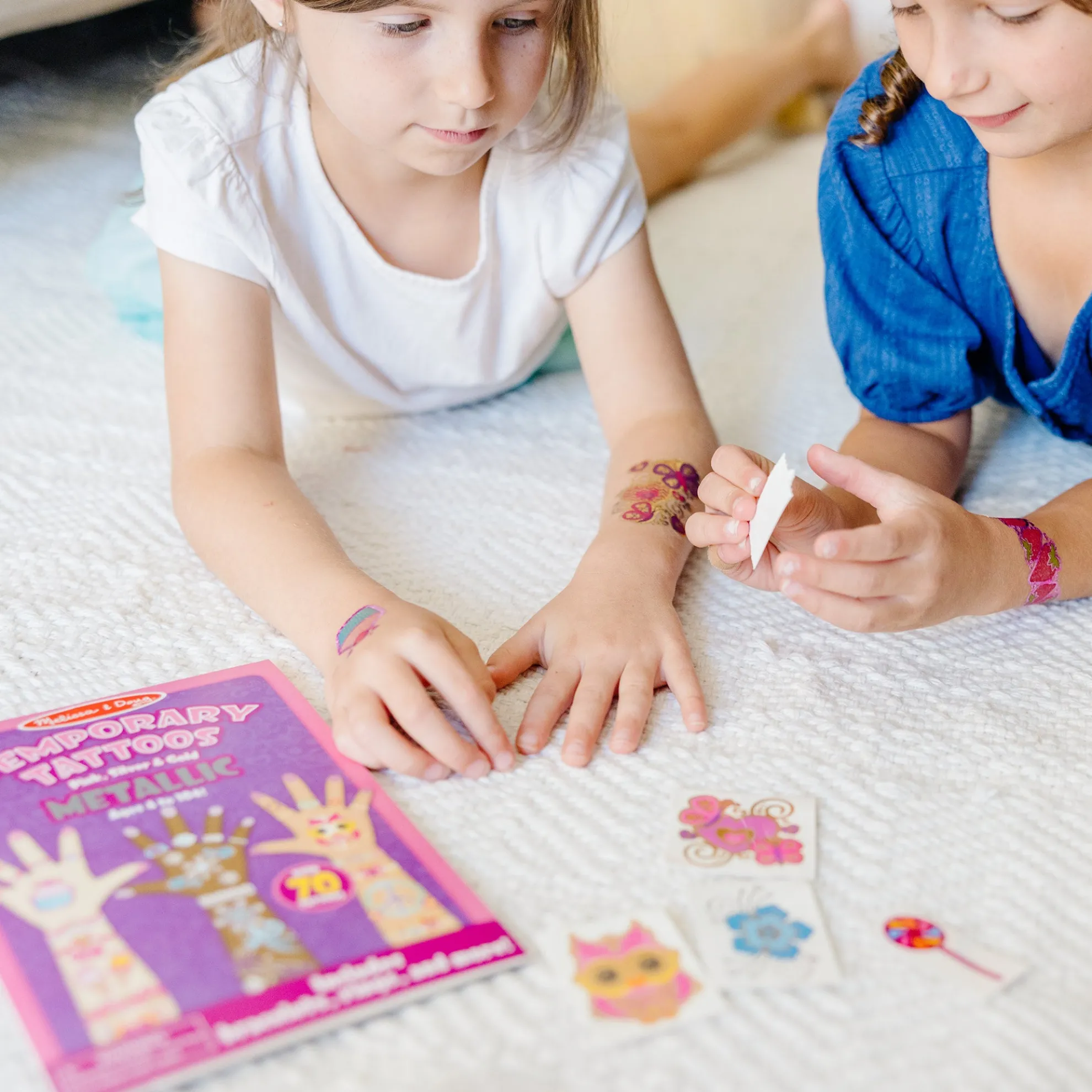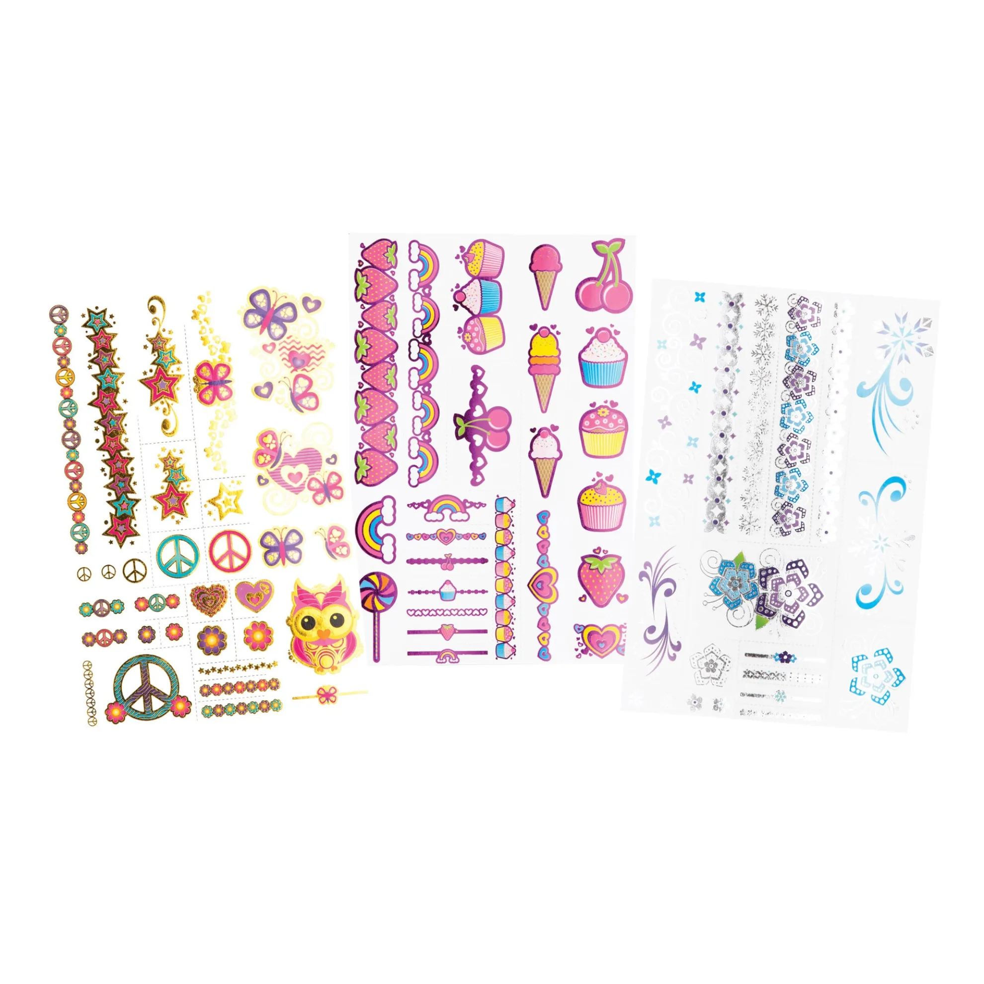 Kids love the look of these shiny jewelry and design tattoos! The pack includes three sheets of silver, gold, and pink rings, wristbands, and unique designs (more than 70 in all!) that press right on with a wet paper towel and last for days. The bright, shimmering effects and cool details look great on all skin tones. These are fun to mix and match and are so easy to use! Tattoos come on perforated sheets, so it’s easy for children four and older to see them all at a glance and easy to separate the “tattoo” of their choice. They also remove easily with oil, rubbing alcohol, or clear tape. This product is certified by the Forest Stewardship Council. FSC certification ensures that products come from responsibly managed forests that provide environmental, social, and economic benefits, and that forests are protected for future generations. Please note that FSC certification applies to new inventory only (FSC C156584).