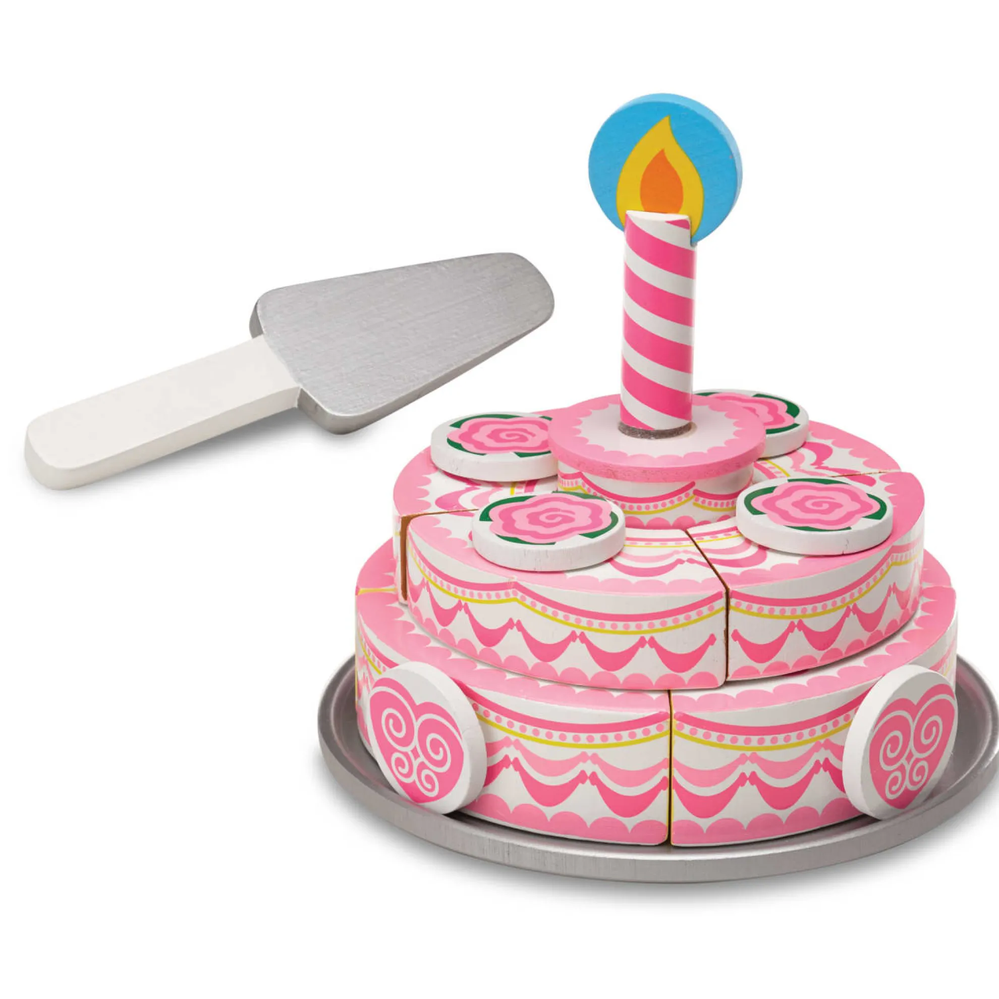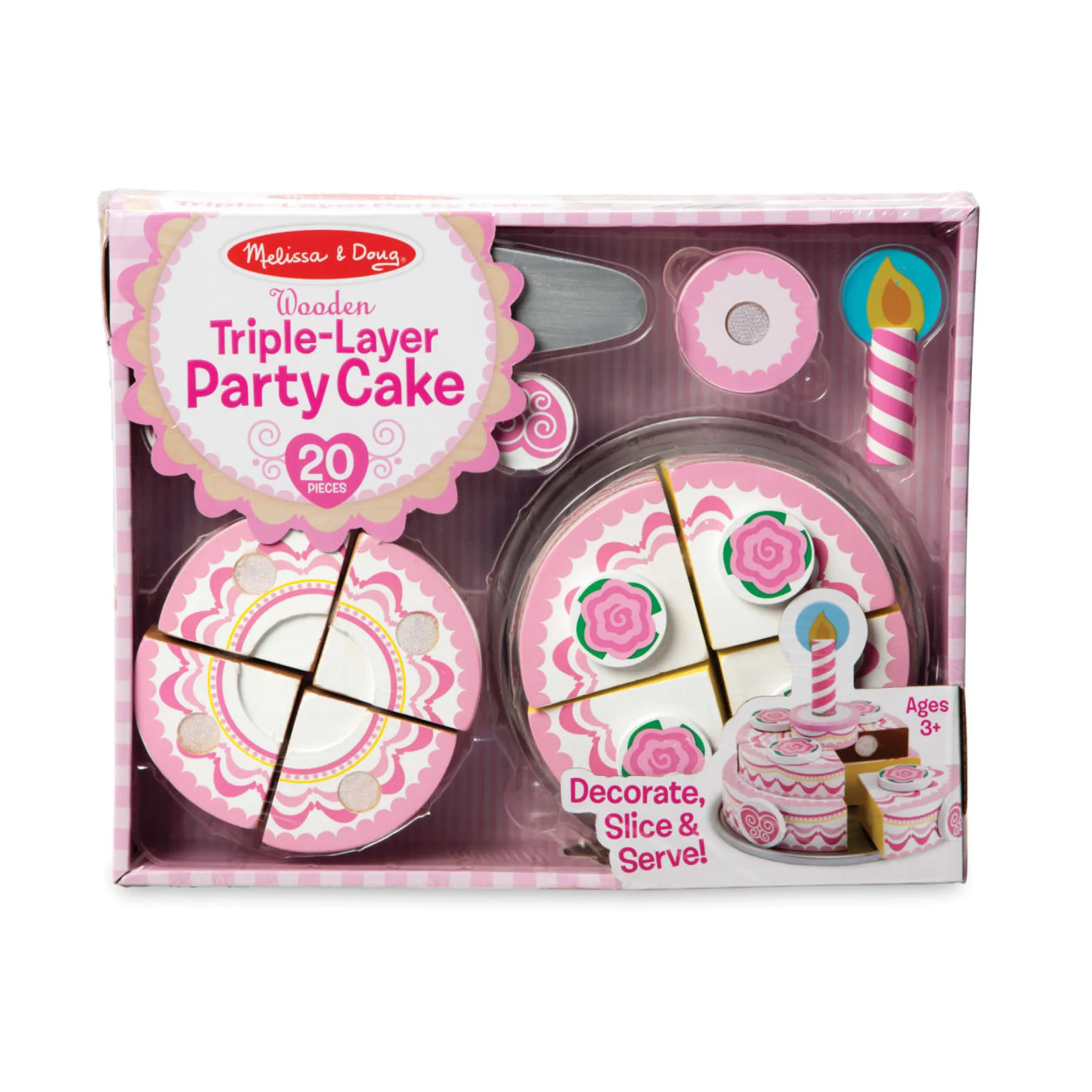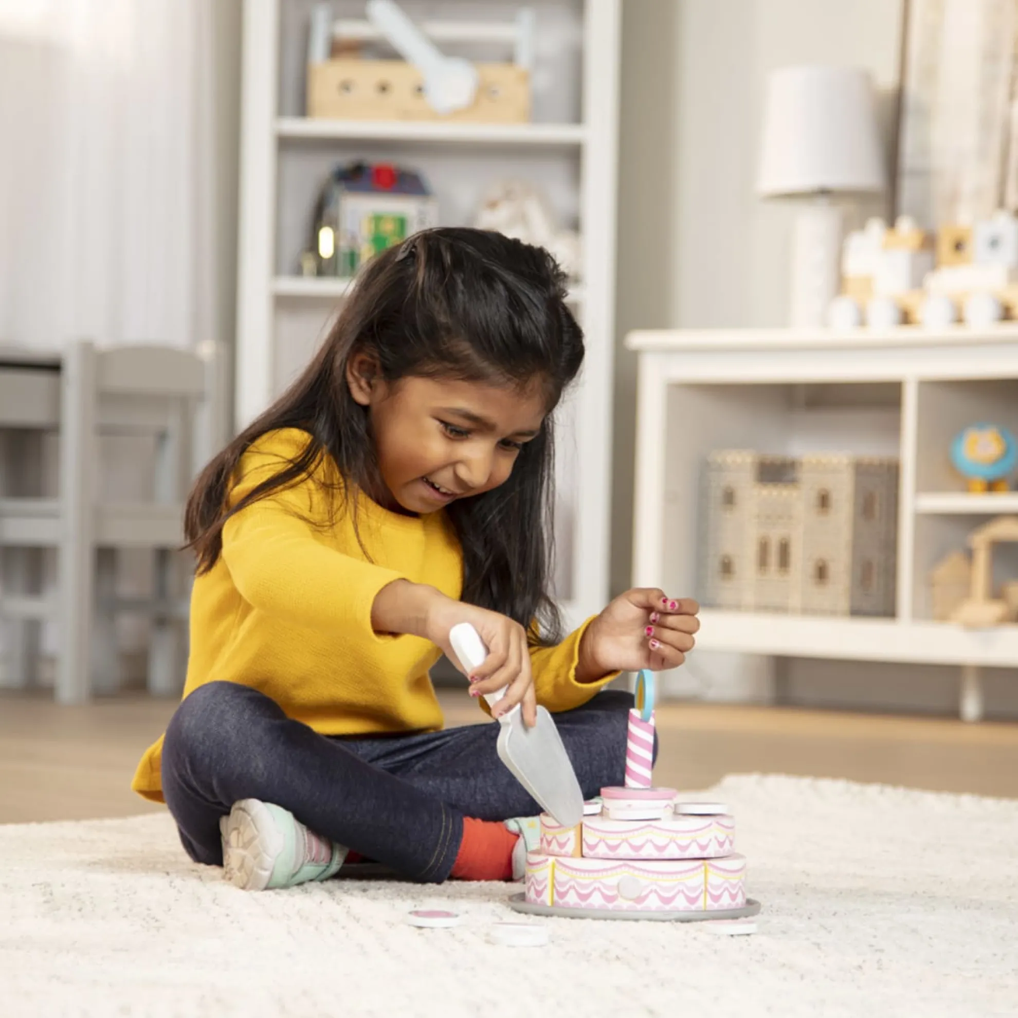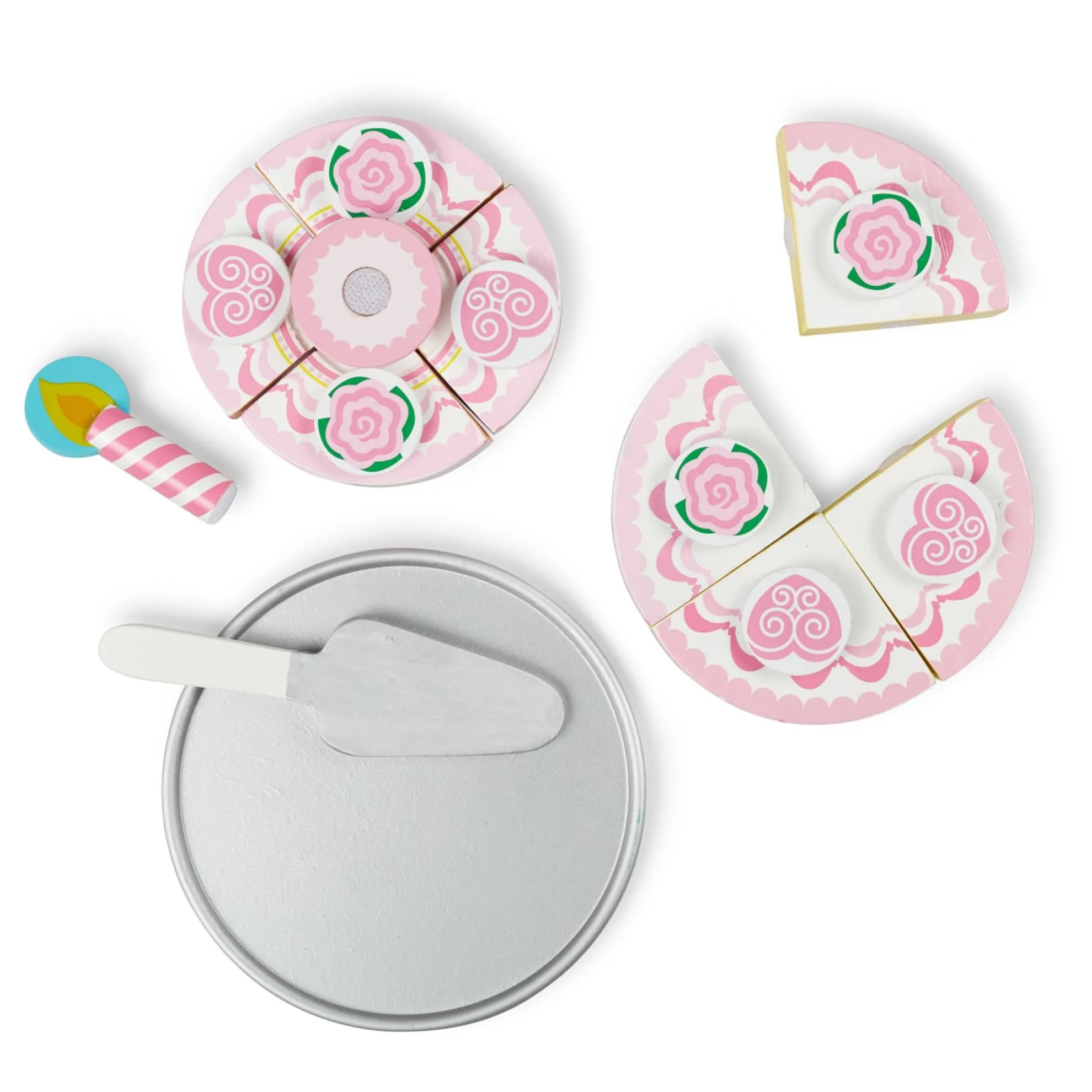 This play-food set contains a very special cake for very special occasions . . . like pretend play any day! With self-stick tabs on each piece, the wooden sections stick together easily then slice apart with the included wooden knife. Pretty decorations can mix and match to make every party unique!