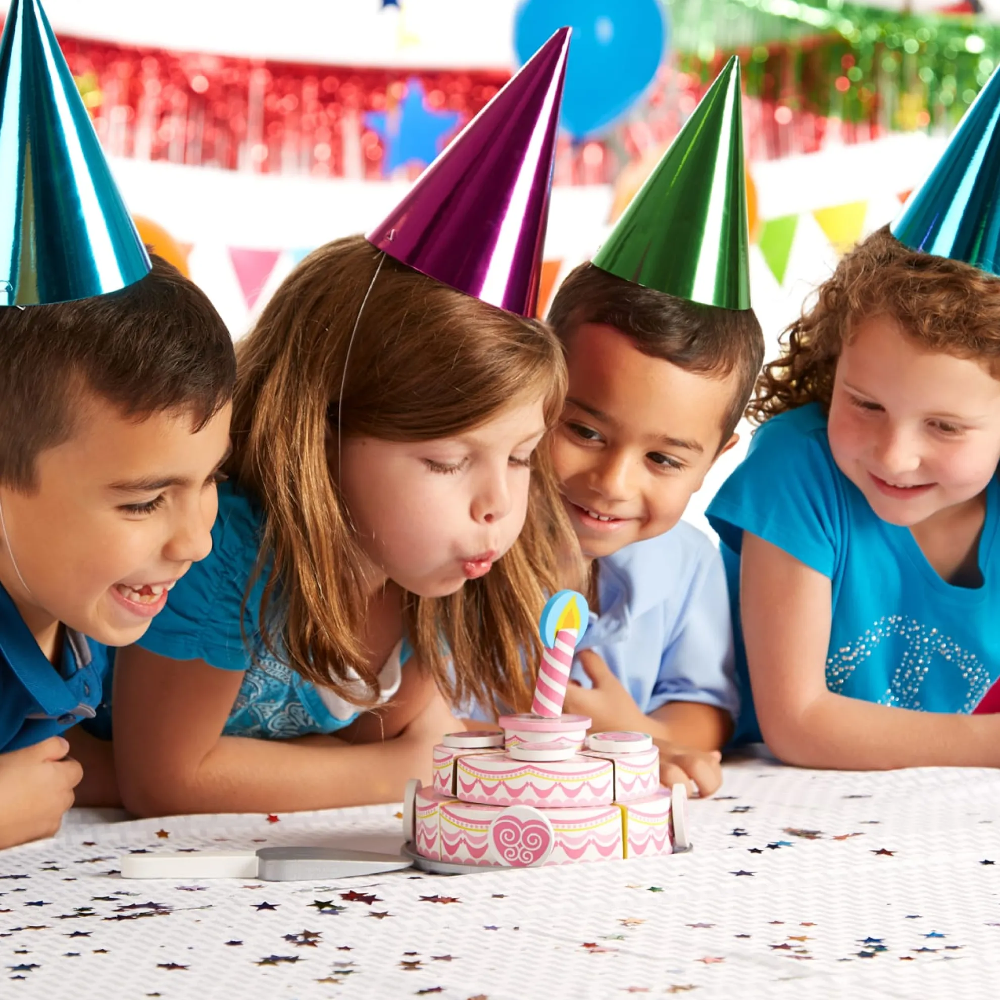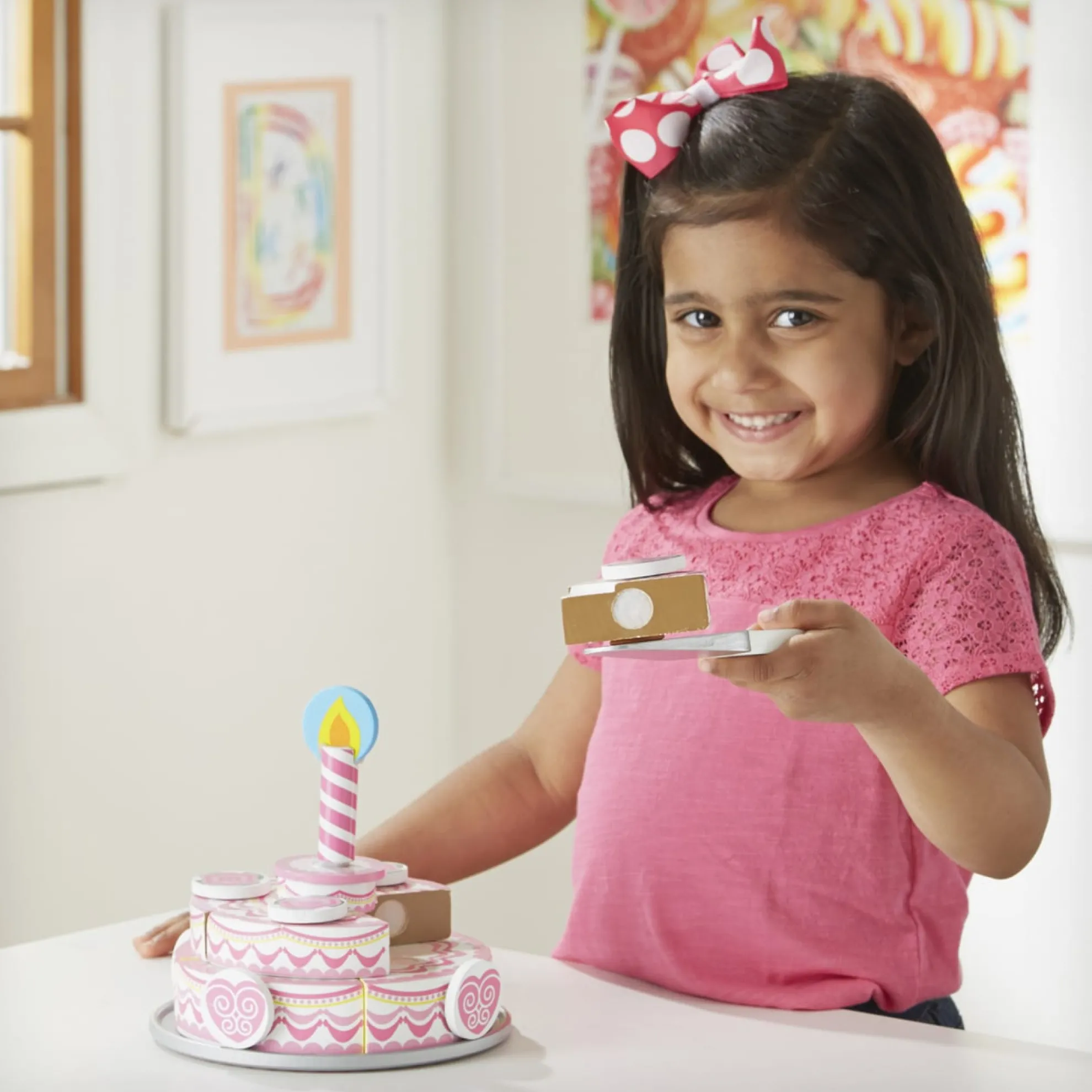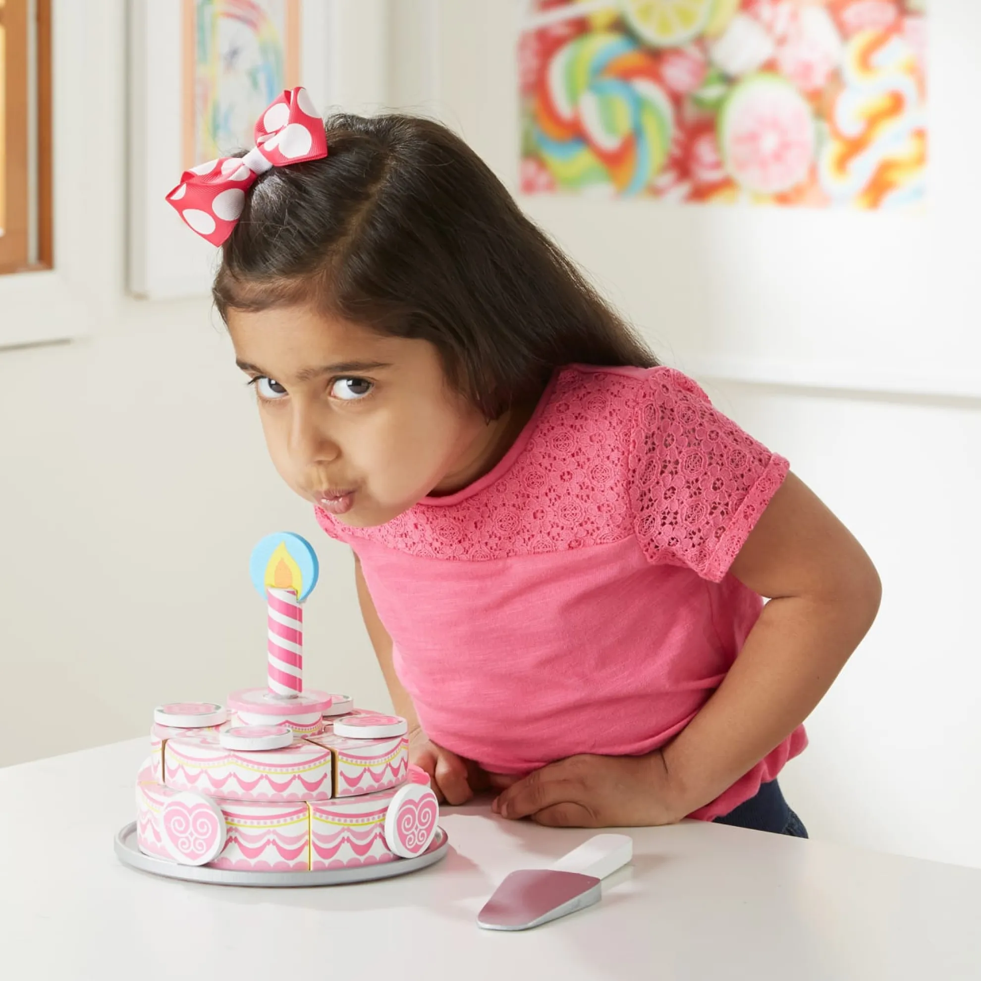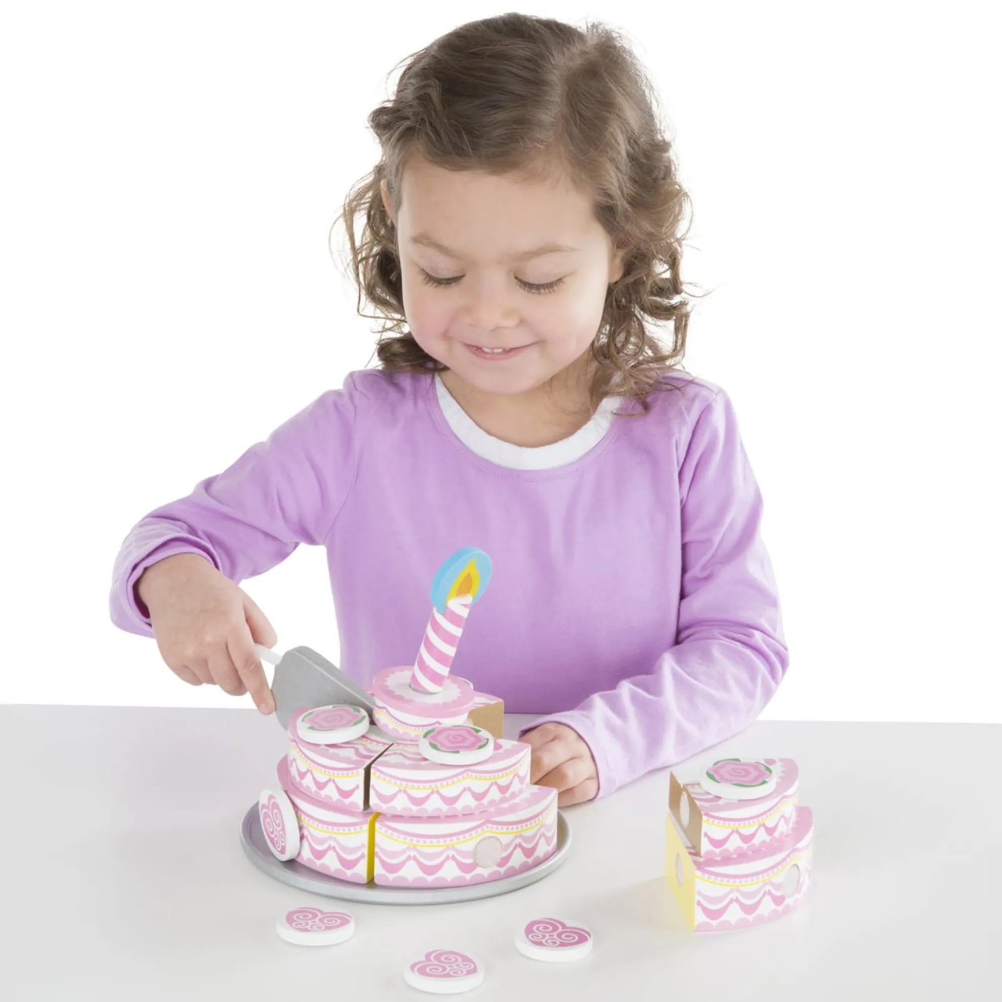 This play-food set contains a very special cake for very special occasions . . . like pretend play any day! With self-stick tabs on each piece, the wooden sections stick together easily then slice apart with the included wooden knife. Pretty decorations can mix and match to make every party unique!