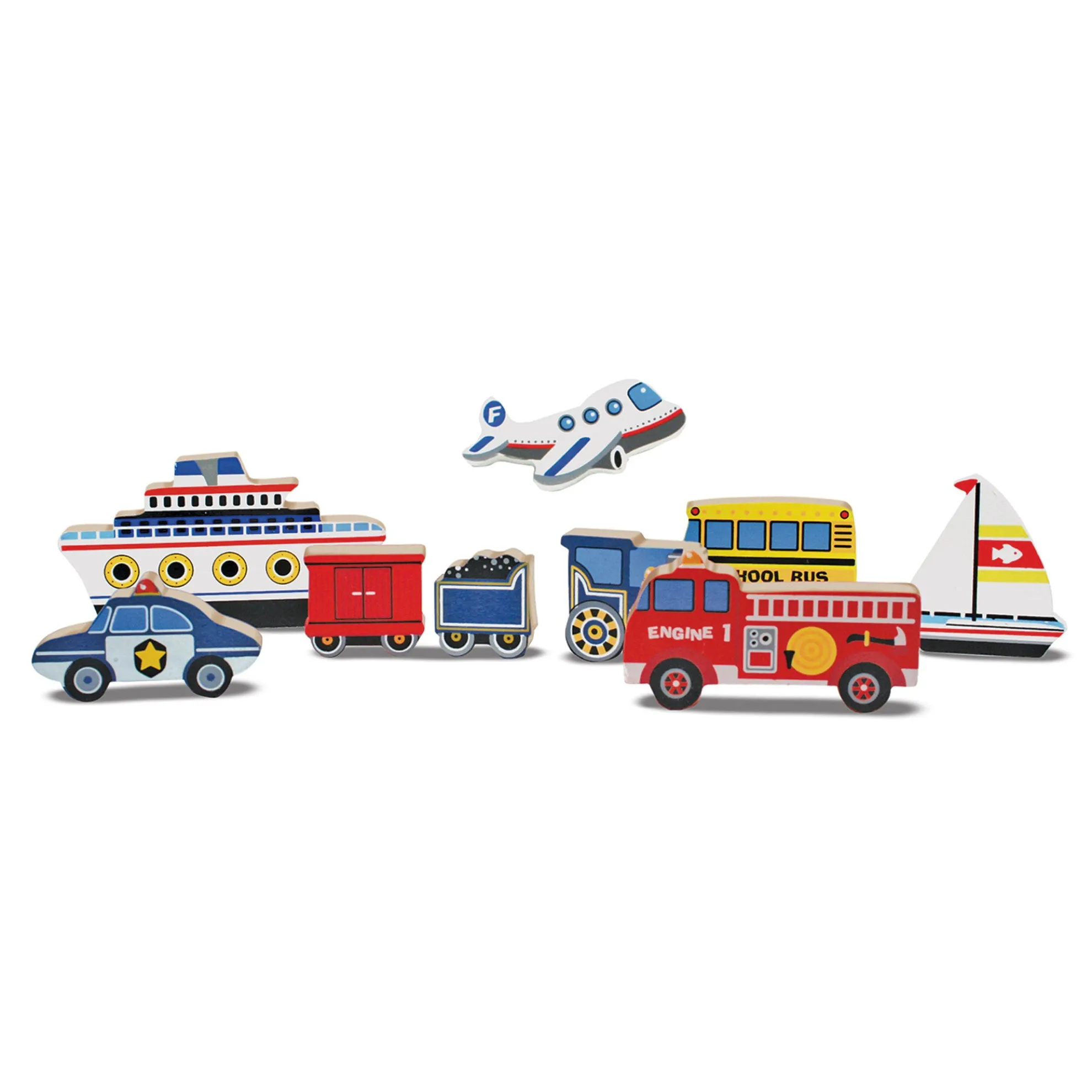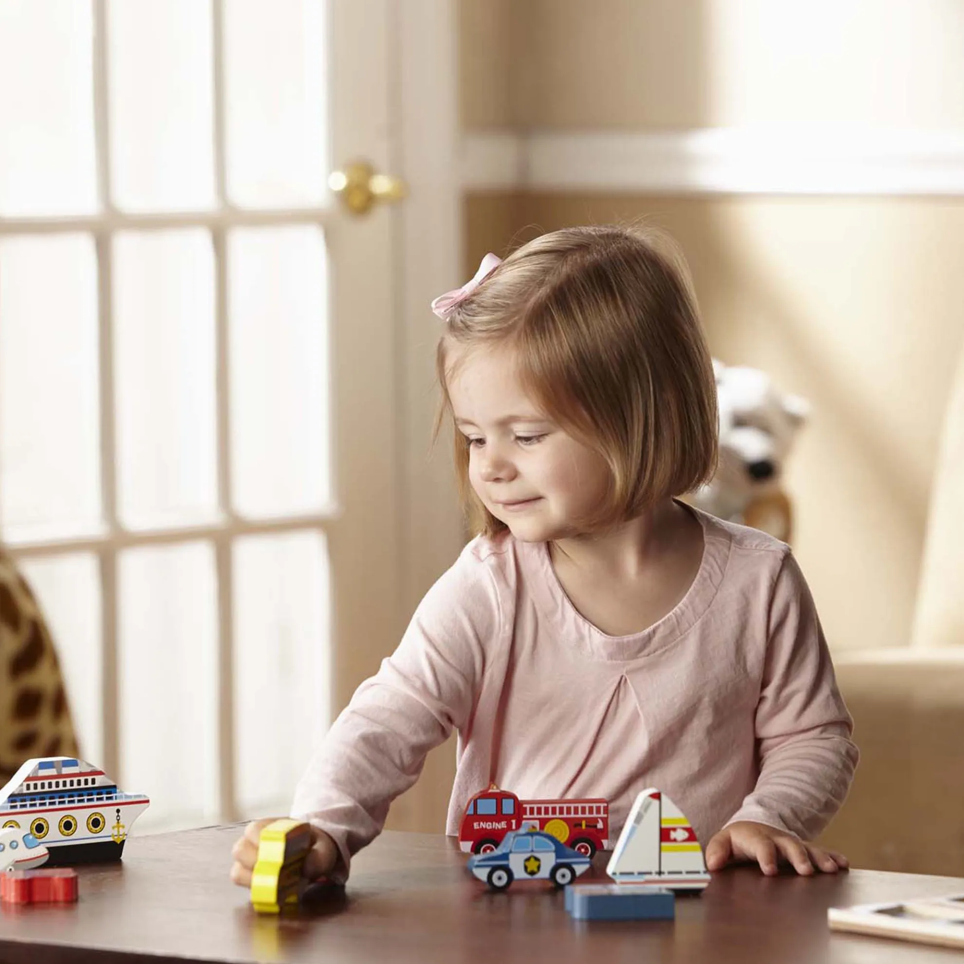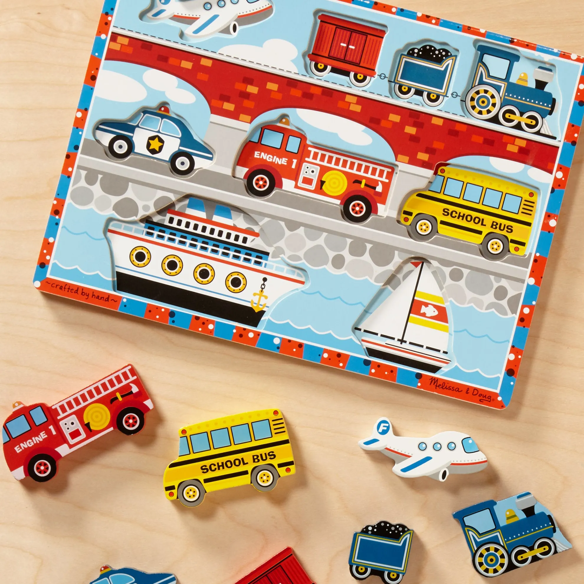 On the road, on the rails, by sea or by air, imaginations travel far and wide with this extra-thick wooden puzzle. Featuring nine easy-grasp, chunky vehicle pieces that can stand upright for pretend play. Each vehicle has a full-color, matching picture underneath. Encourages hand-eye, fine motor and creative expression skills. This product is certified by the Forest Stewardship Council. FSC certification ensures that products come from responsibly managed forests that provide environmental, social, and economic benefits, and that forests are protected for future generations. Please note that FSC certification applies to new inventory only (FSC C156584).