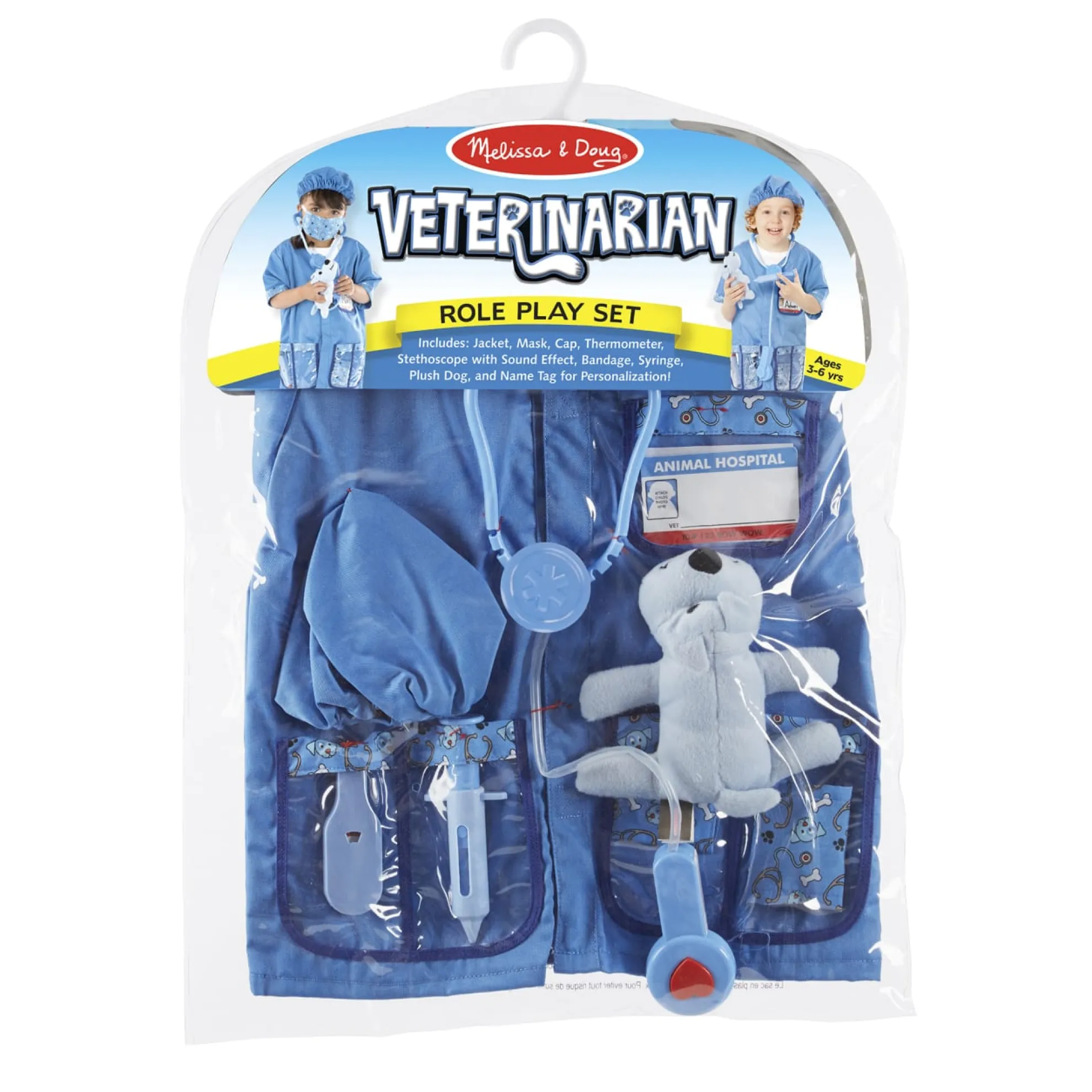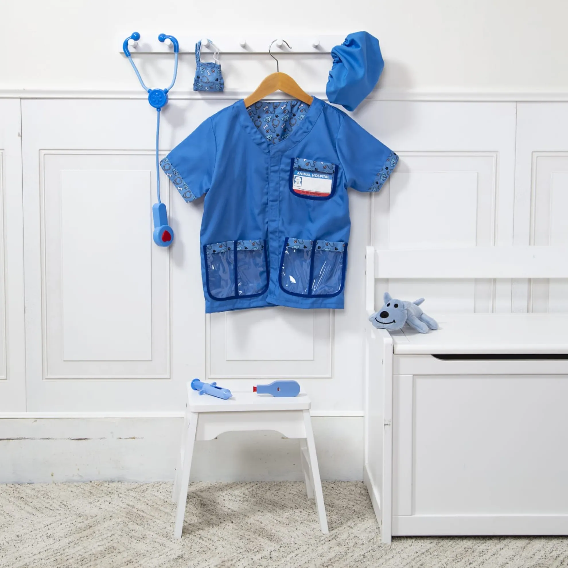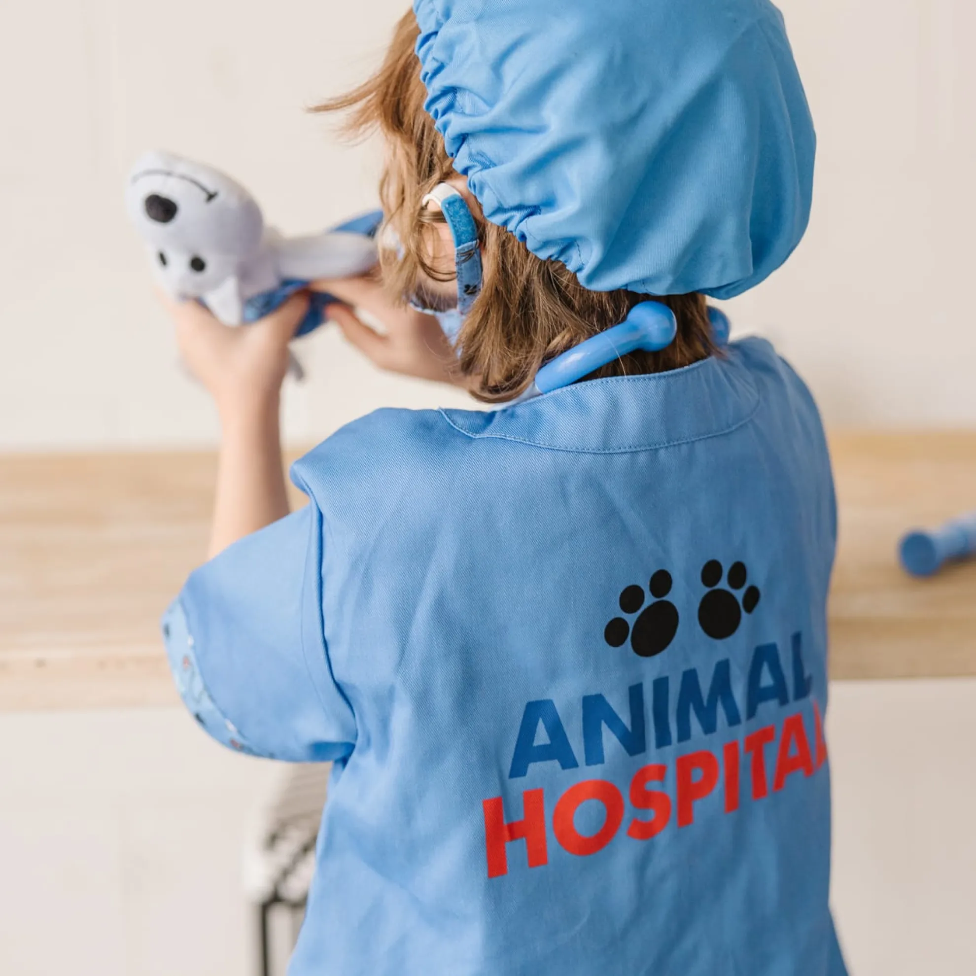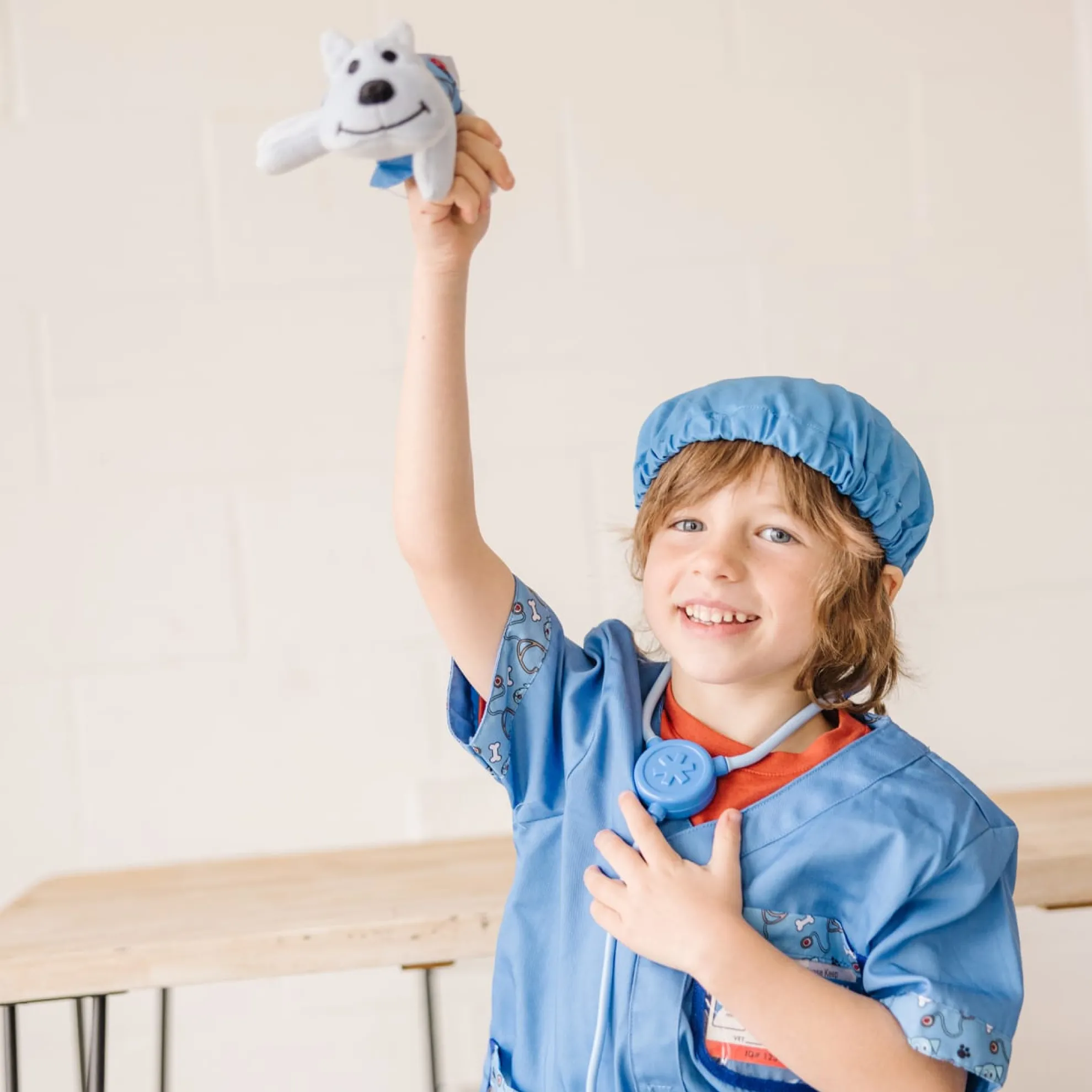 The care of all the toy “pets” in the house will be in capable hands when your little animal doctor is suited up in a machine-washable blue jacket, mask and surgical cap. The set includes a stethoscope with sound effects, syringe, thermometer, mask, cap, bandage, reusable veterinarian name tag and a little plush puppy patient to “doctor” and love.
