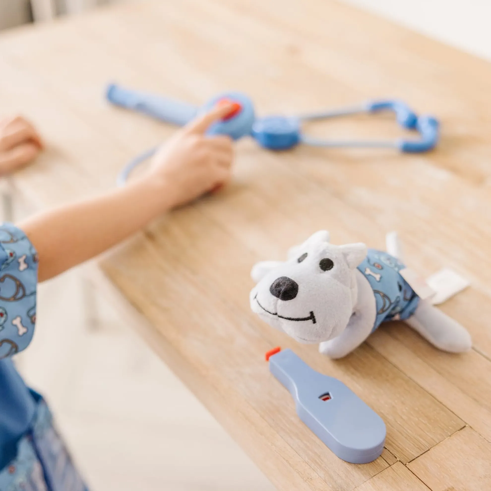 - Includes jacket, mask, cap, thermometer, stethoscope with sound effects, bandage, syringe, plush dog and reusable name tag