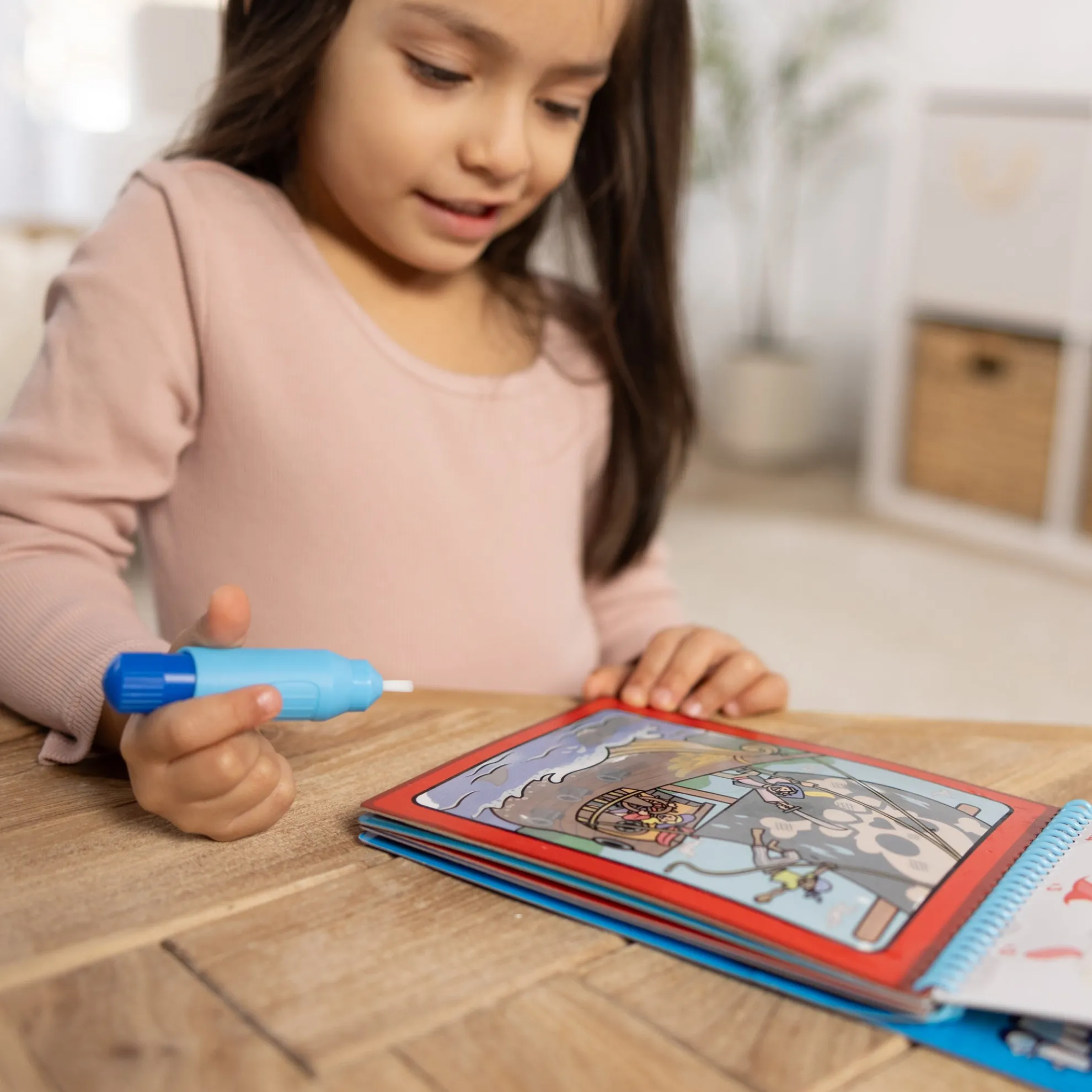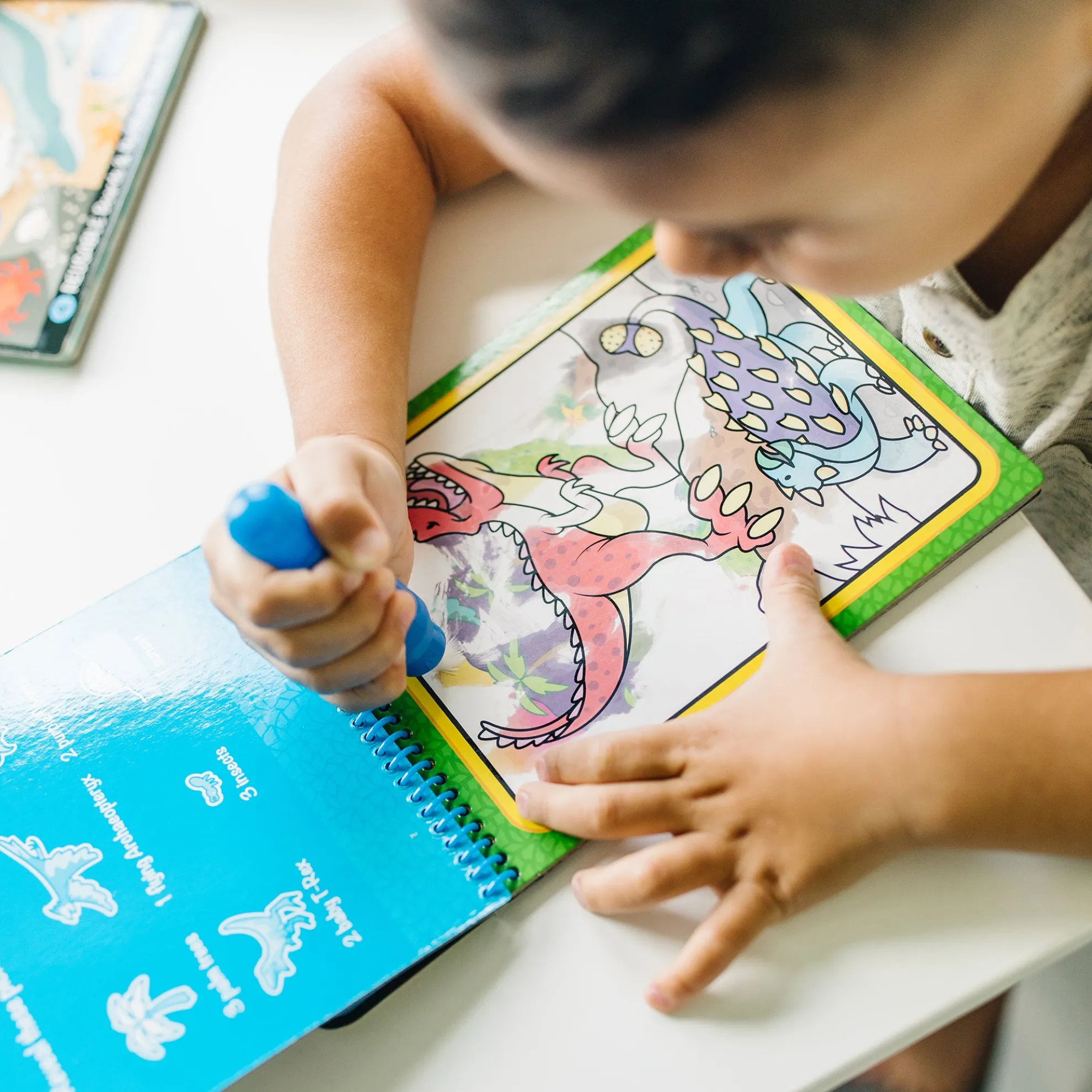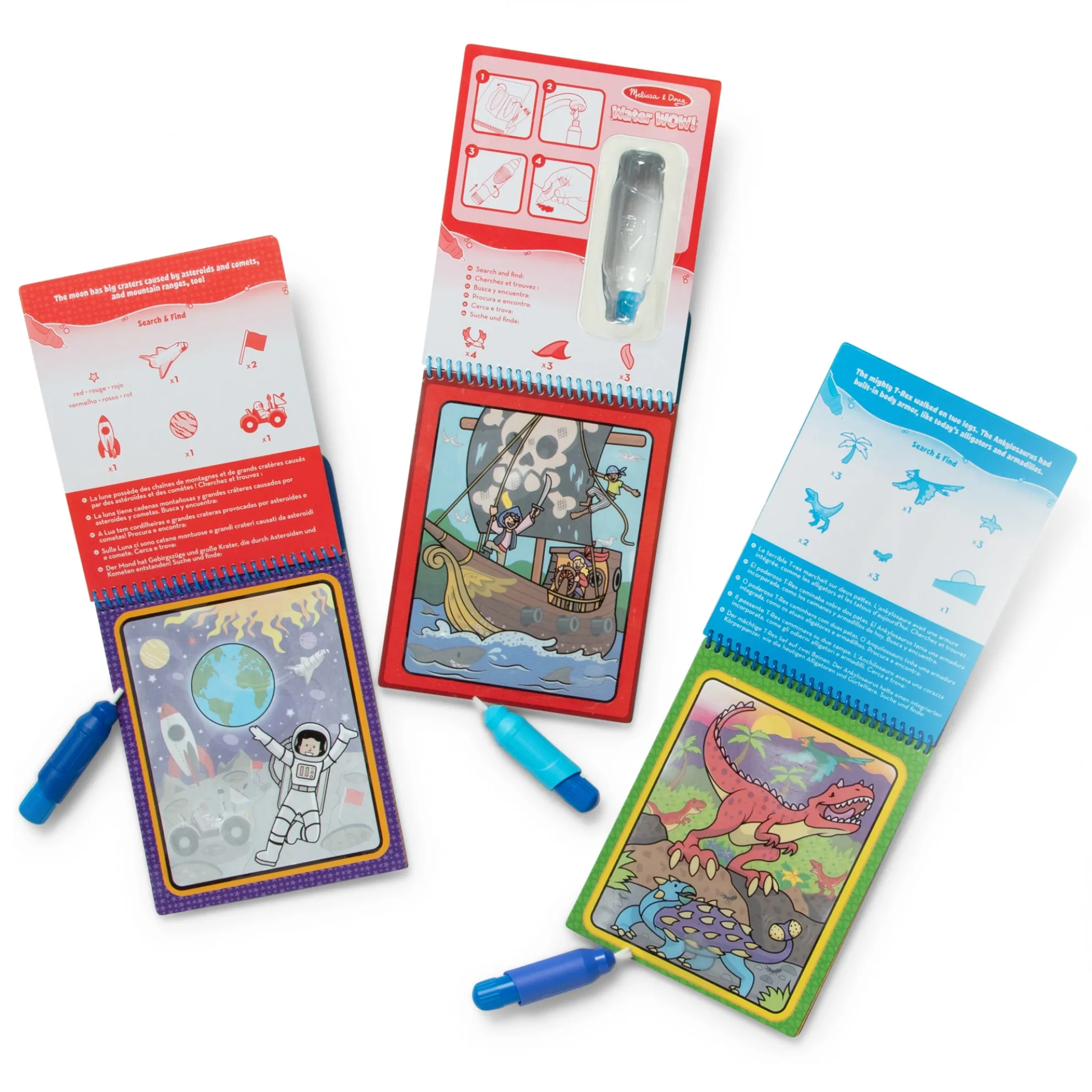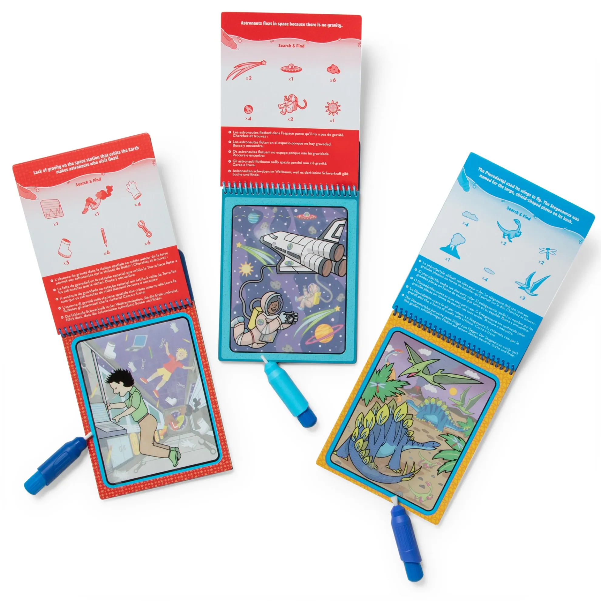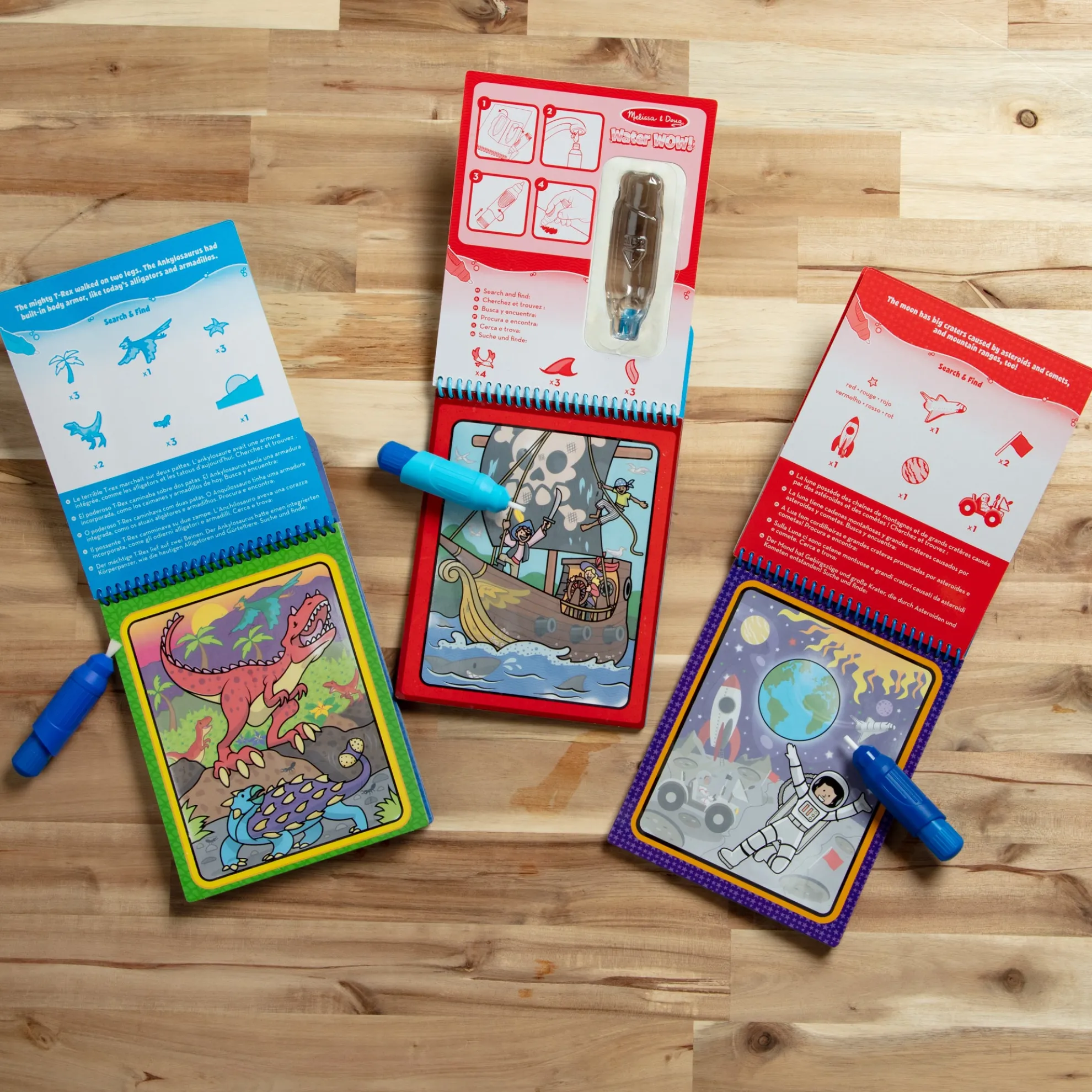 - 3 Melissa & Doug On-the-Go Water Wow! Reusable Water-Reveal Activity Pads (Dinosaurs, Adventure, Space) that each include 4 reusable pages and a refillable water pen