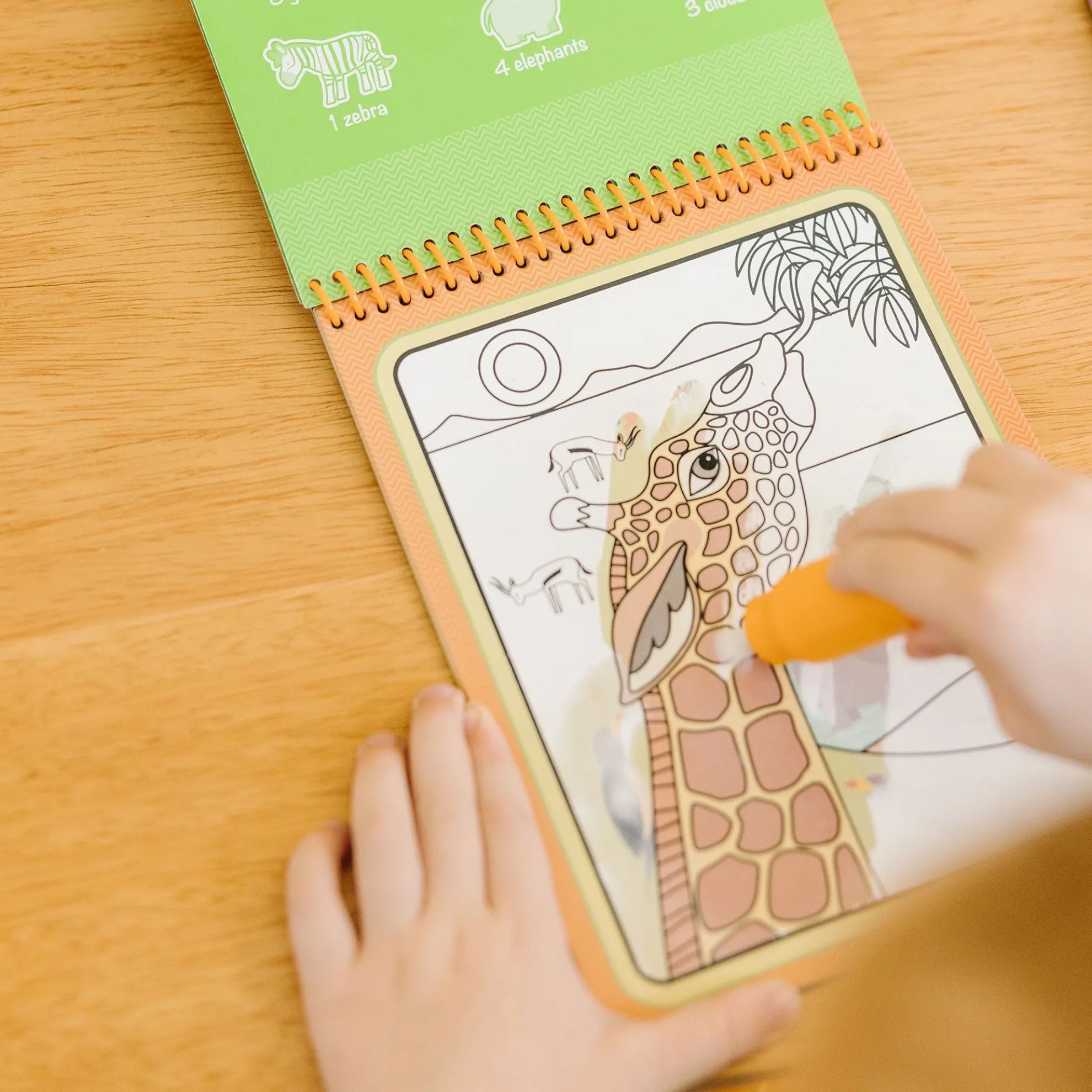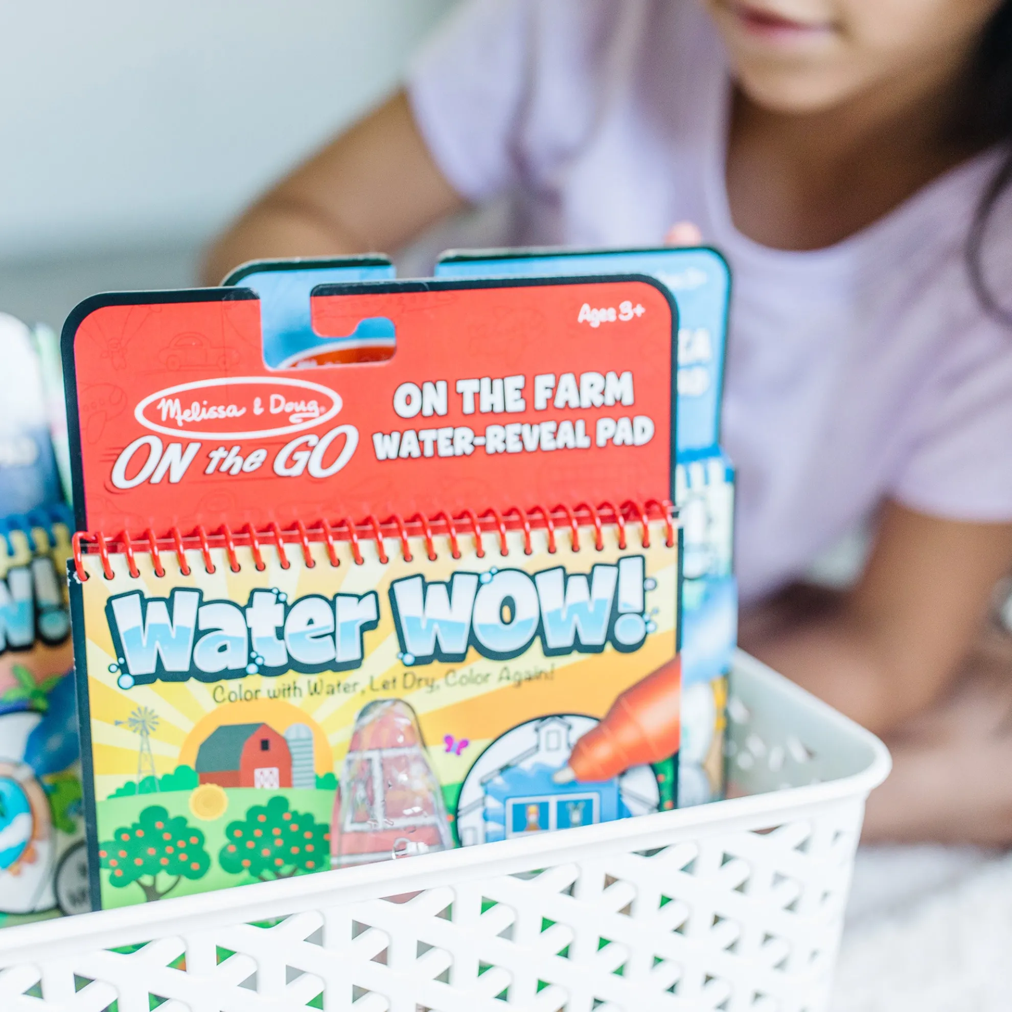 - 3 Melissa & Doug On-the-Go Water Wow! Reusable Water-Reveal Activity Pads (Jungle, Safari, Farm) that each include 4 reusable pages and a refillable water pen
