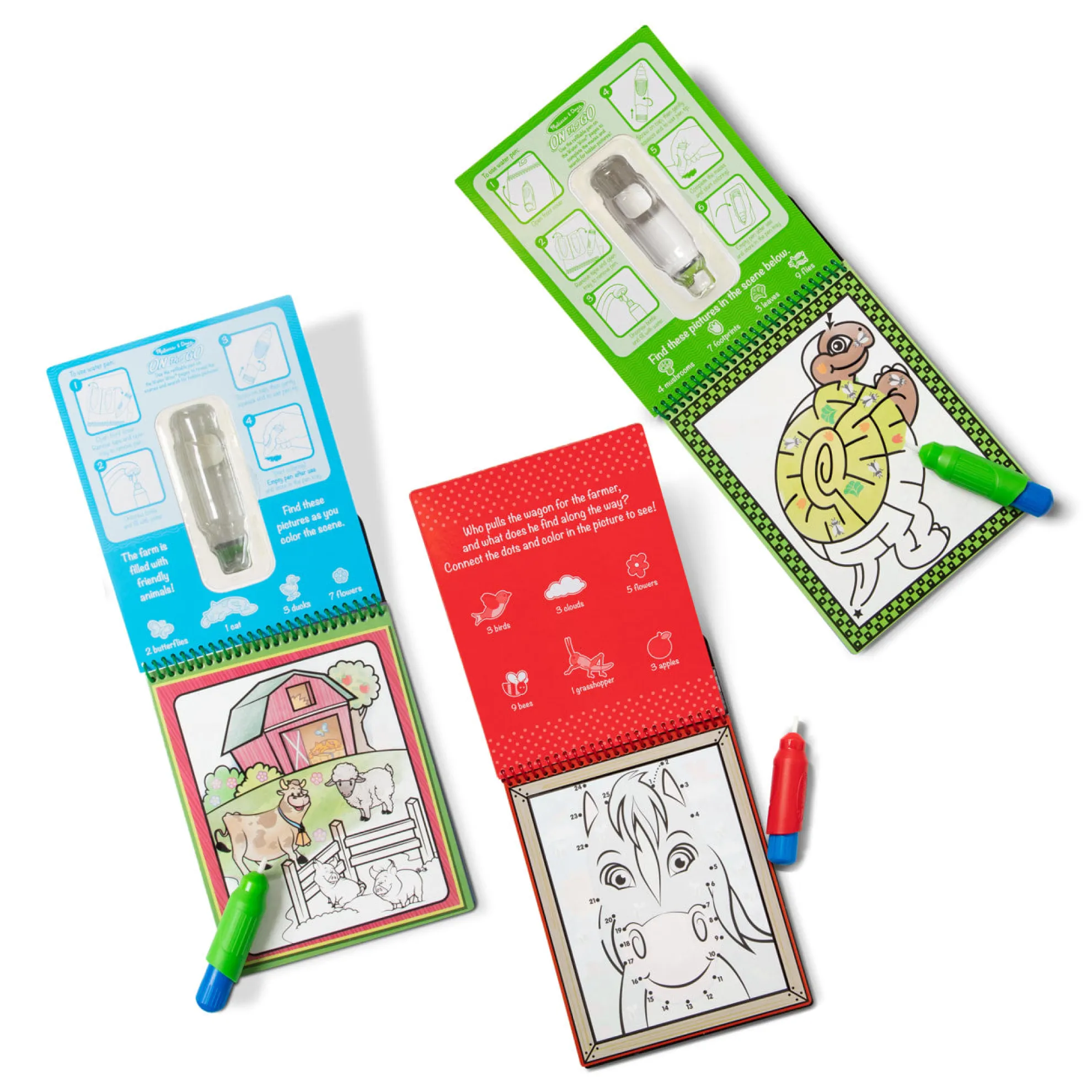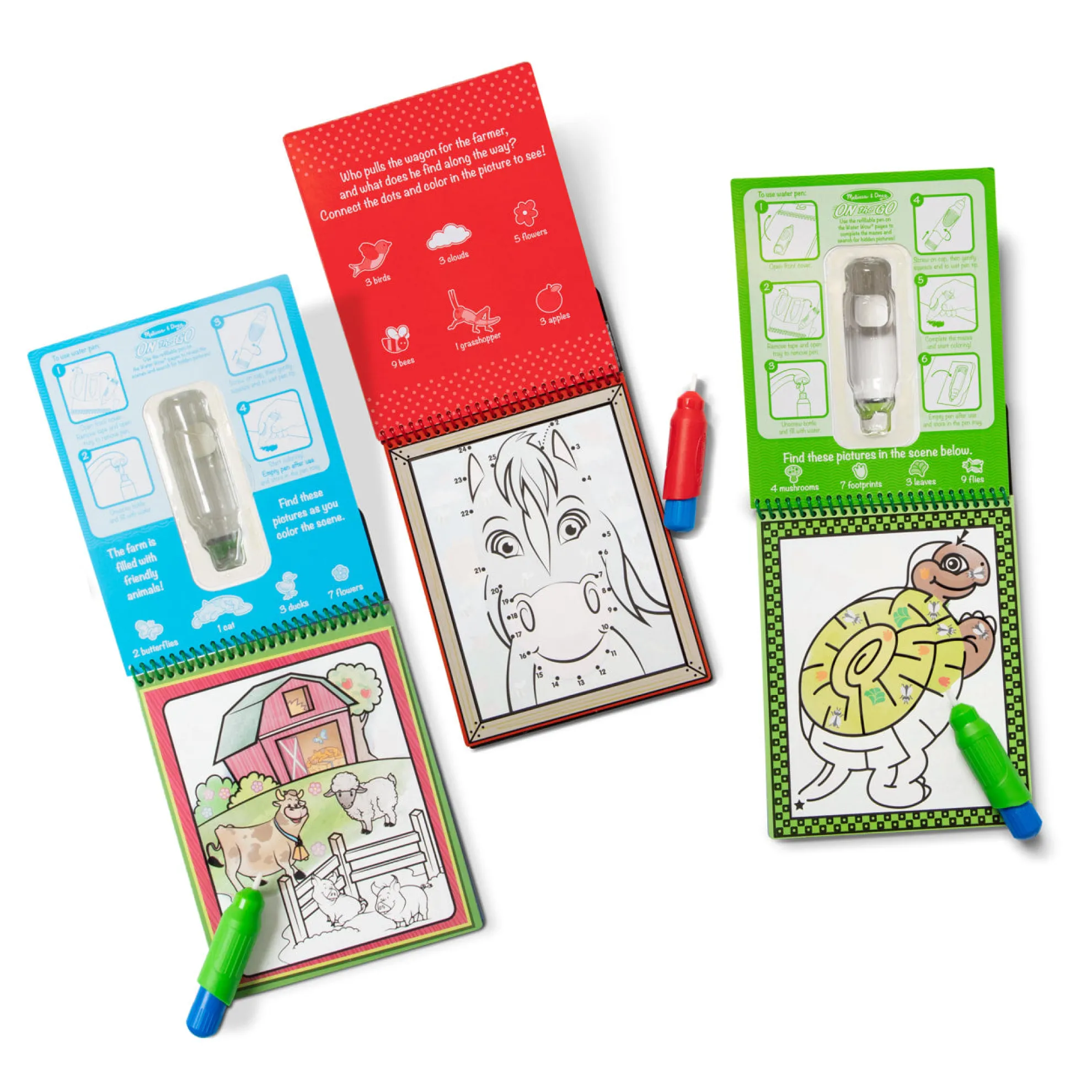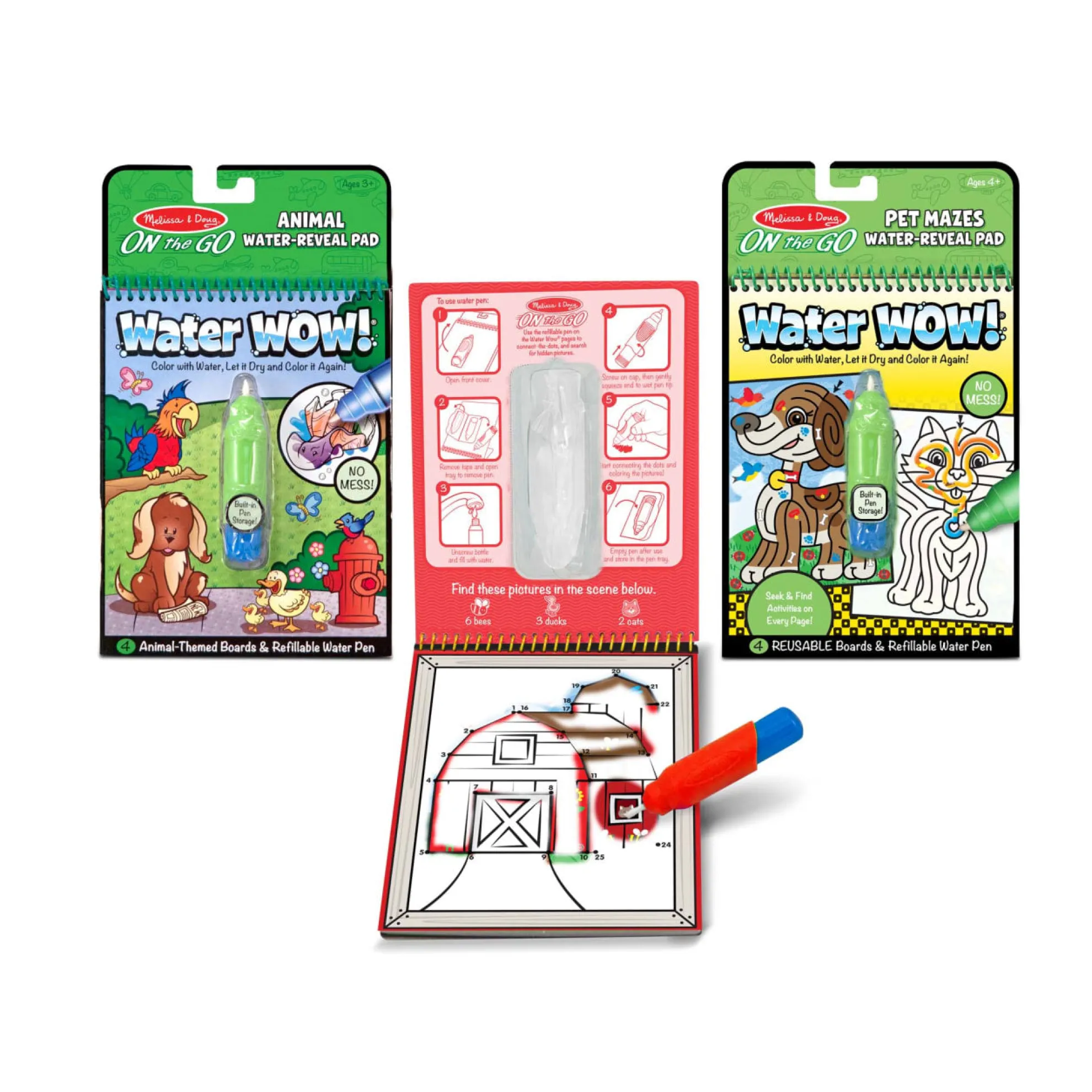 Take no-mess activities wherever kids go with this assortment of three Water Wow! activity books. Each book includes four reusable pages of activities (Pet Mazes, Farm Connect-the-Dots, and Animals Water Reveal coloring pad) and a refillable water pen that stores in the cover. Use the pen and watch details and vibrant color appear with every stroke! Let the page dry to erase the pictures and fill it in again and again. Water WOW books make ideal travel activities for kids.