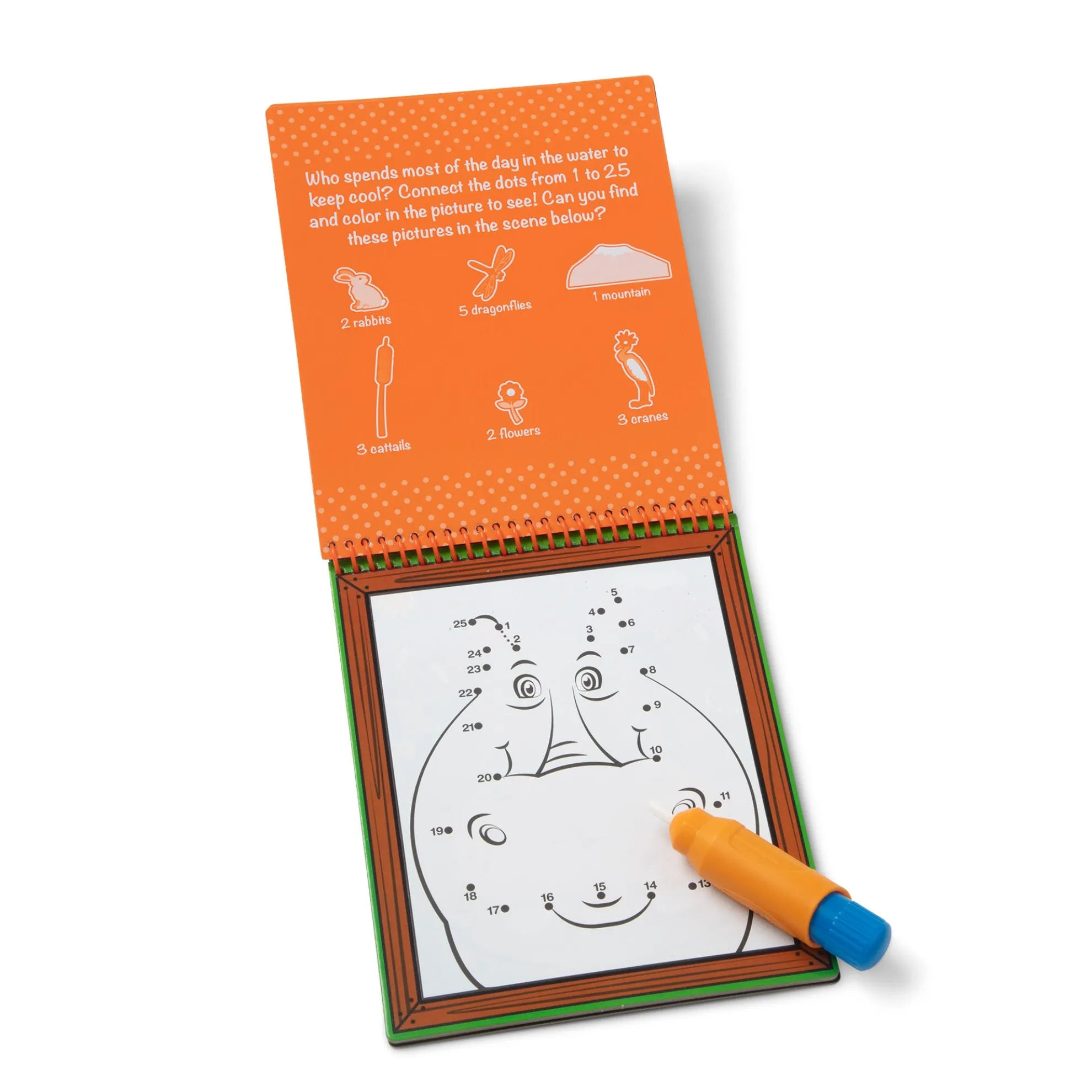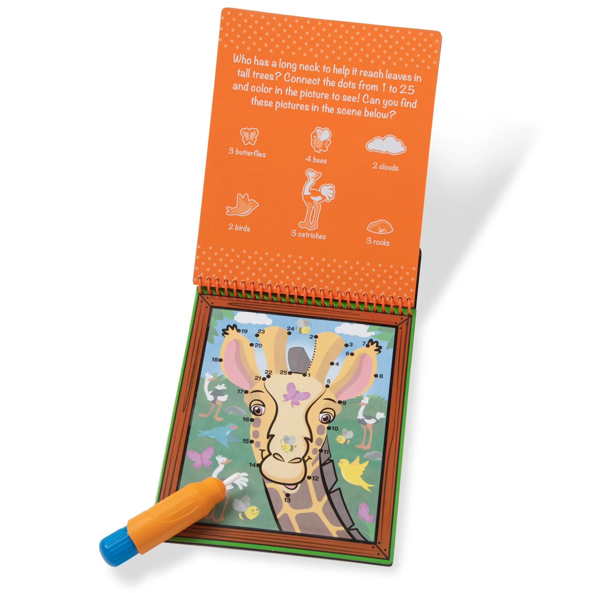 - 4 safari-themed coloring boards and refillable water pen; connect the dots and search-and-find activities with every scene