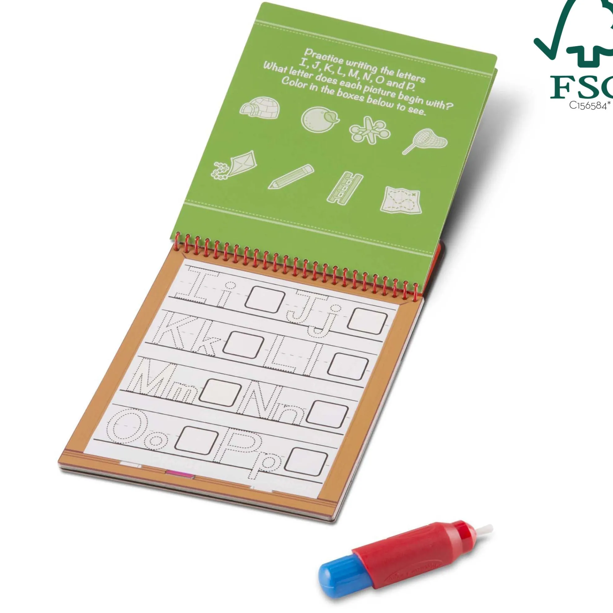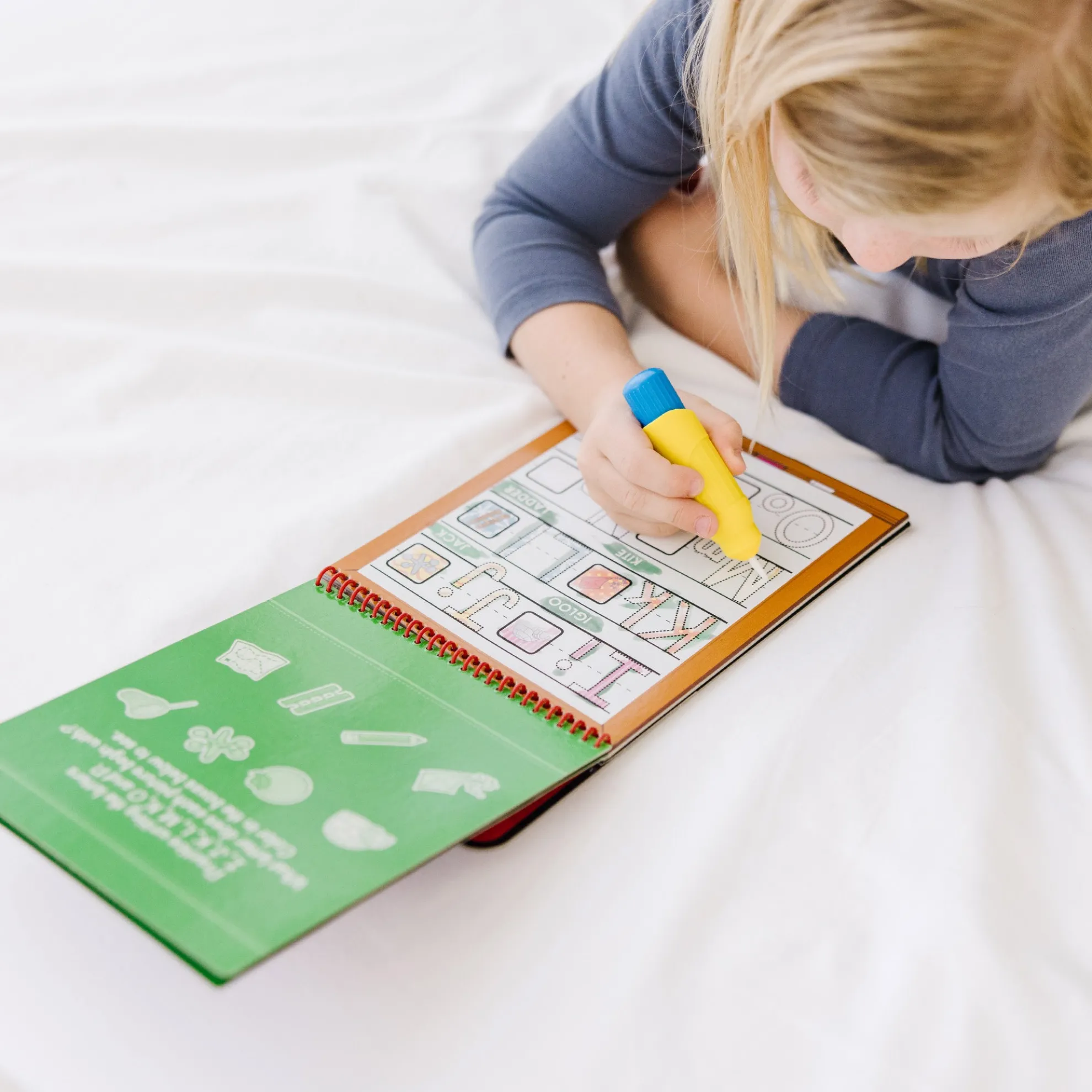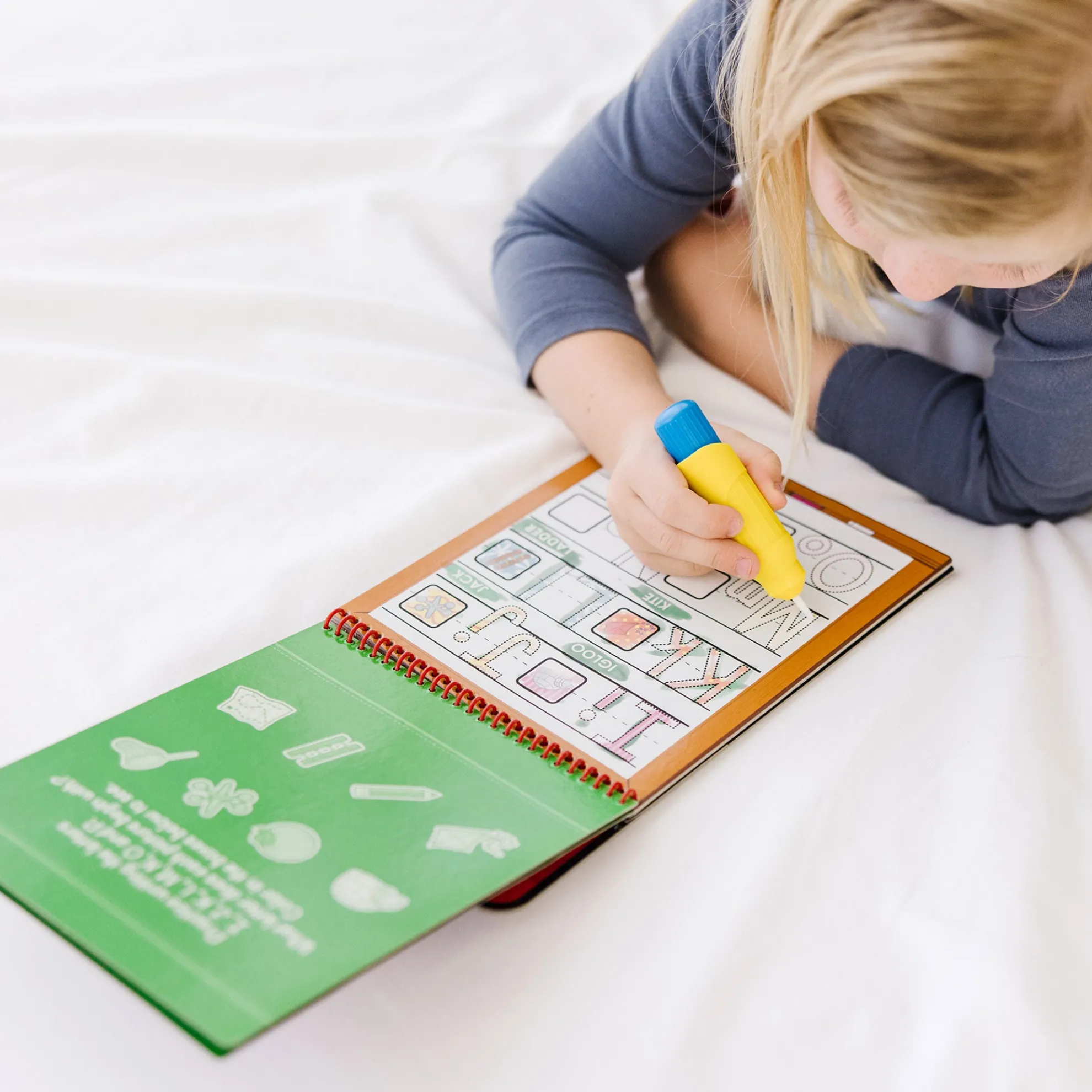 This exciting activity book includes four reusable pages and a refillable water pen. Use the pen to fill in each activity, from coloring in boxes to tracing letters, and see hidden colors and pictures appear with every stroke! Then simply let the page dry to erase the pictures and fill it in again and again. This alphabet-themed book includes every letter of the alphabet (uppercase and lowercase) to trace, alongside pictures of familiar objects to illustrate each sound. There are empty lines for practice, too! The chunky-sized water pen is easy for kids to hold and stores neatly right in the front cover. This product is certified by the Forest Stewardship Council. FSC certification ensures that products come from responsibly managed forests that provide environmental, social, and economic benefits, and that forests are protected for future generations. Please note that FSC certification applies to new inventory only (FSC C156584)