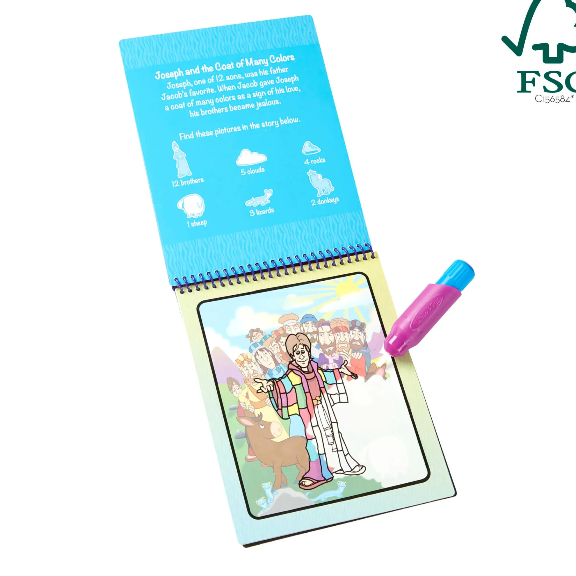 No-mess painting for kids! This exciting paint-with-water coloring book includes four reusable pages and a refillable water pen. Simply use the pen to color in each scene–details and vibrant color appear with every stroke! Then let the page dry to erase the pictures and fill it in again and again. This Bible-themed book includes four scenes to color and a search-and-find activity for each scene. The chunky-sized water pen is easy for kids to hold and stores neatly right in the front cover, so Water WOW books make ideal travel activity books for kids! This product is certified by the Forest Stewardship Council. FSC certification ensures that products come from responsibly managed forests that provide environmental, social, and economic benefits, and that forests are protected for future generations. Please note that FSC certification applies to new inventory only (FSC C156584)