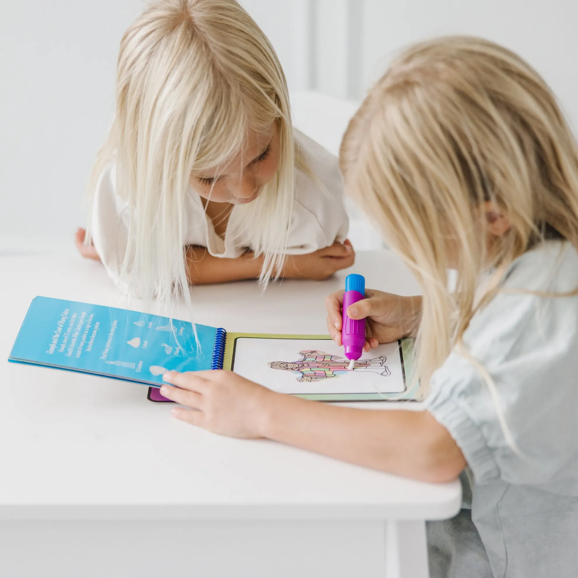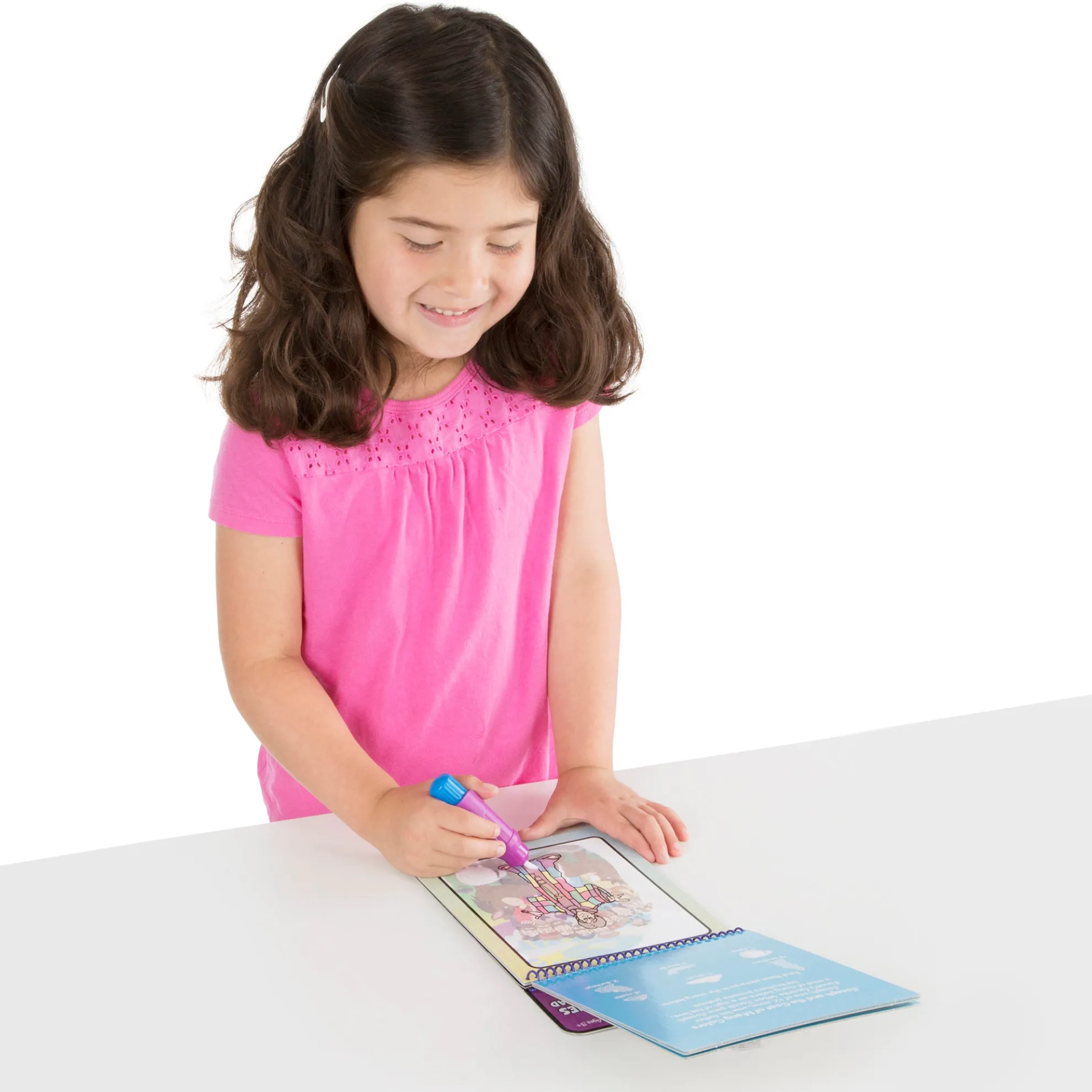 - Reusable pages are white with simple line drawings when dry; reveal colors when wet