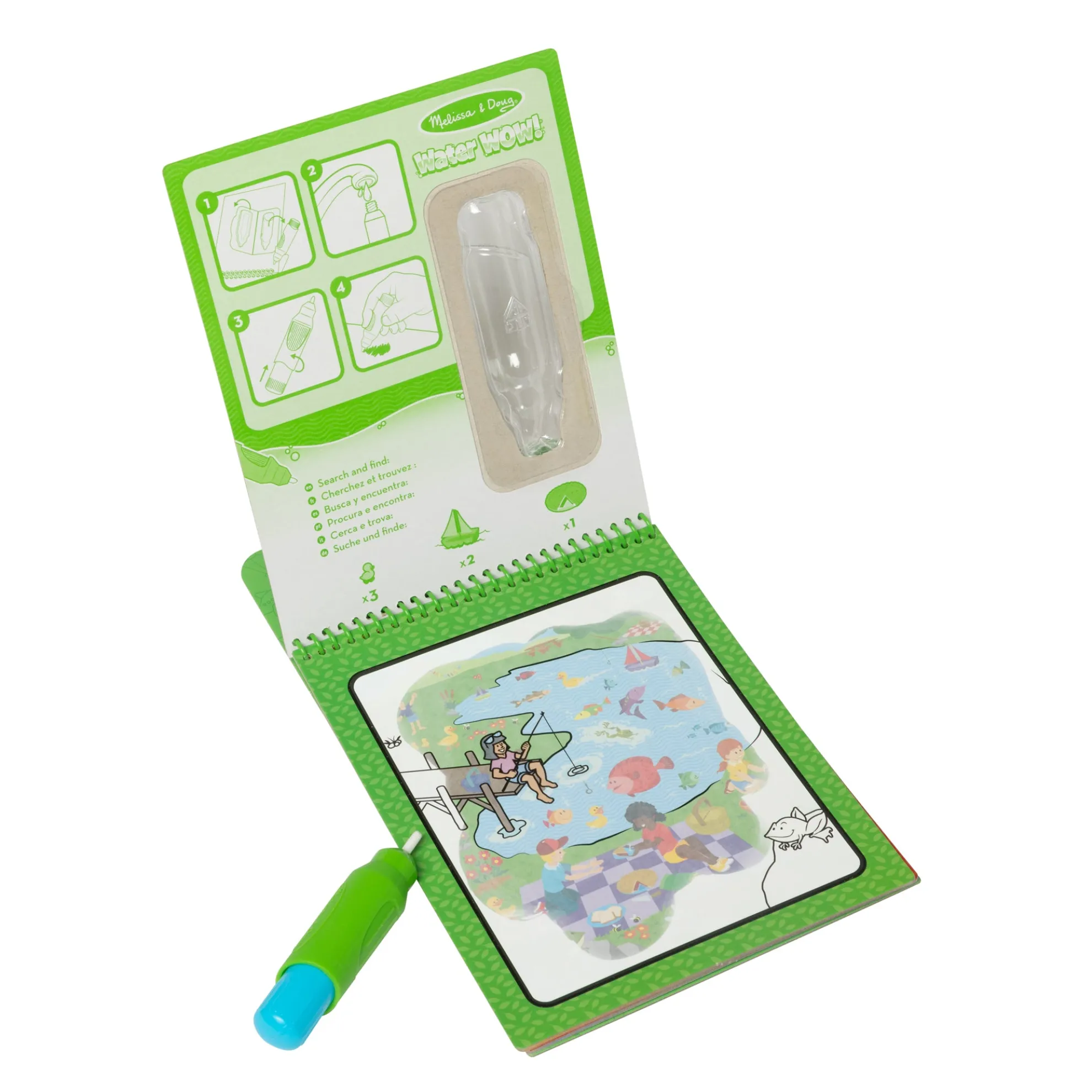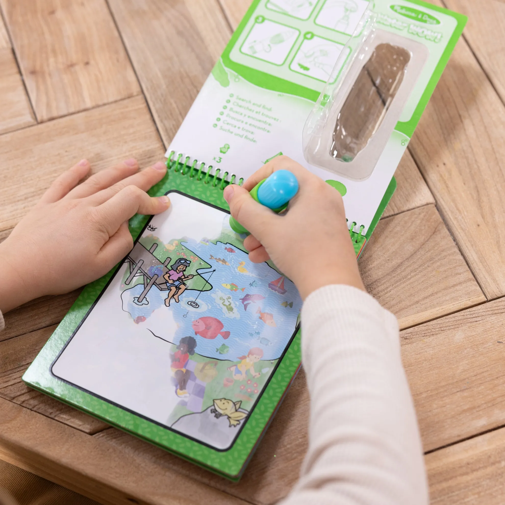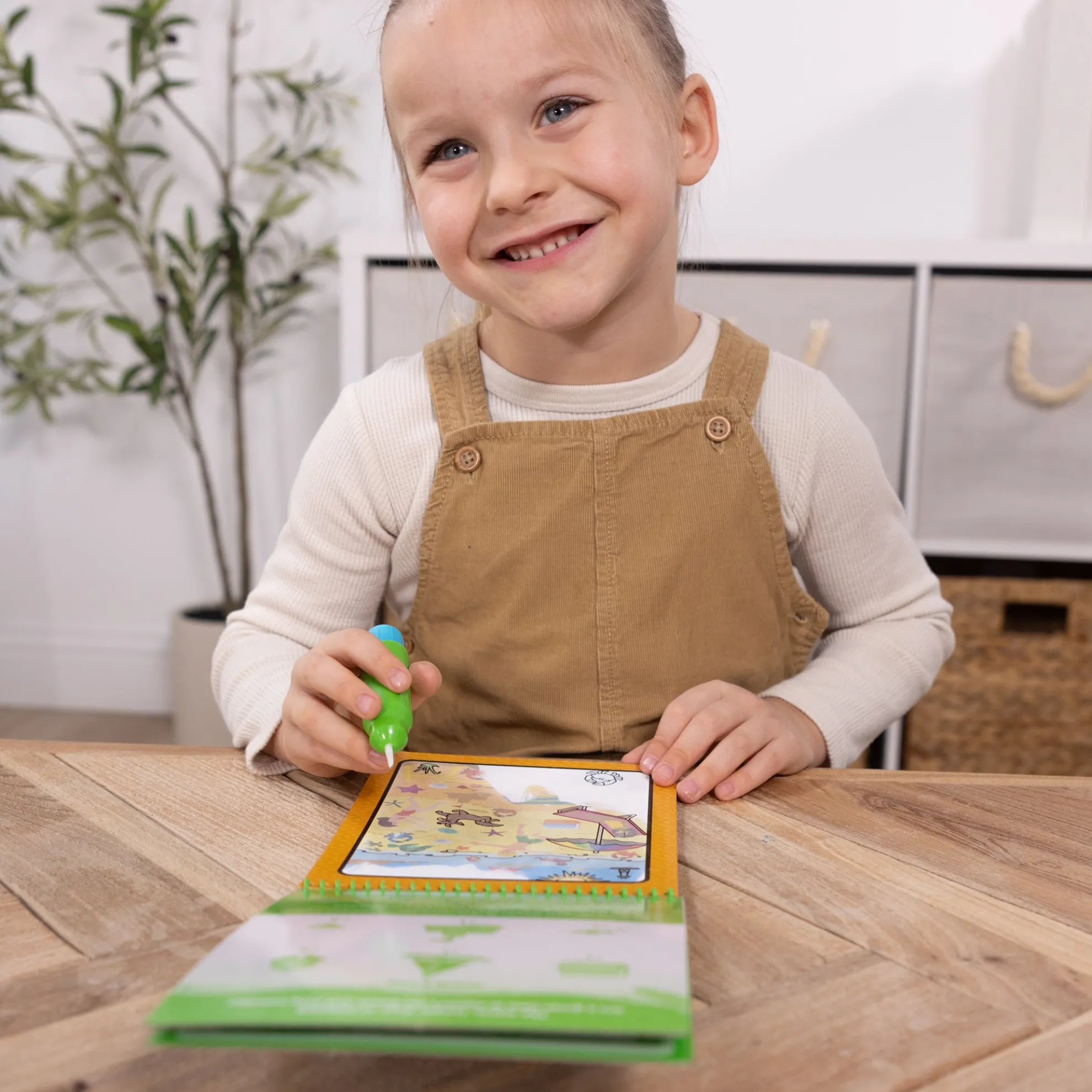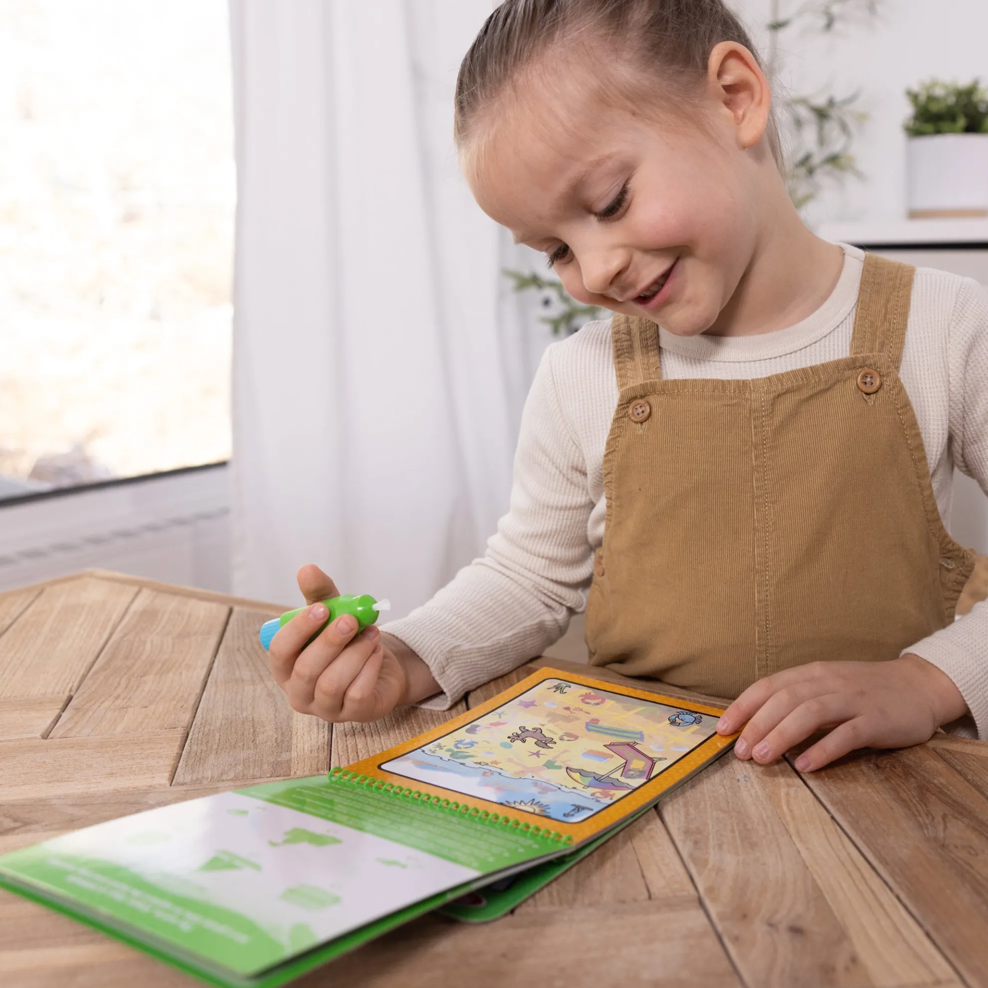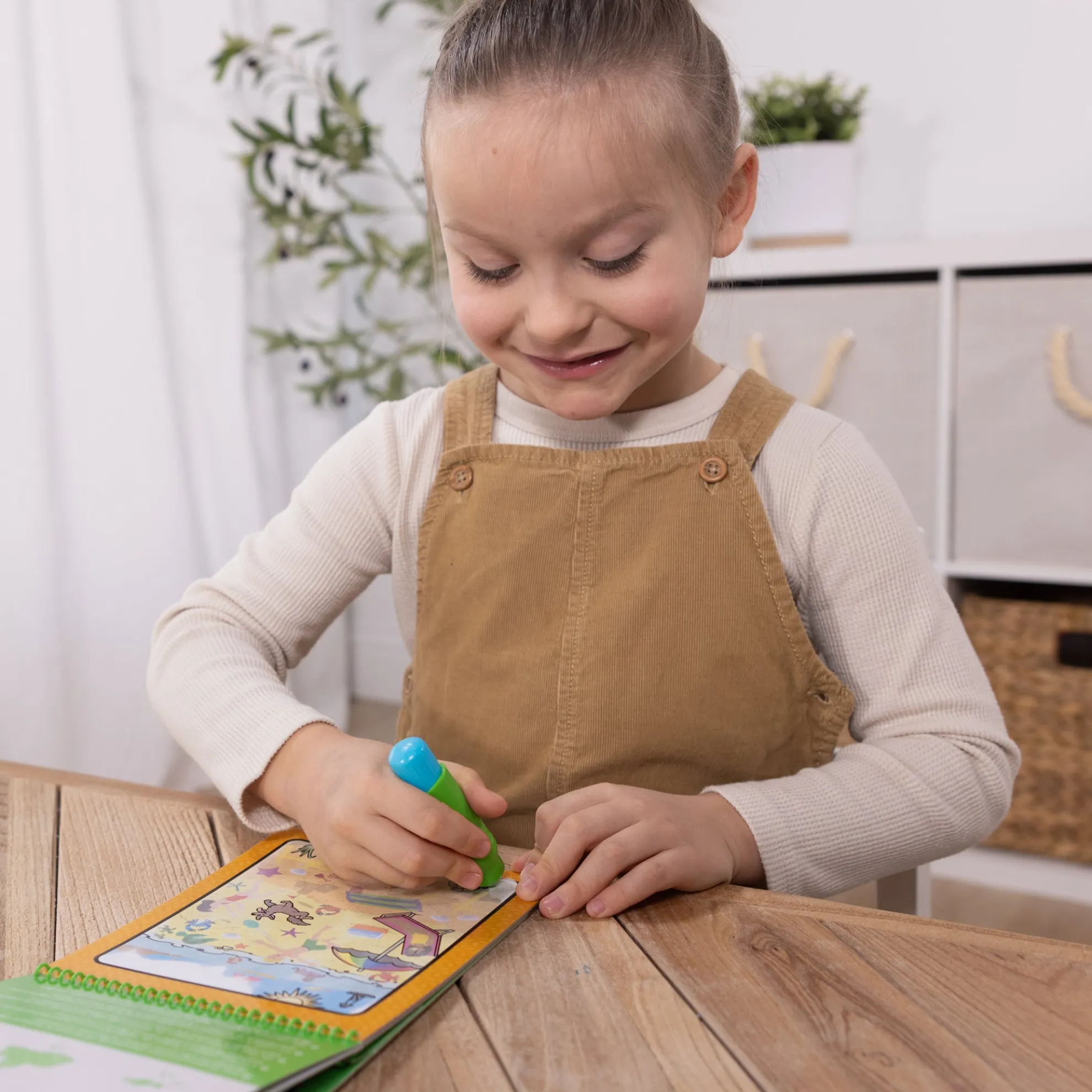 No-mess Water WOW! painting for kids! This exciting paint-with-water coloring book includes four reusable pages and a refillable water pen. Use the pen to color in each scene — details, and vibrant colors appear with every stroke! Let the page dry to erase the pictures and color it in again and again. This seasons-themed spiral-bound book includes four scenes to color (winter, spring, summer, and autumn), and search-and-find activities for each scene. The chunky-sized water pen is easy to hold and stores neatly right in the front cover, making this scented Water WOW! an ideal travel activity book and travel toy for kids!