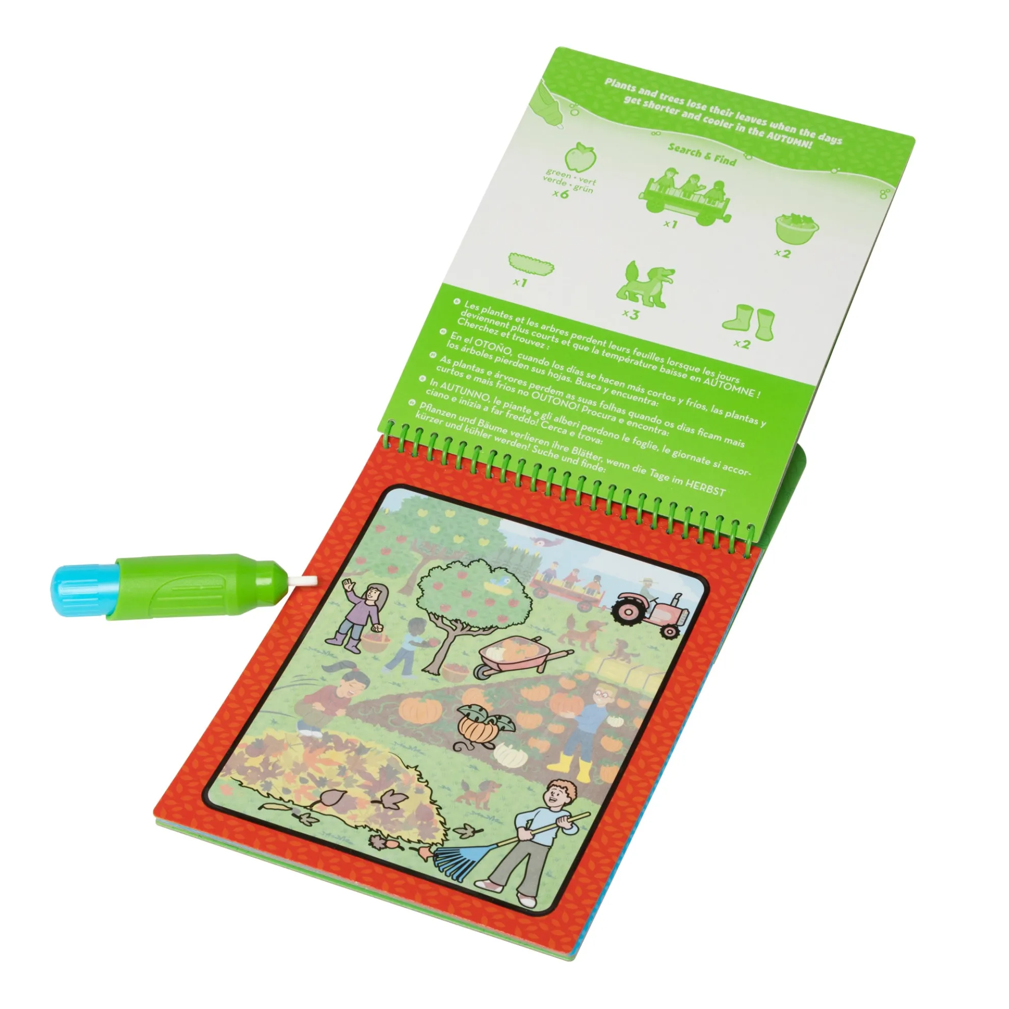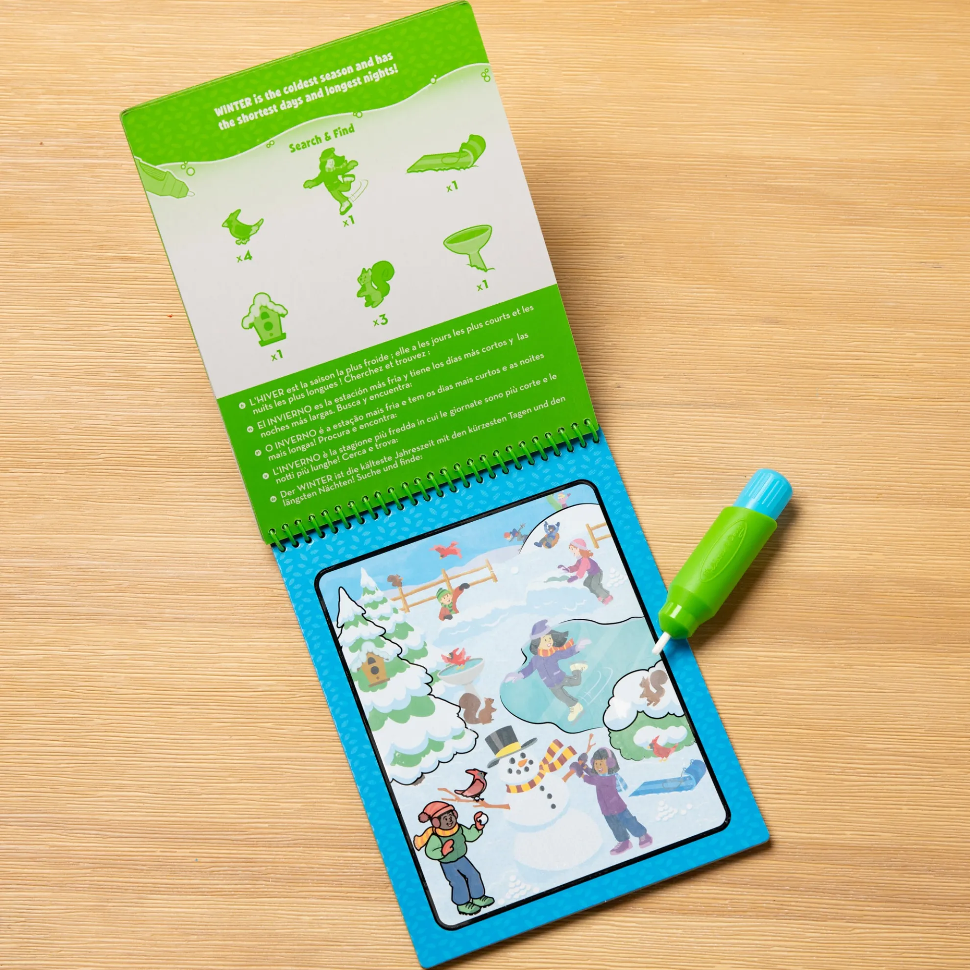 - 4 spiral-bound seasons-themed coloring boards (winter, spring, summer, fall) and a refillable water pen