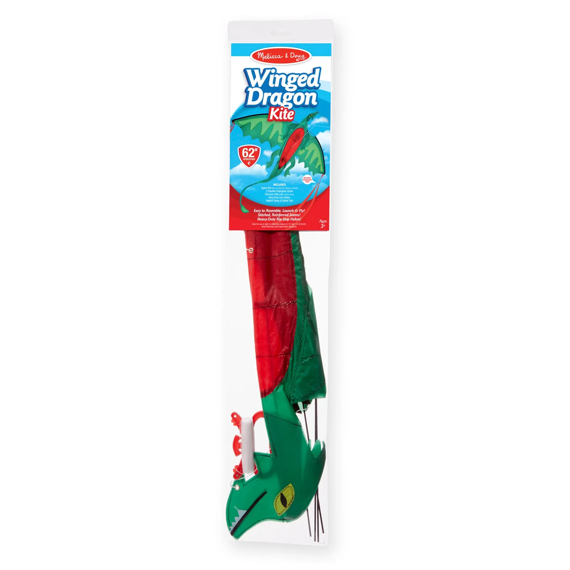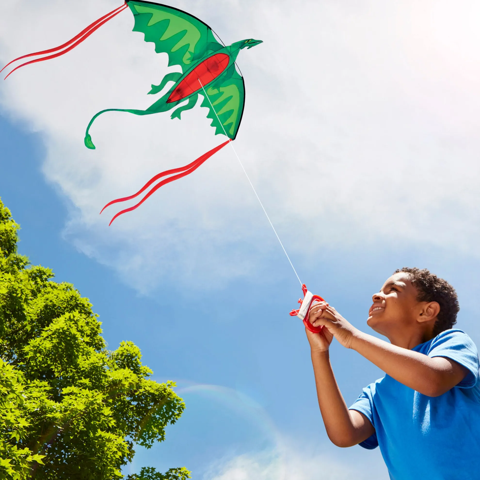 Let imagination and wonder take flight! This giant, colorful, dragon-shaped kite with an impressive 62-inch wingspan is easy to assemble, launch and fly. Stitched, reinforced seams, heavy duty rip-stop nylon, and flexible fiberglass struts help the kite hold up to countless hours of flying time. Eye-catching streaming tails add to the dramatic sight of this beautiful kite in the air! The kite comes with 164 feet of strong, premium kite line on an easy-grip line holder for added control, and helpful flying and safety tips.