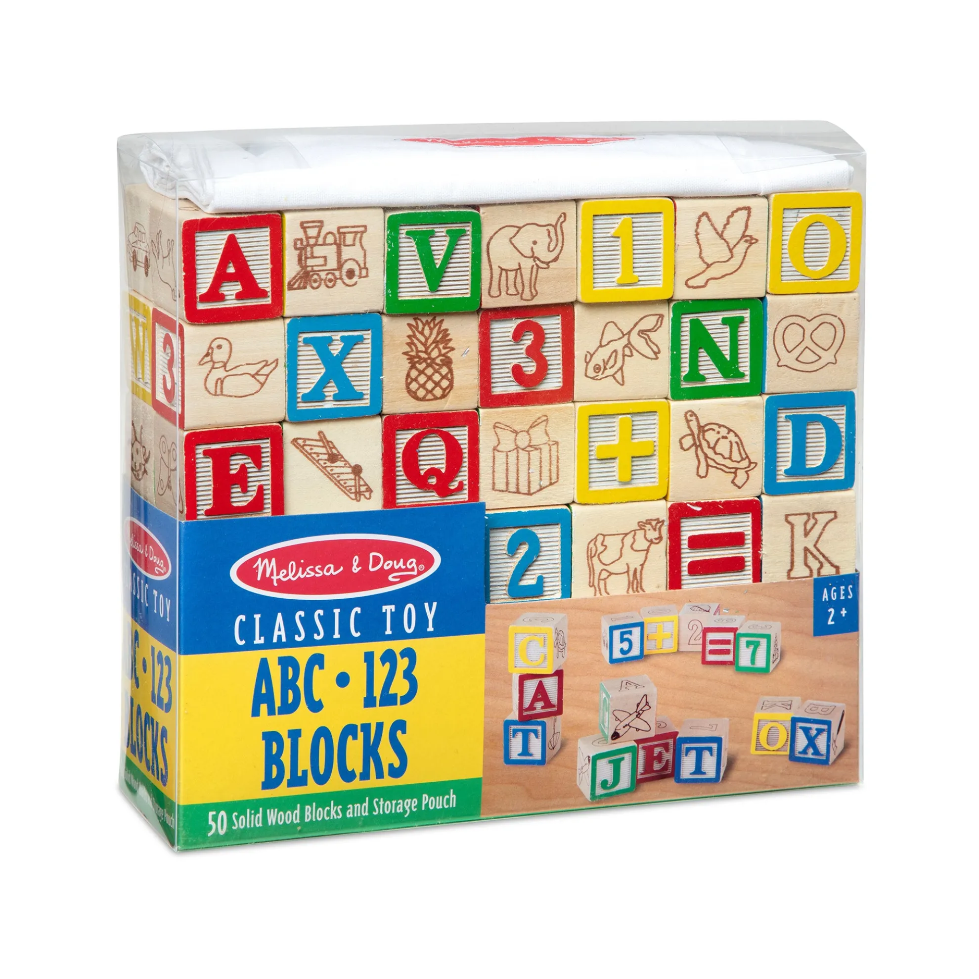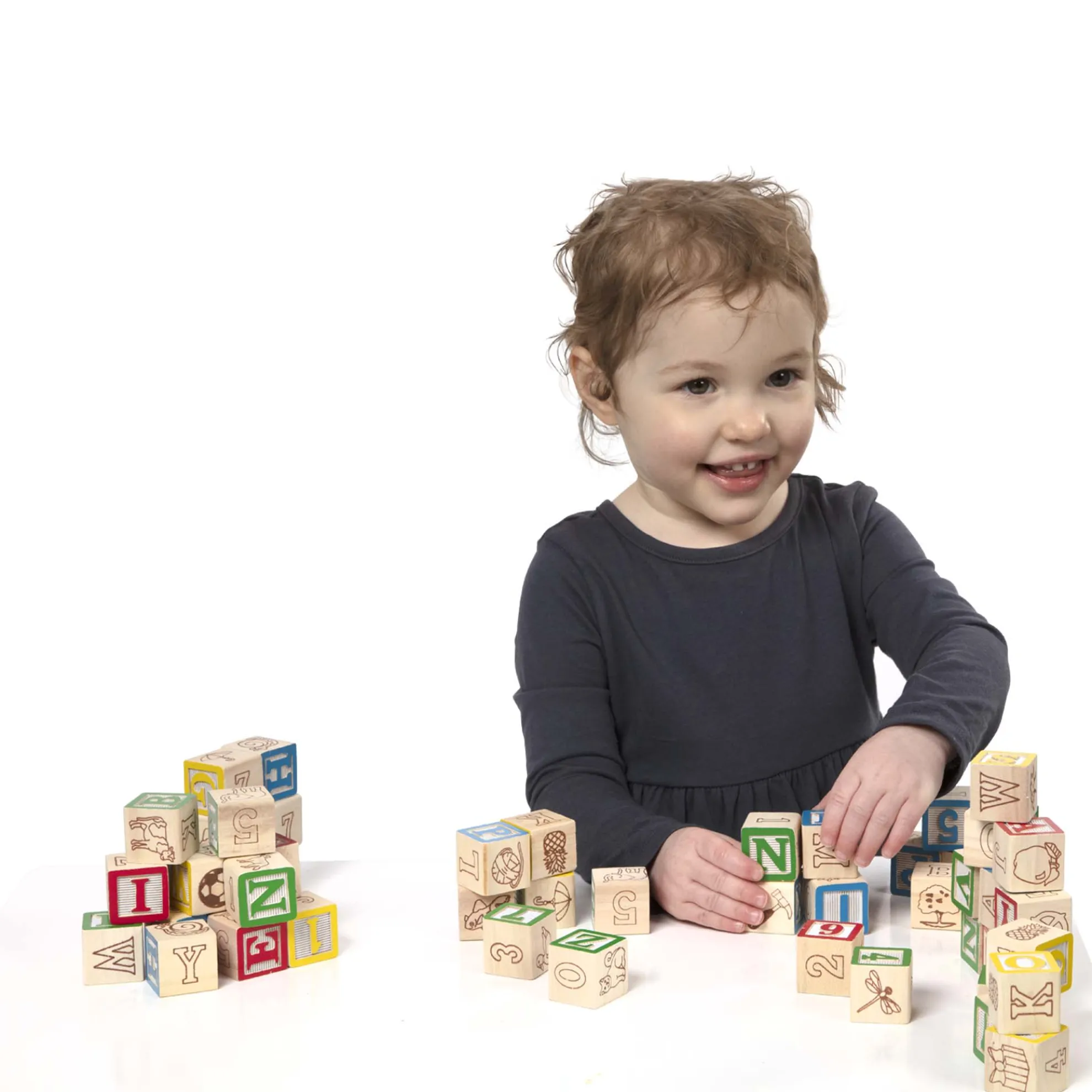 Hours of timeless block play await your toddler! This wonderful set of 50 traditionally styled one-inch alphabet blocks features charming hand-painted artwork. Solid wood blocks with a colorful collection of pictures, letters and numbers encourage matching, stacking, sequencing and sorting. A tremendous value that will last for years! Conveniently stores in an included pouch.