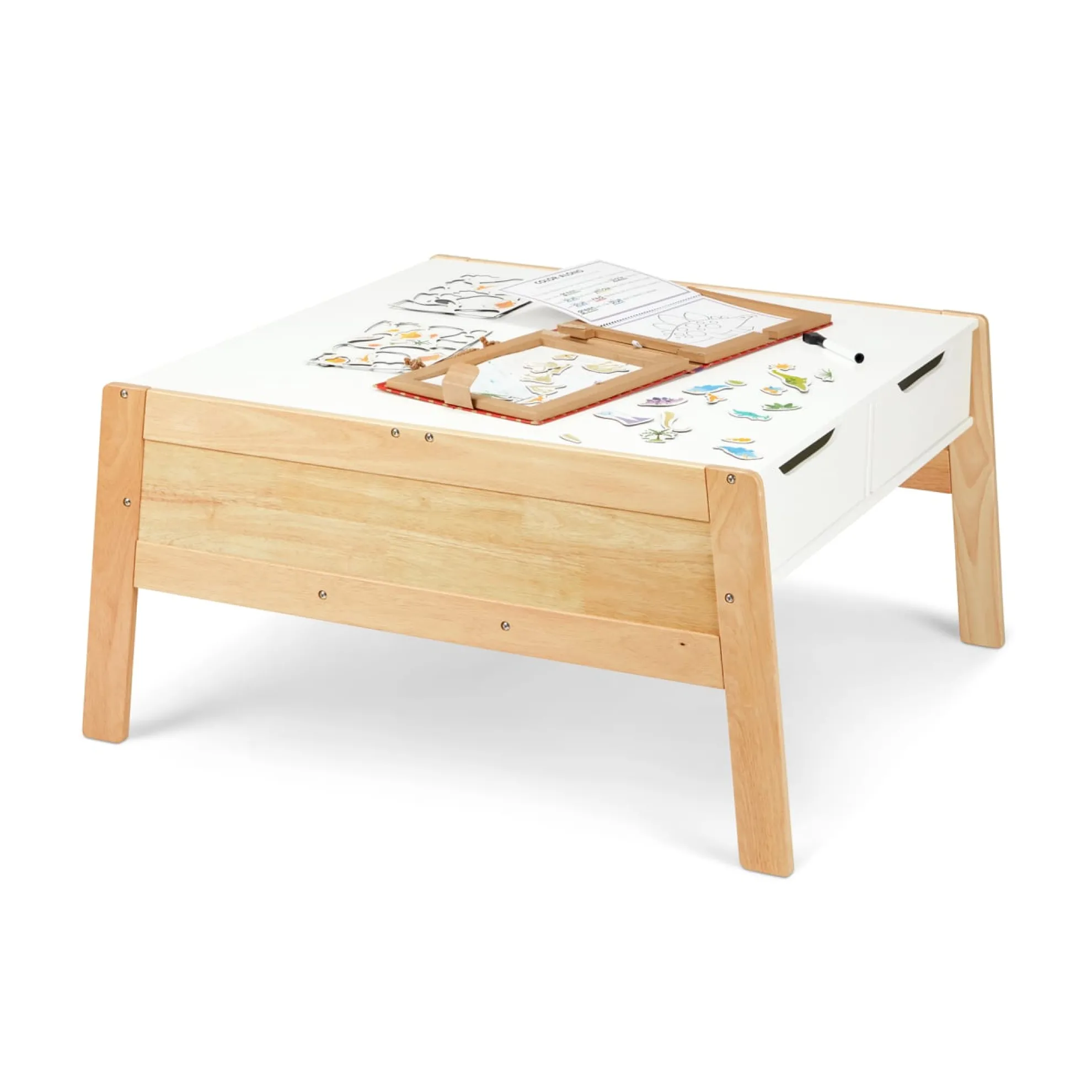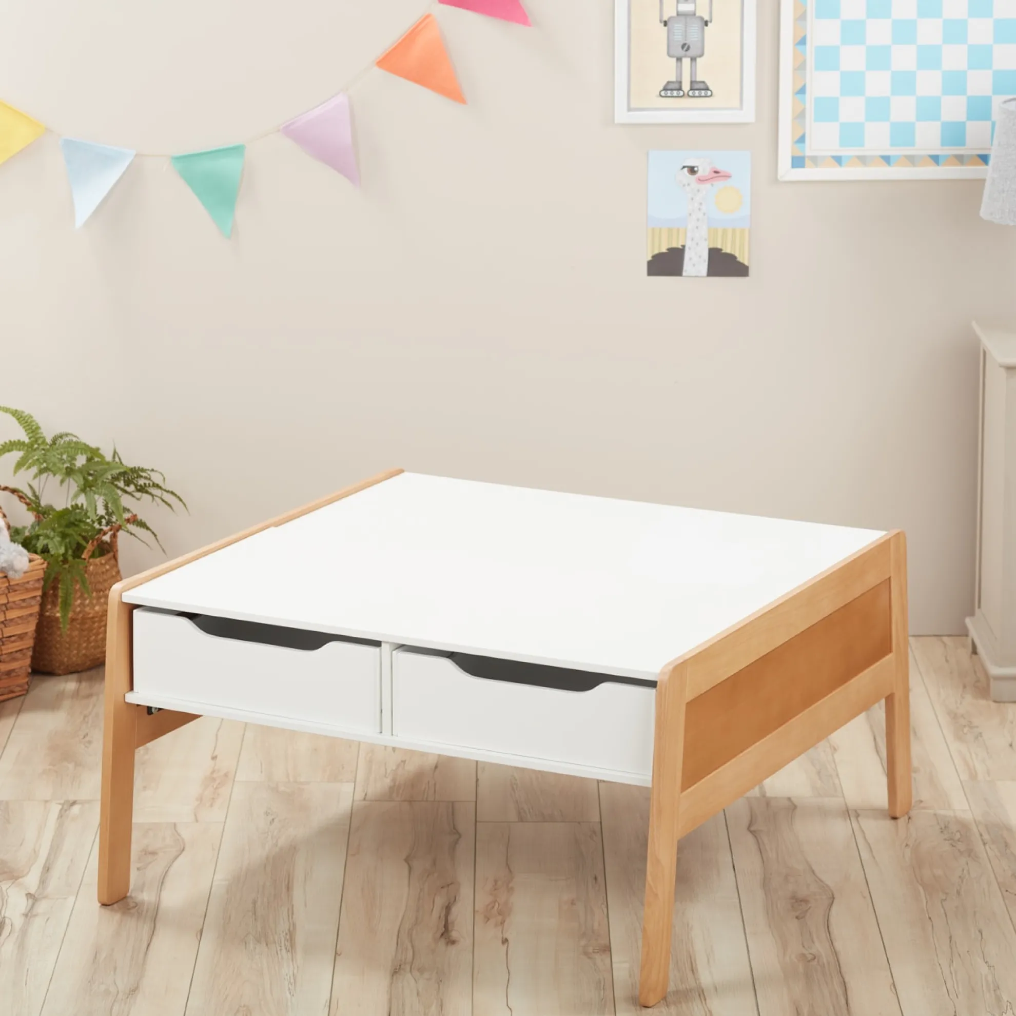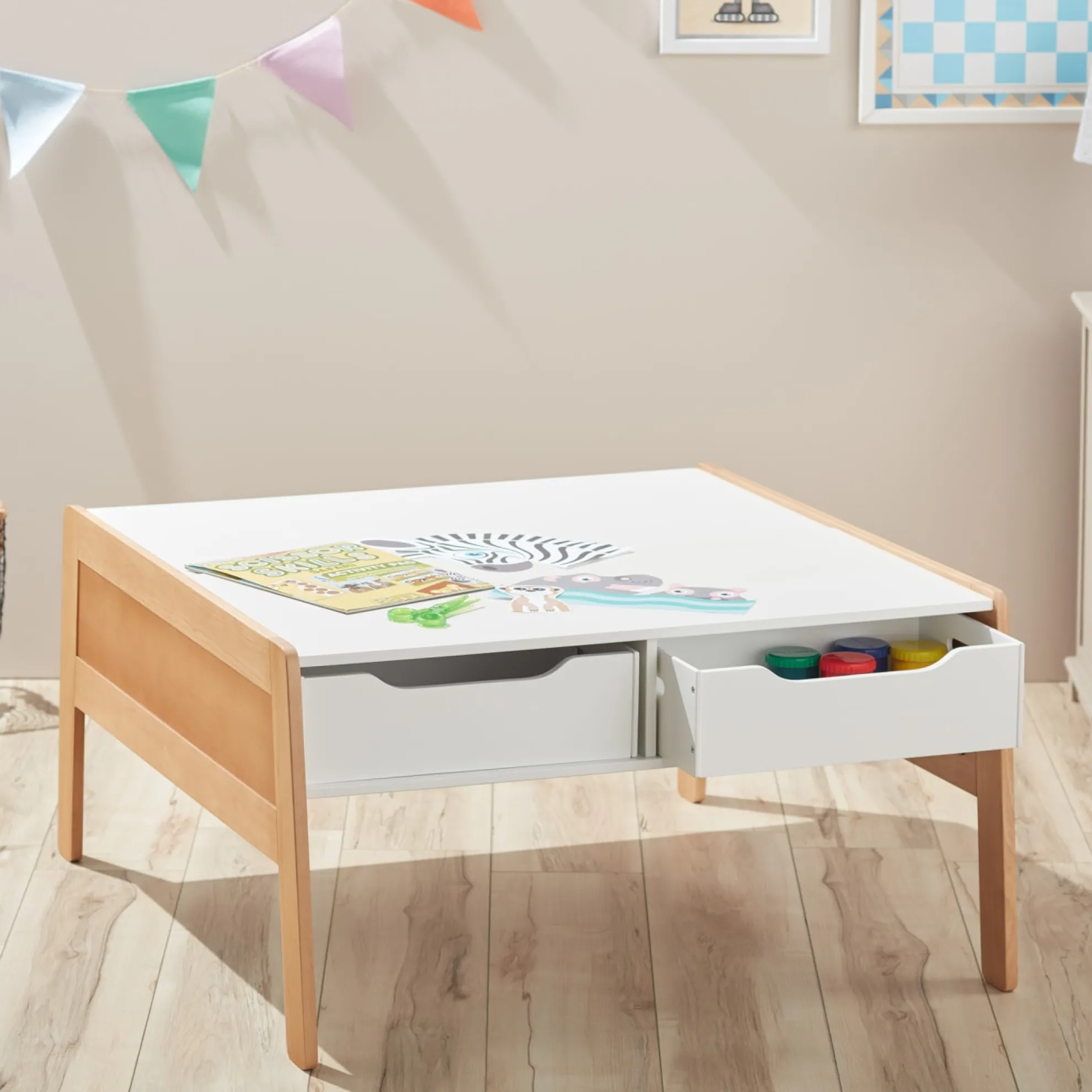 Give kids their own space to play and create! This beautifully designed sturdy wooden activity table includes four roomy wooden bins that slide under the 32.5-inch by 35.75-inch tabletop like drawers for quick and easy storage of art supplies, trains, toys, and games. The table stands 17.25 inches high, sized just right for kids three to eight years old to either stand, kneel or sit. The two-tone finish (white tabletop and drawers and natural light wood sides and legs) fits with any home decor and wipes clean to stay looking crisp and clean. This versatile activity table is easy to put together with just a Phillips-head screwdriver (not included), and incredibly sturdy once assembled.